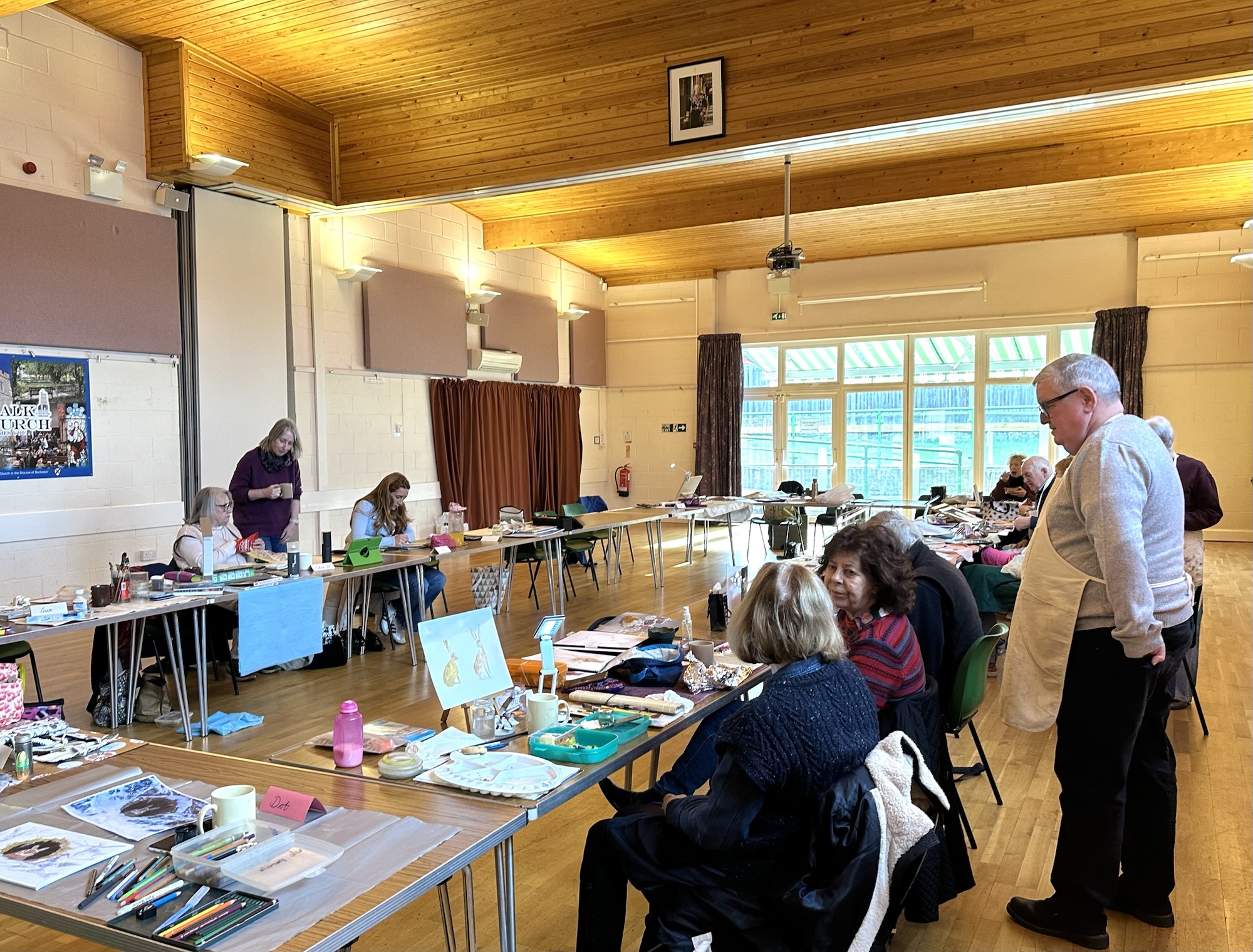 If you don’t want to attend a workshop you have already paid for the hall hire in your subs. You are therefore welcome to sit and paint quietly at the kitchen end of the hall whilst the workshop session takes place towards the window end of the hall.