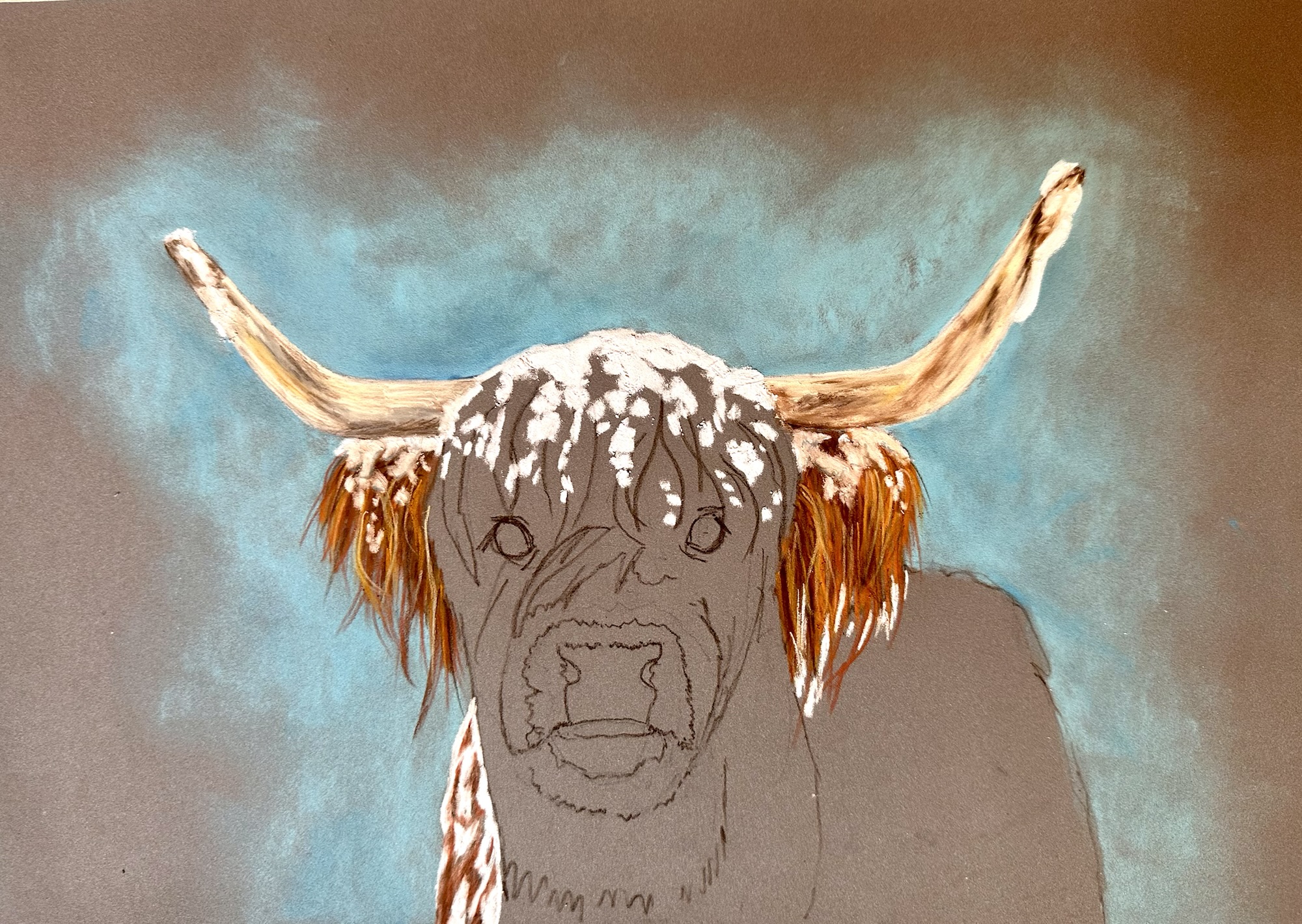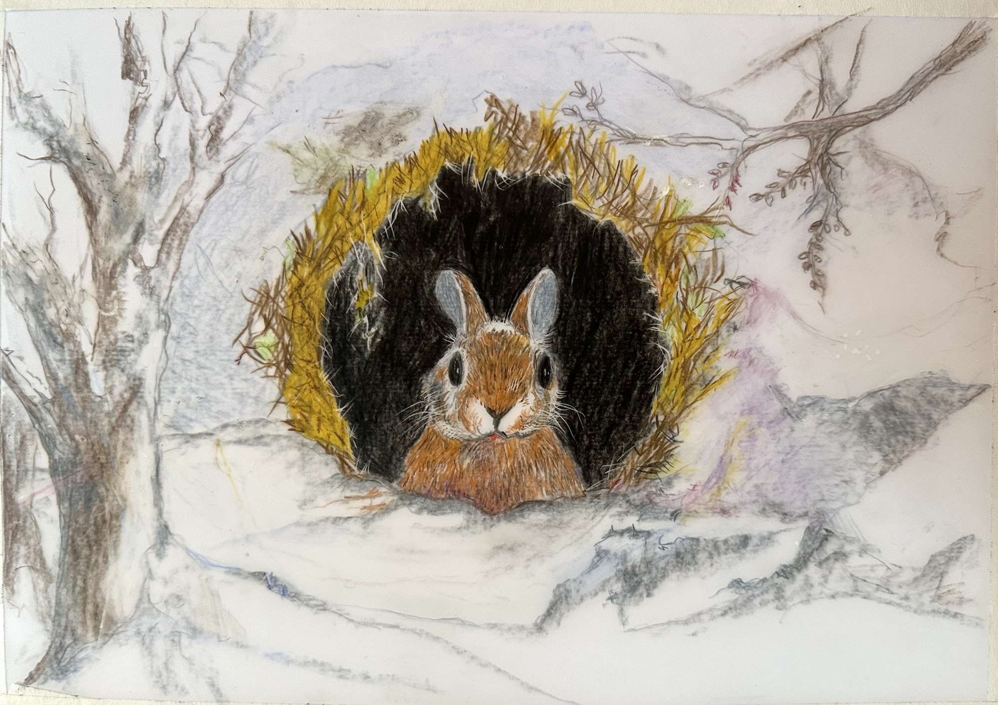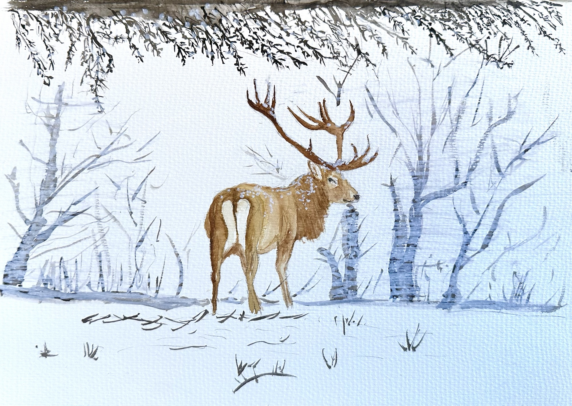 The suggested subject of ‘Animals in Winter’ was a popular one and several artists produced two pictures during the day. There were squirrels, highland cattle, foxes, squirrels, deer, birds, puffins, a snow leopard, hares, butterflies, a rabbit, ladybirds, a dormouse and robins. Several different mediums were used, such as watercolours, soft pastels, graphite pencils, acrylics, coloured pencils and inks. Some pictures are finished and others are works in progress, such as a landscape waiting for the animal to be added. The last 5 pictures were created at another art group but are of the same subject.