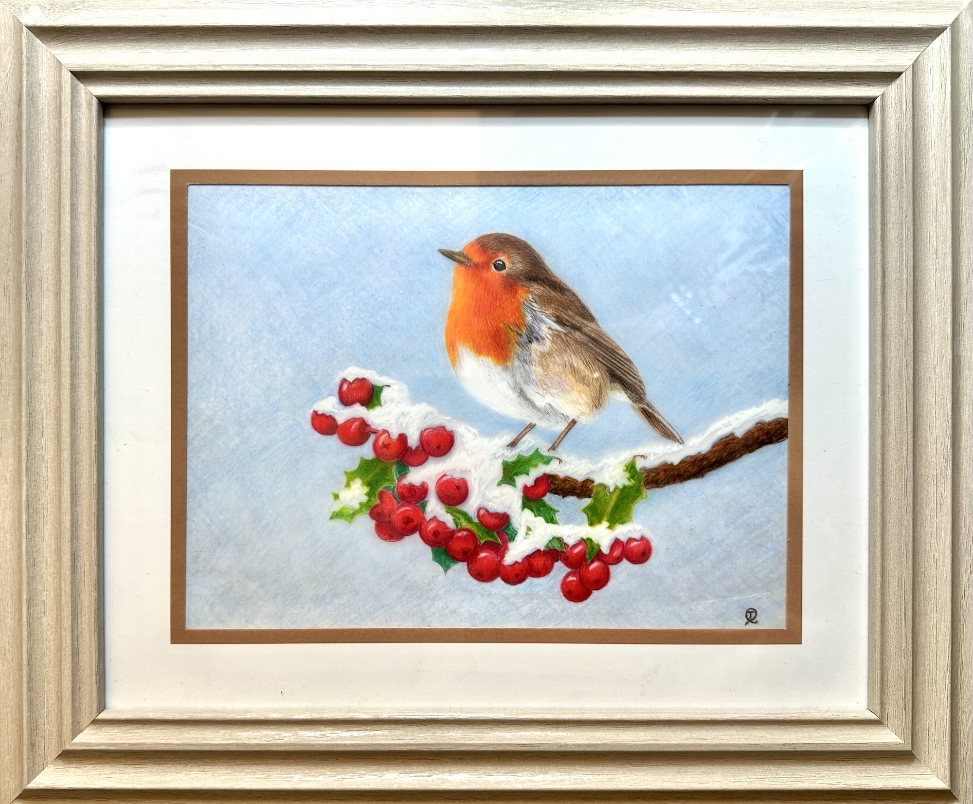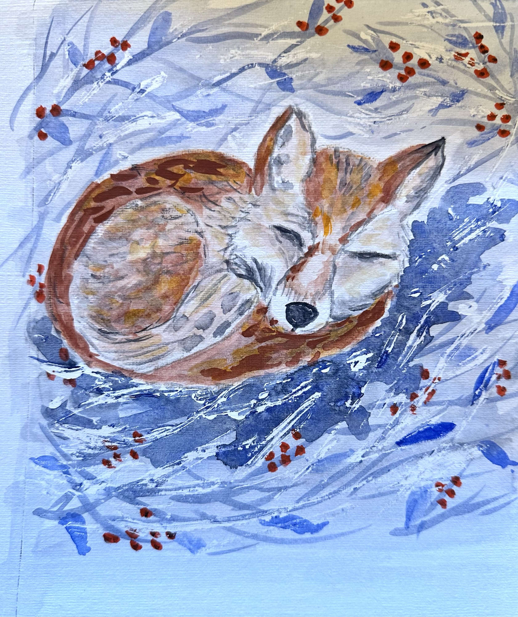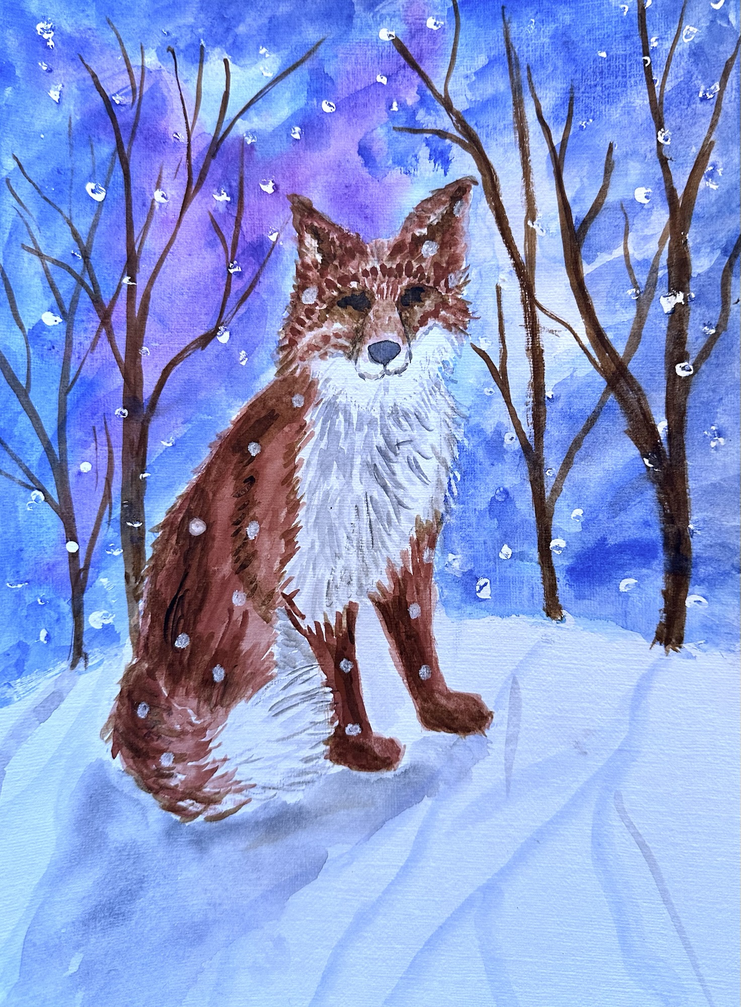 The suggested subject of ‘Animals in Winter’ was a popular one and several artists produced two pictures during the day. There were squirrels, highland cattle, foxes, squirrels, deer, birds, puffins, a snow leopard, hares, butterflies, a rabbit, ladybirds, a dormouse and robins. Several different mediums were used, such as watercolours, soft pastels, graphite pencils, acrylics, coloured pencils and inks. Some pictures are finished and others are works in progress, such as a landscape waiting for the animal to be added. The last 5 pictures were created at another art group but are of the same subject.