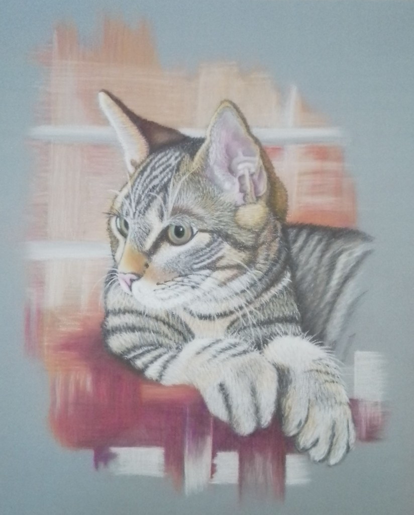 Sandra has completed her pastel picture of a very cute, fluffy kitten. It looks good against the warmly coloured background and the tiny hairs must have taken hours to draw with many different pastel pencils. Well done, Sandra, it’s beautiful!