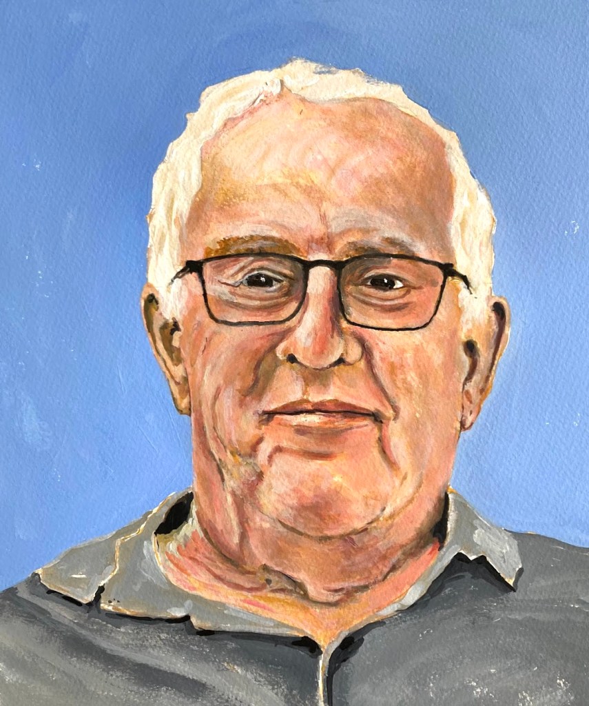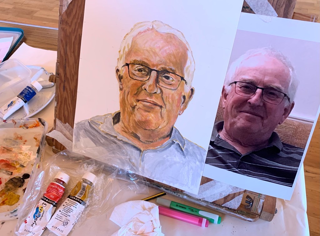 Steve’s self portrait is a bold likeness and true to life with very good skin tones. There are yellows, pinks, browns and blues in the skin colour, which all add interest to his painting. It took about 5 hours and is acrylic on Bockingford watercolour paper.