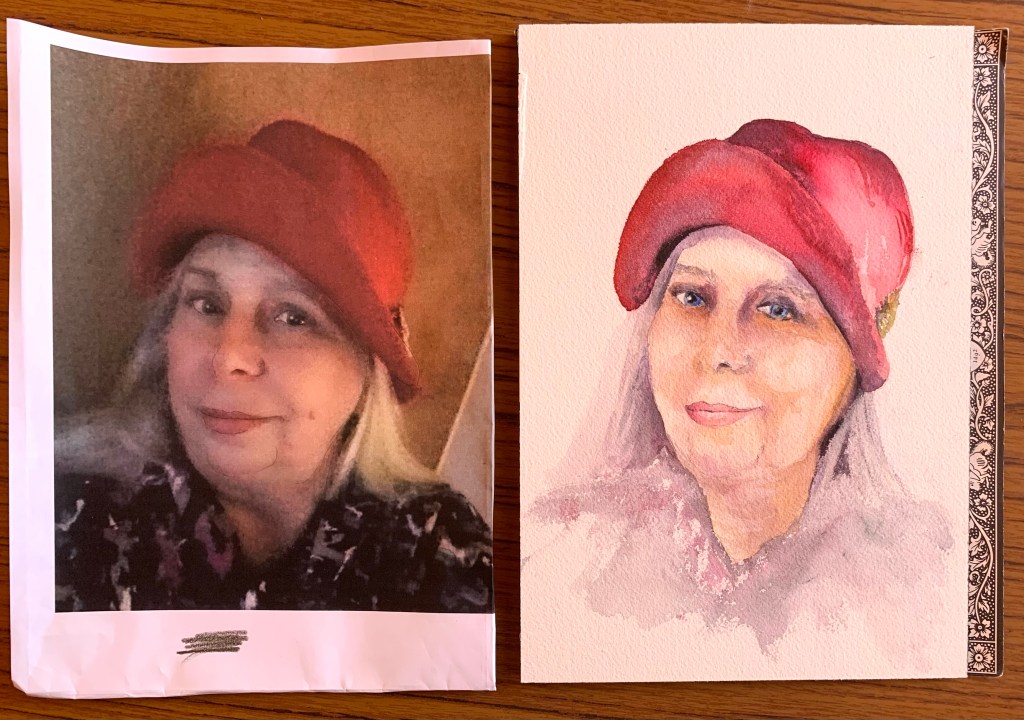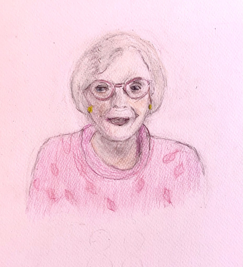 Doreen drew her self portrait using coloured pencils, using a photo as reference. You can see how well Doreen got her likeness. It’s super work as we can see instantly that it is her.