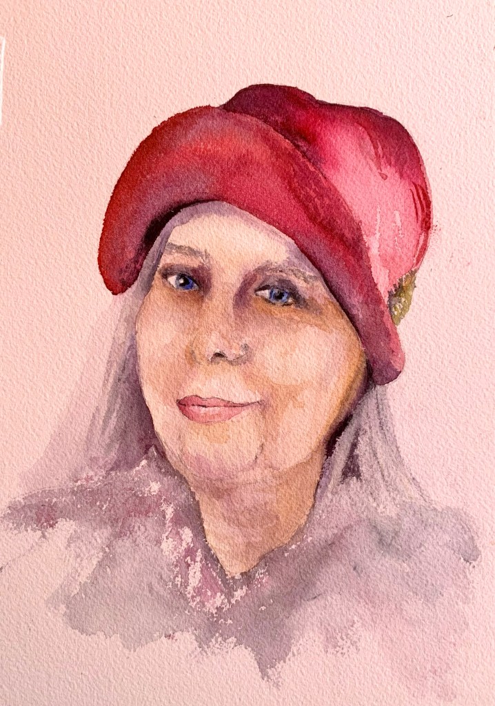 Cynthia painted her likeness with watercolours. With her bright red hat Cynthia makes her portrait immediately an explosion of colour and by emphasising her eyes she draws our gaze directly to hers. It’s beautifully painted.