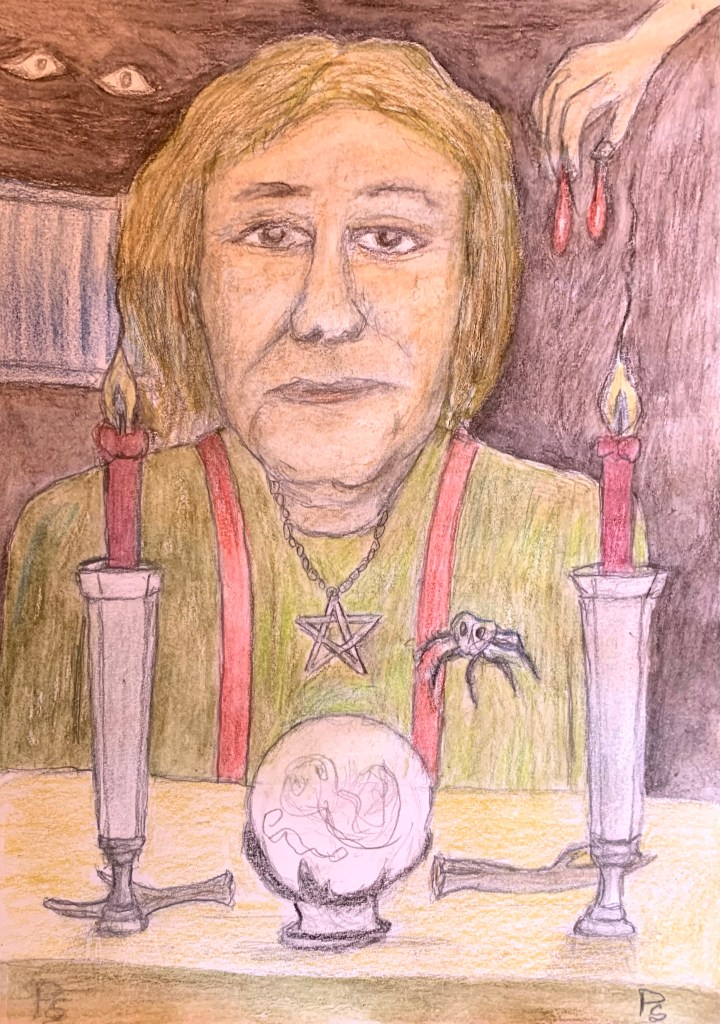 Patrick’s self portrait is the most mysterious of all. Created using his favourite medium of coloured pencils, Patrick stares straight out of the picture, but as our eyes wander around the picture we see several images that make us wonder about them. A full explanation of all these images is needed, Patrick!