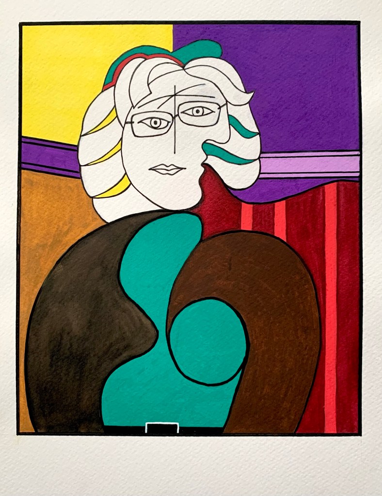Tracy has long admired Pablo Picasso’s paintings so decided to paint herself in an abstract way, based on Picasso’s 1931 portrait of his mistress Marie-Thérèse Walter called ’The Red Armchair’. Tracy zoomed in on the face a little and tried to make the portrait look like her by adding her glasses and changing the hair. It took about 2 hours and is watercolour, Posca pens and marker pens on watercolour paper.