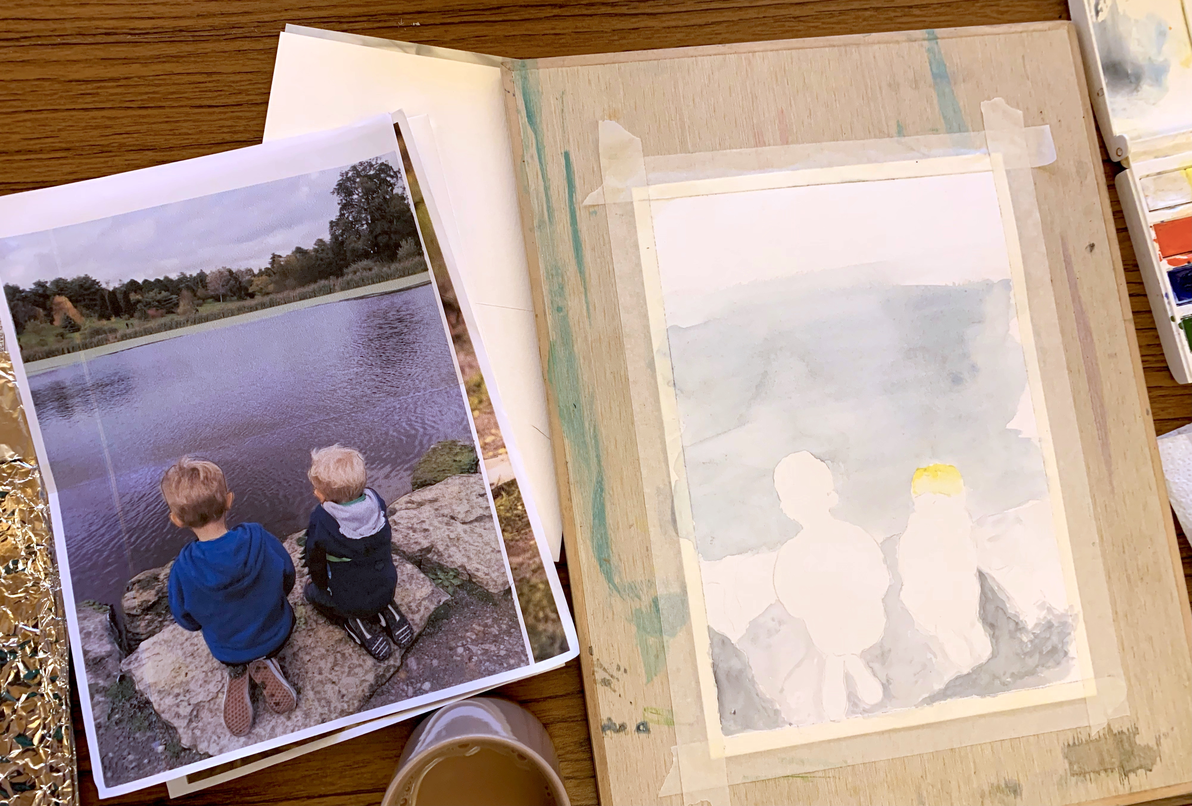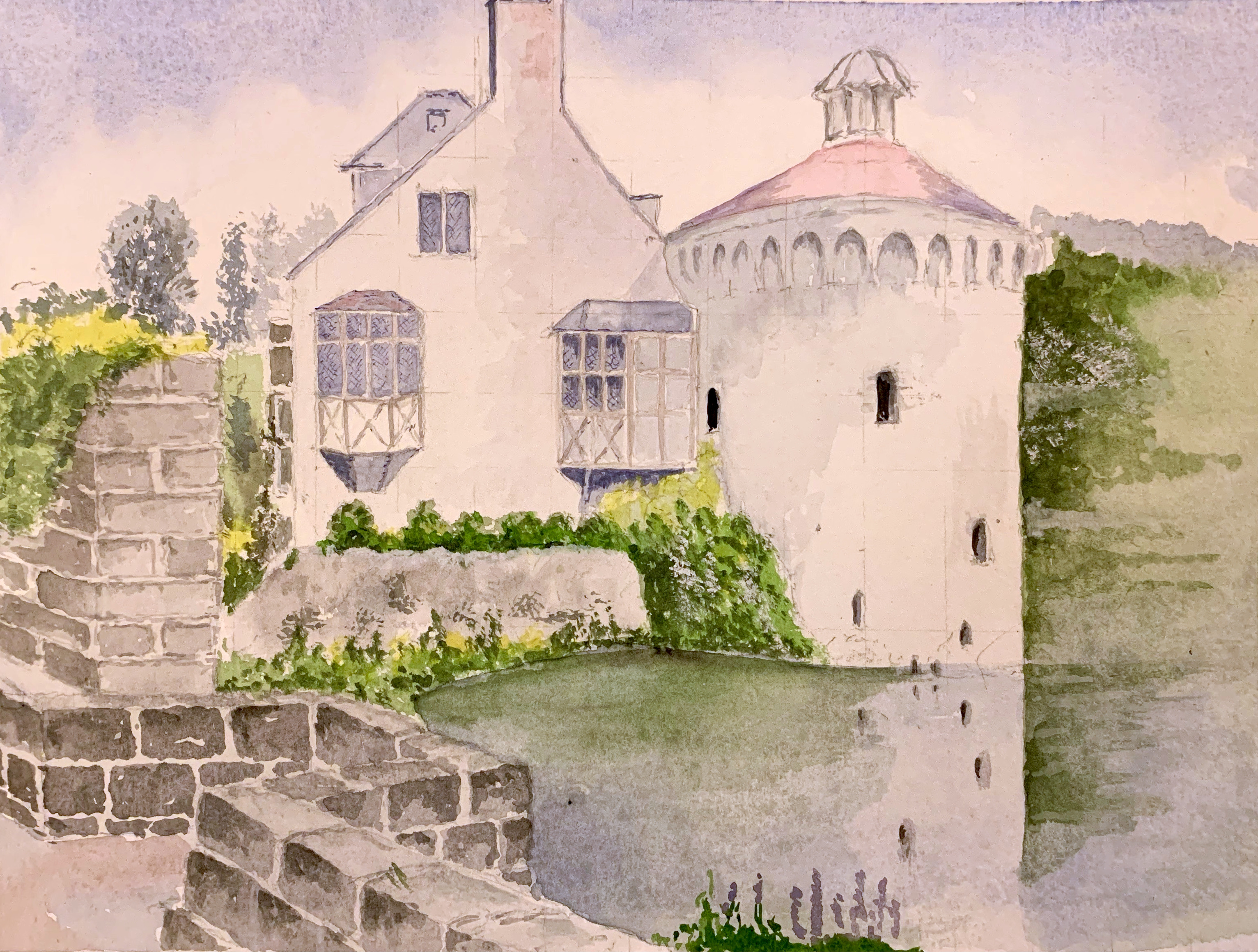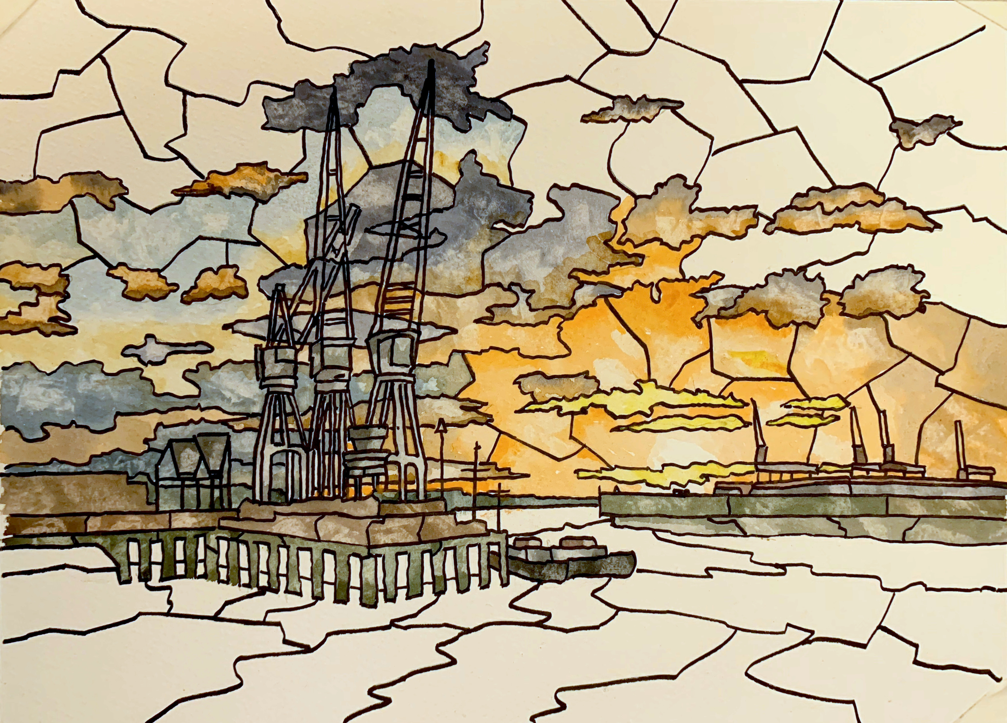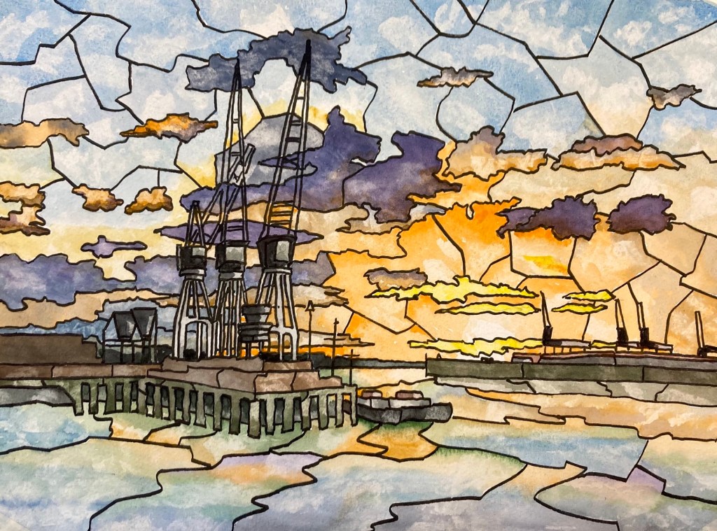 This painting is watercolour and ink on Bockingford watercolour paper. Inspired by a view Steve photographed looking west from Gravesend it’s an industrial scene and beautiful sunset with a little artistic licence. From monocrome to saturated colour, they’re super pictures, well done!