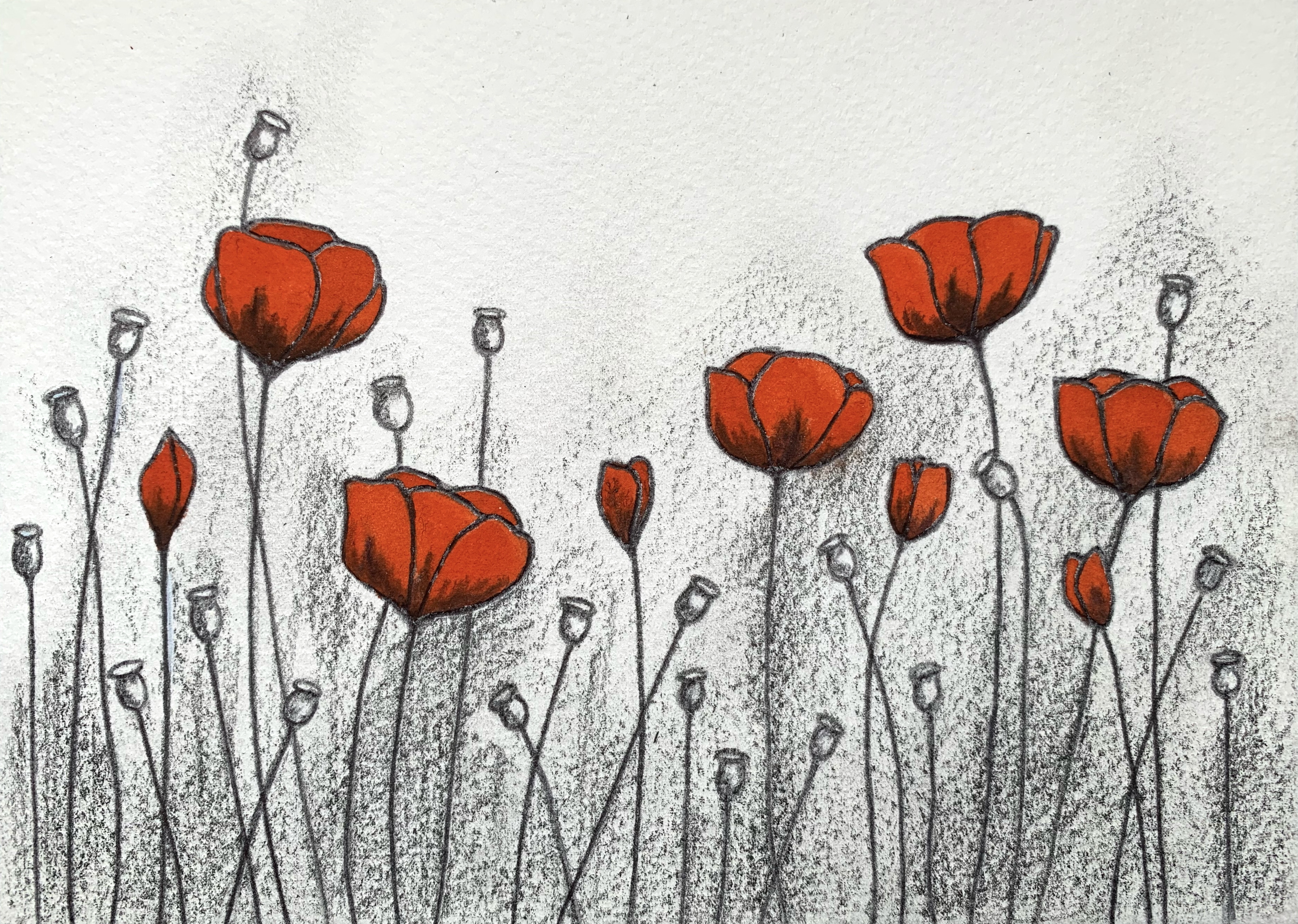 Here are Steve’s latest pictures which have now been finished. The first relates to November’s Remembrance theme as it shows soldiers going over the top of the trenches in WW1. With the smudged charcoal representing explosions it is very atmospheric. Created using charcoal on Mi-Teintes pastel paper.