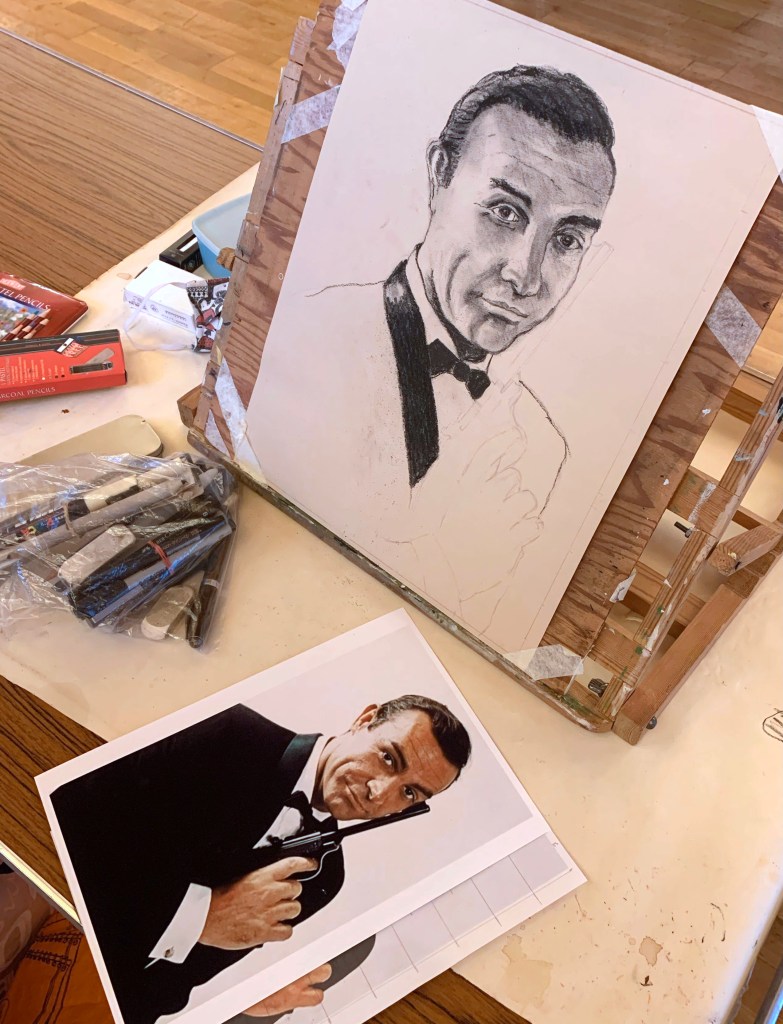 Steve used charcoal and white pastel on pastel paper for his image of Sean Connery. He used a grid to accurately draw Sean’s features and the charcoal and chalk is used sensitively to create the different skin tones of the face and hand. It’s a very good likeness, well done.