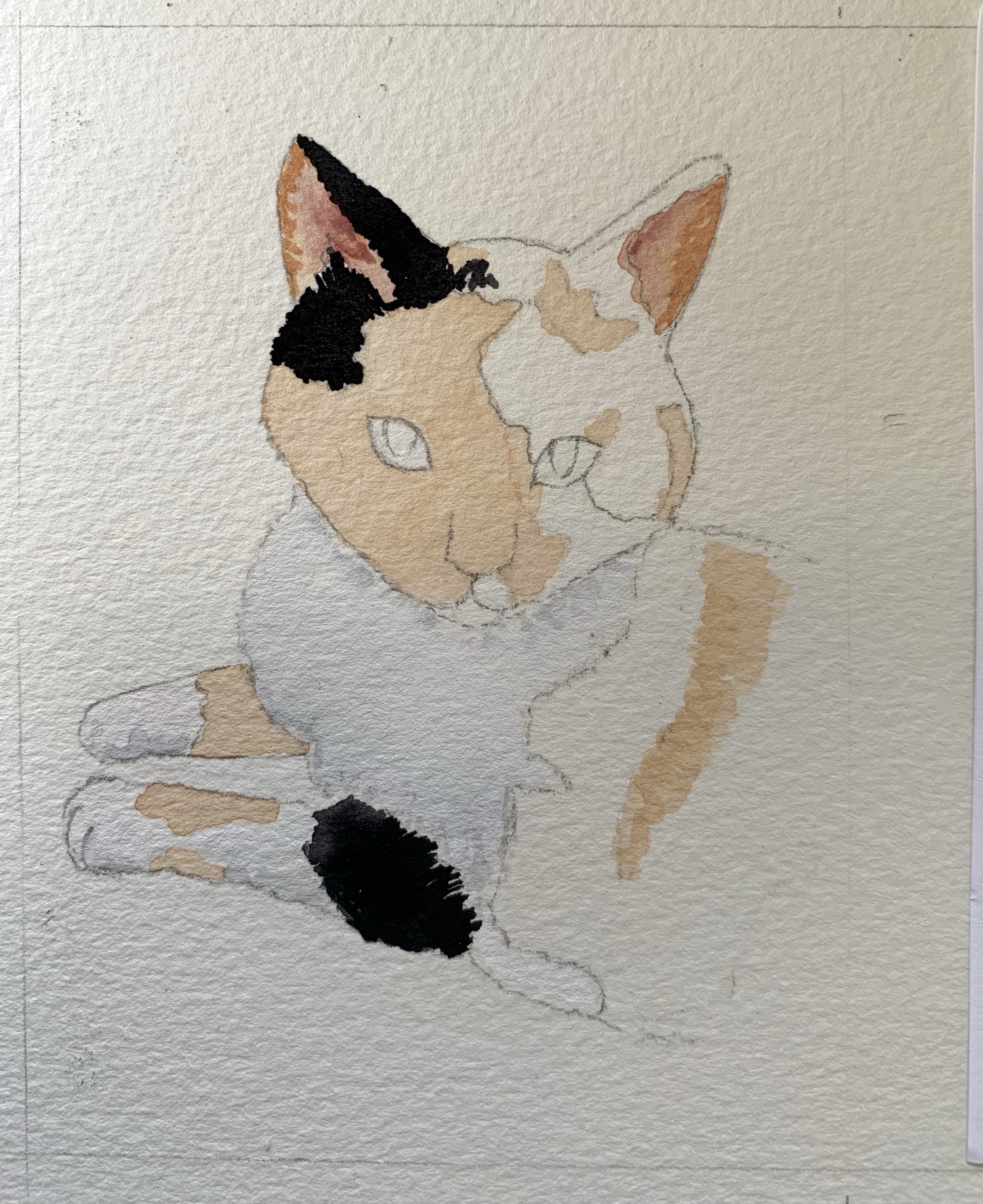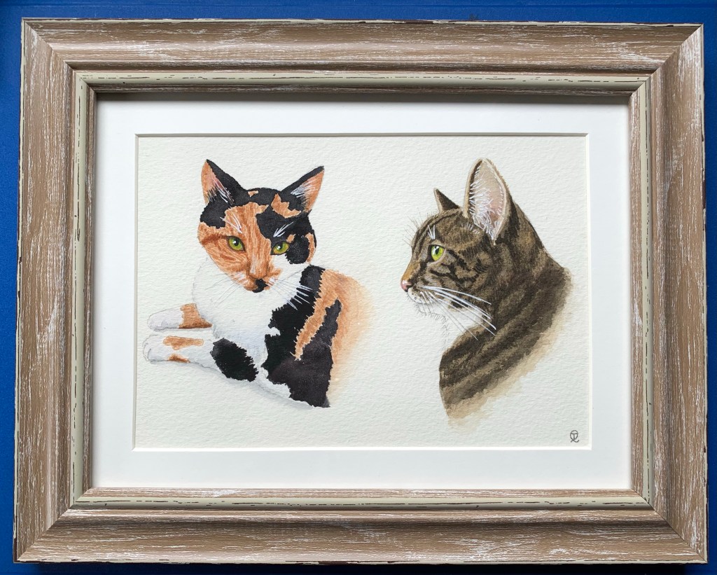 Watercolour on Saunders Waterford paper with 2 cats in a 8” x 6” aperture of the frame.