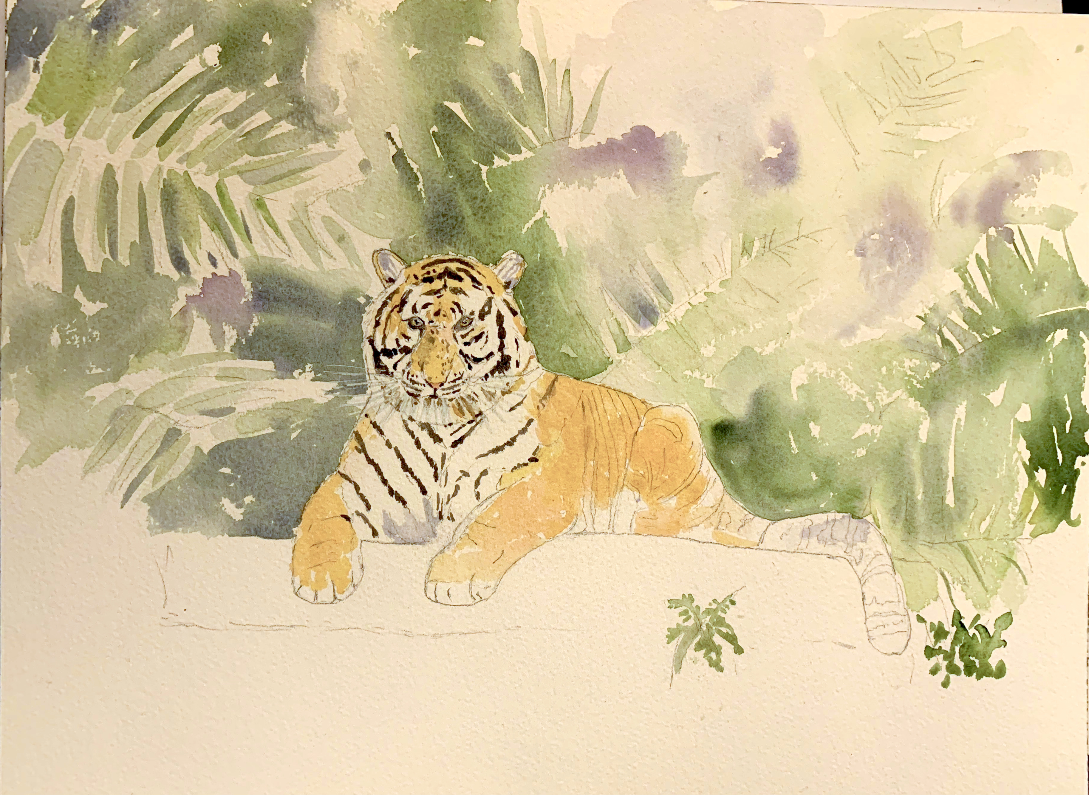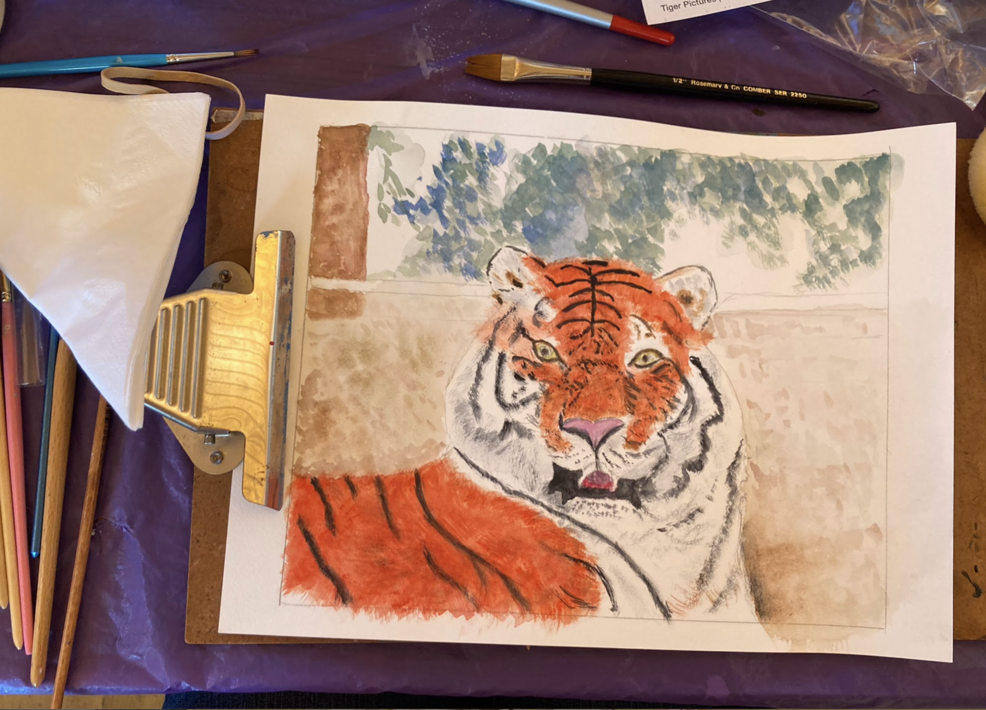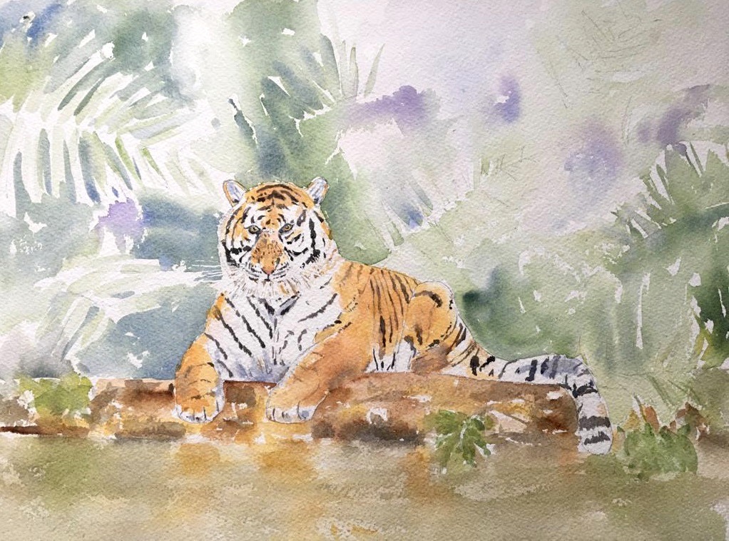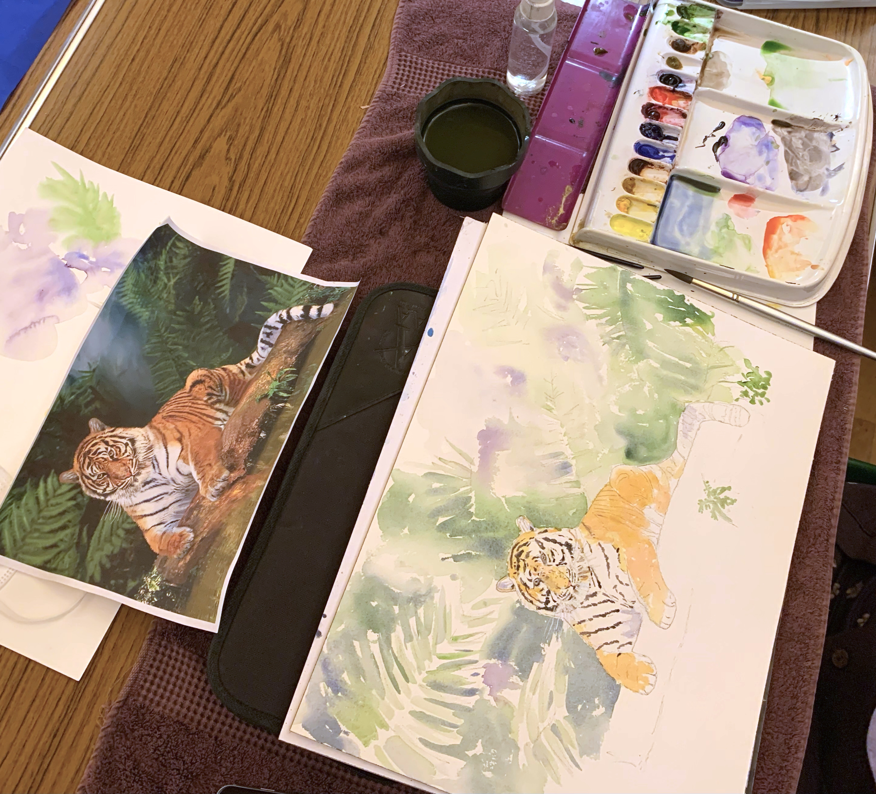 Susan started her tiger painting at the last session and has finished it at home. Using watercolours she painted the picture loose and light to avoid overworking him. The Pantone ‘Very Peri’ colour has been cleverly used in the shadows on the tiger’s chest and in the background too.