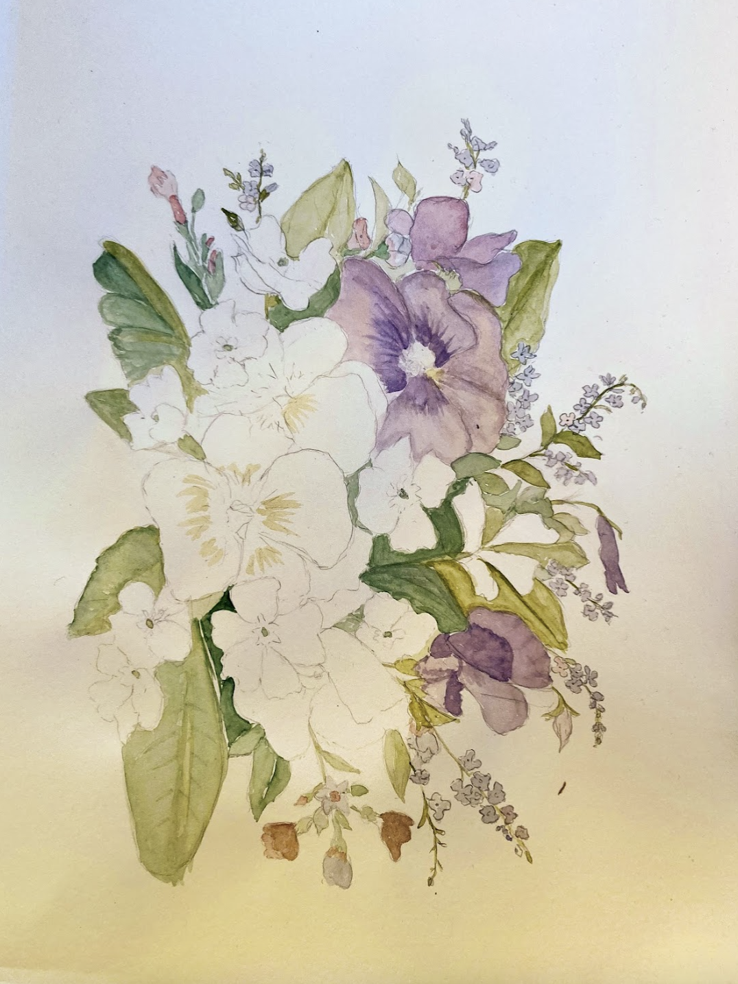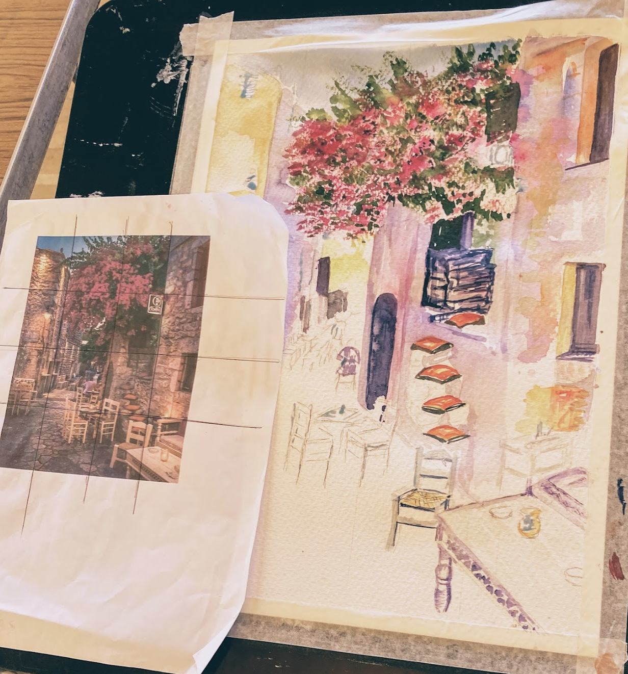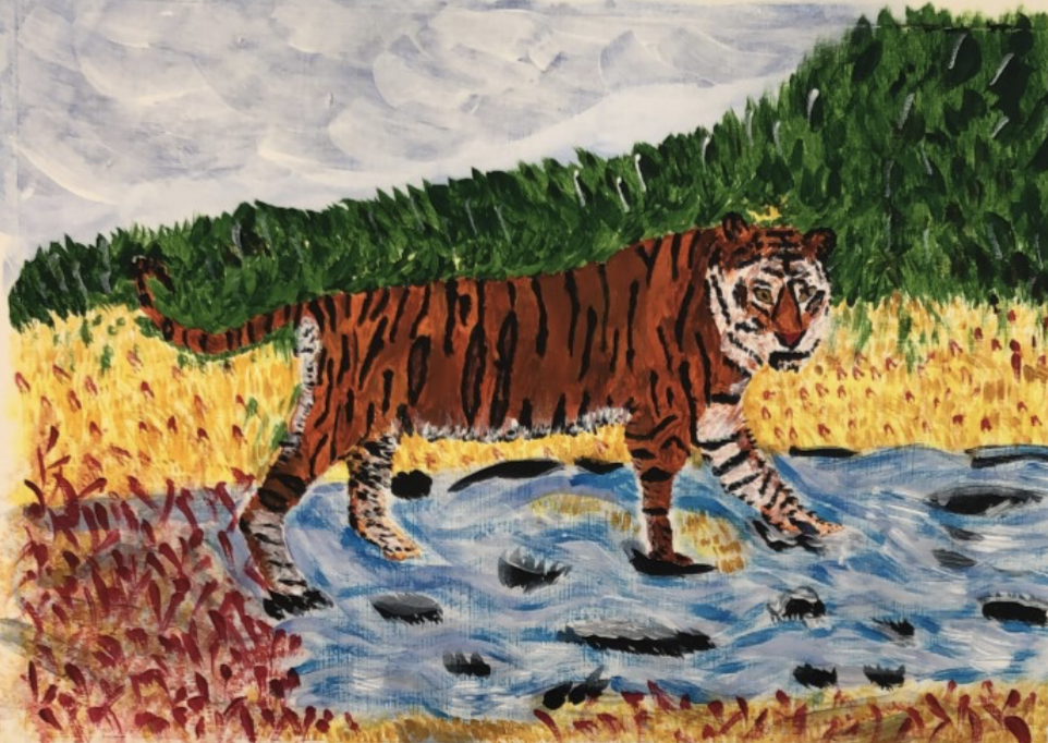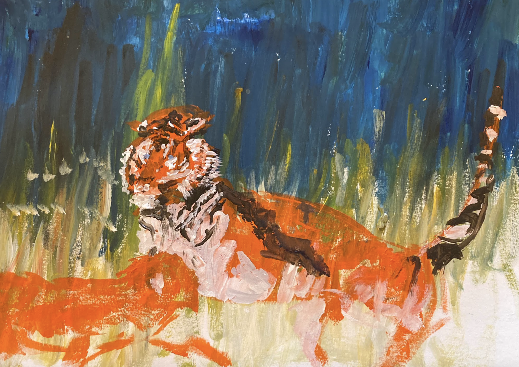 Susan started her tiger painting at the last session and has finished it at home. Using watercolours she painted the picture loose and light to avoid overworking him. The Pantone ‘Very Peri’ colour has been cleverly used in the shadows on the tiger’s chest and in the background too.