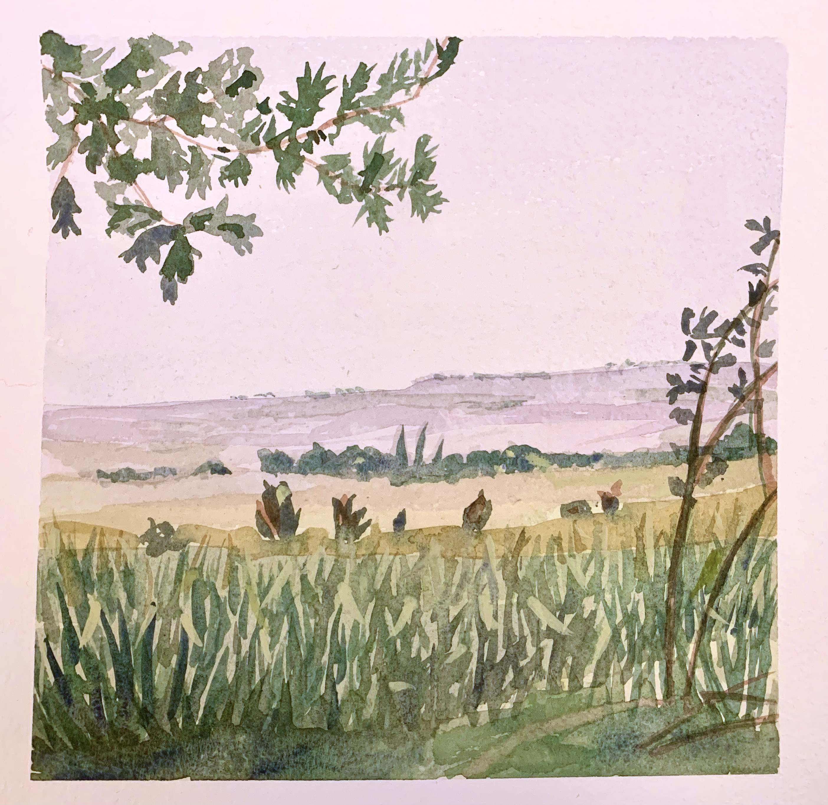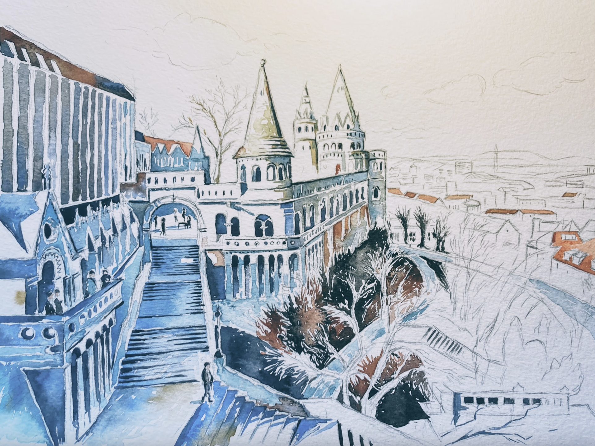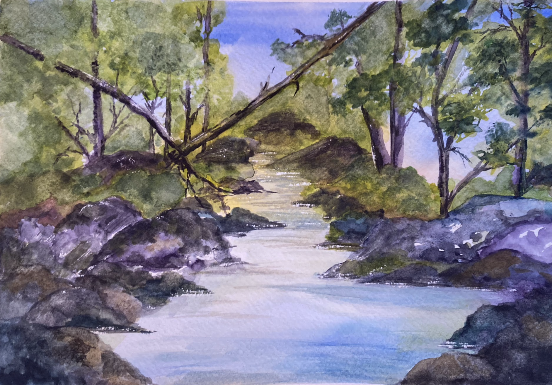 Susan painted her ‘A Winter’s Day’ picture at home using watercolours on SAA practice paper size 11” x 15”.