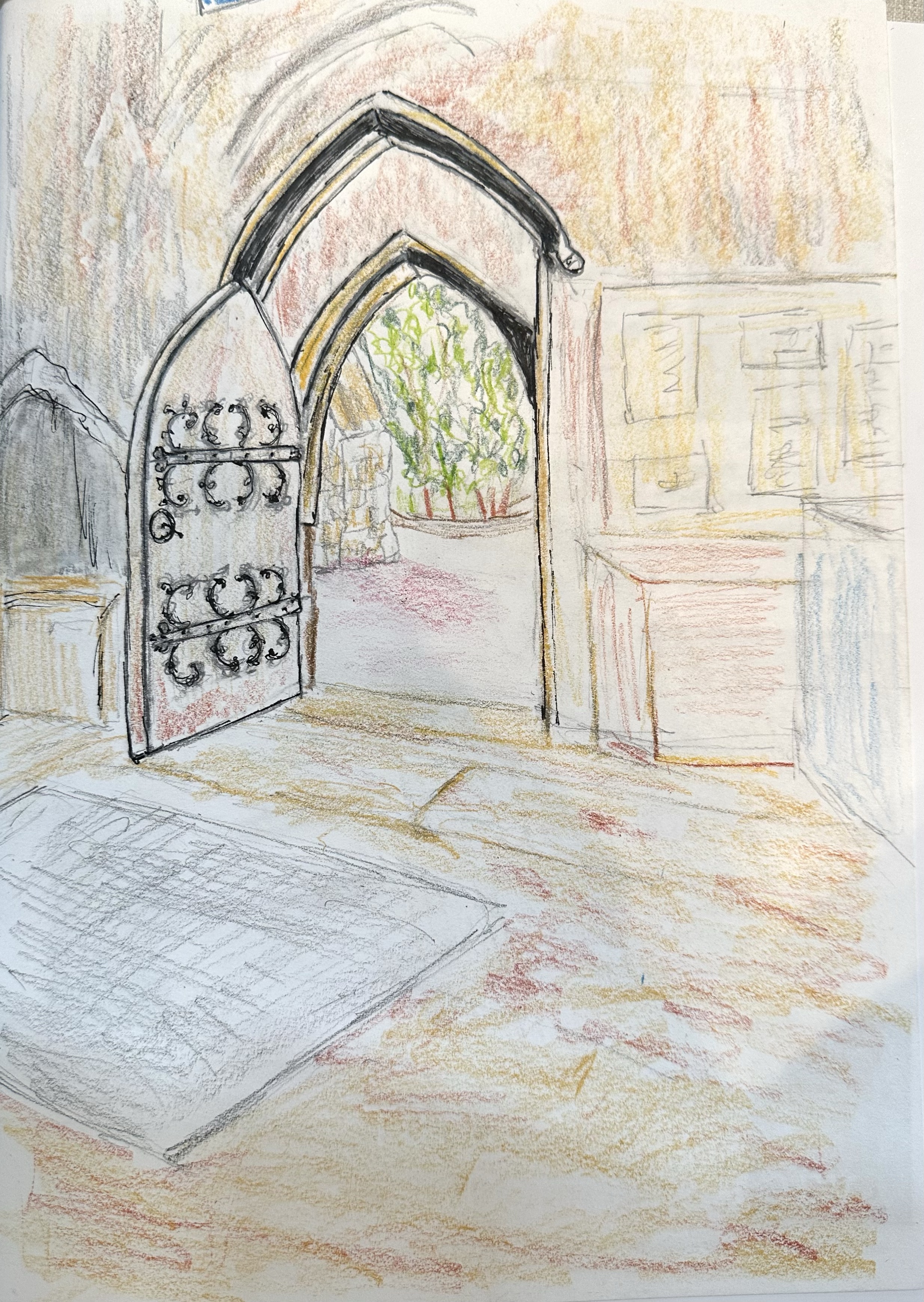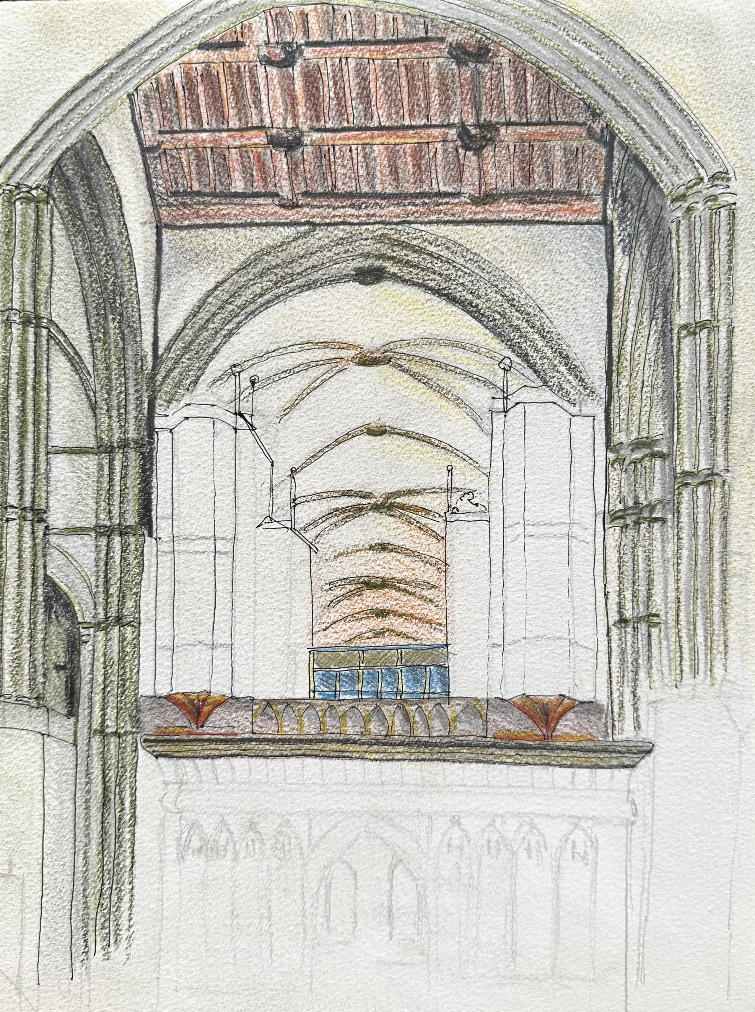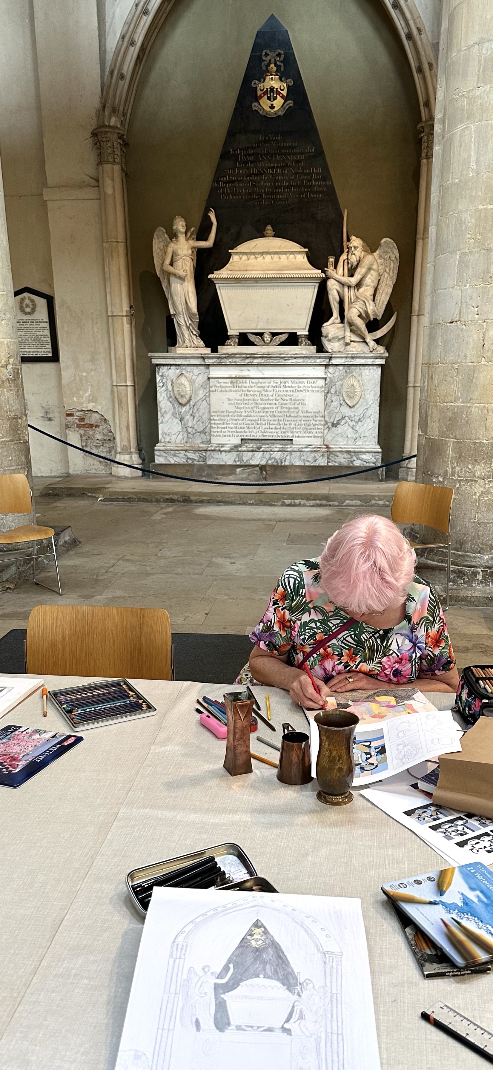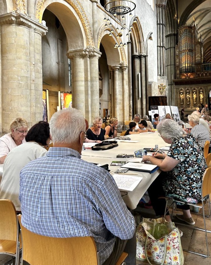 We all had a fantastic day sketching and colouring with dry media as painting wasn’t allowed at the table, and having a good natter of course. Luckily we weren’t outside as at one point the heavens literally opened, with torrential rain causing flooding in the streets outside. Adult and child visitors to the cathedral came to look at our pictures and to have a chat, which was lovely. It was a very memorable day for the art group and thank you to everyone who gave a donation to cathedral funds, we raised £123.