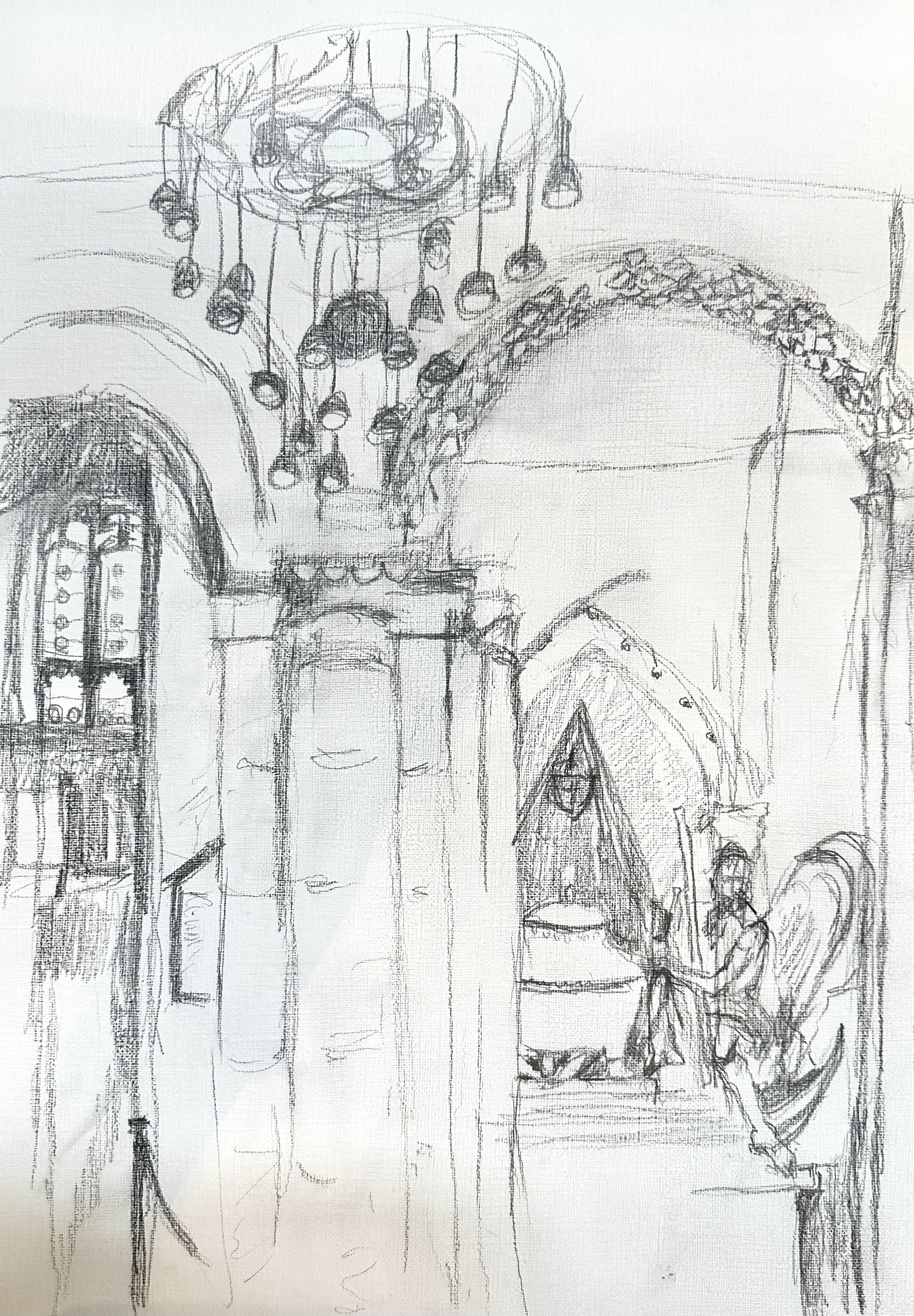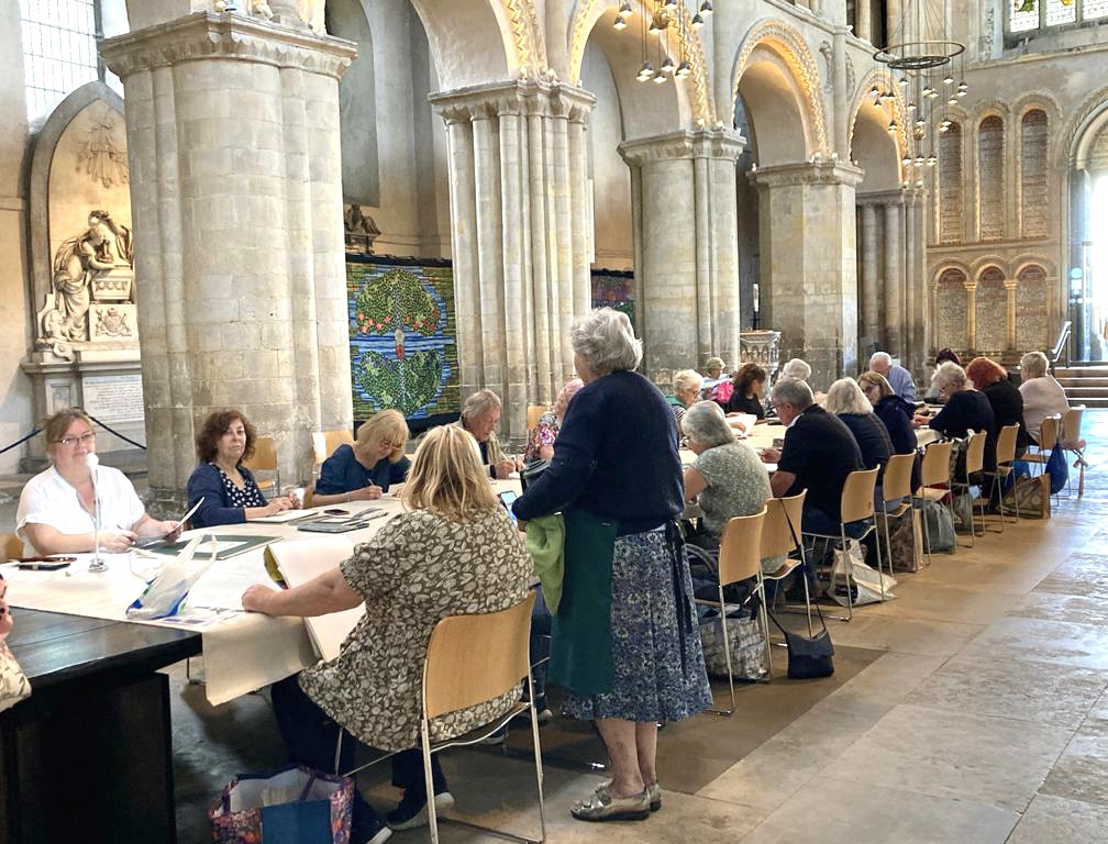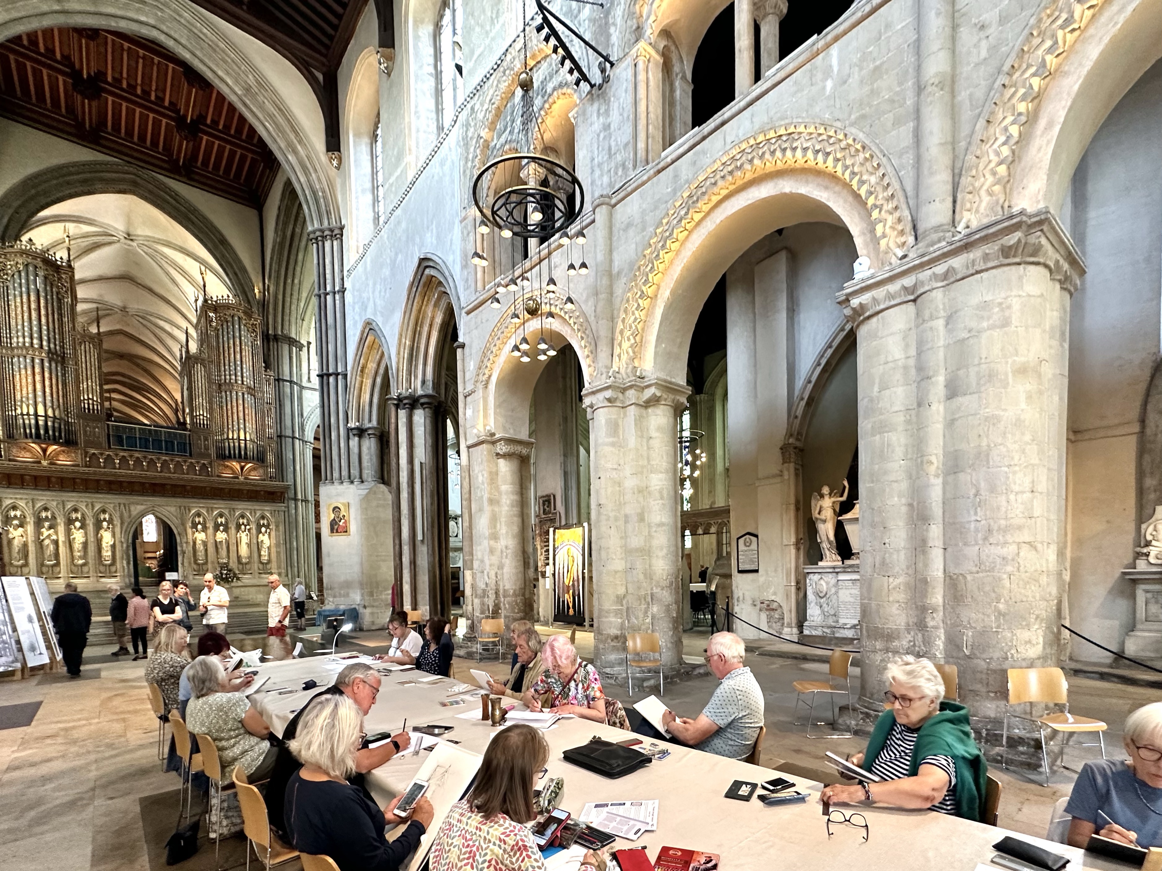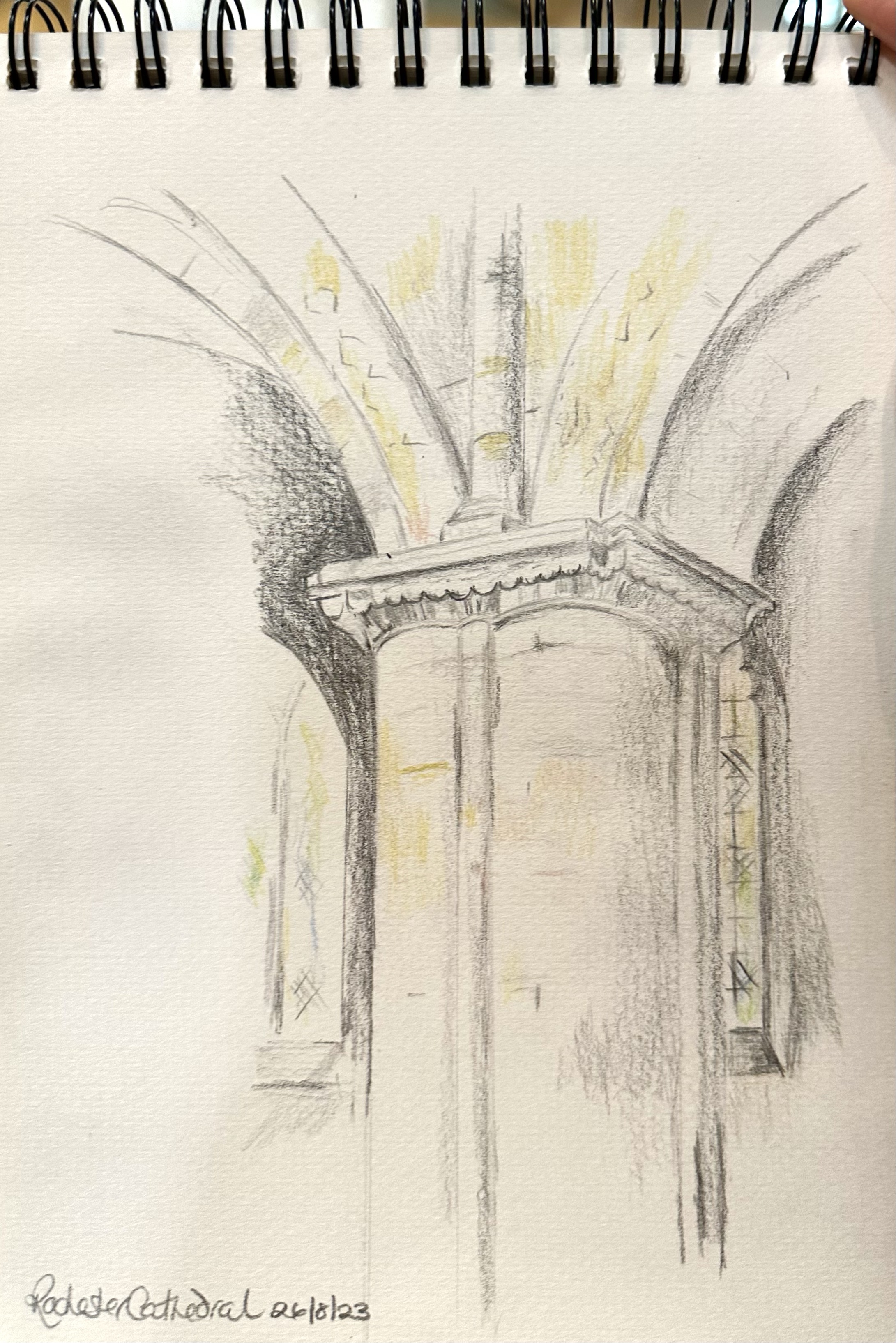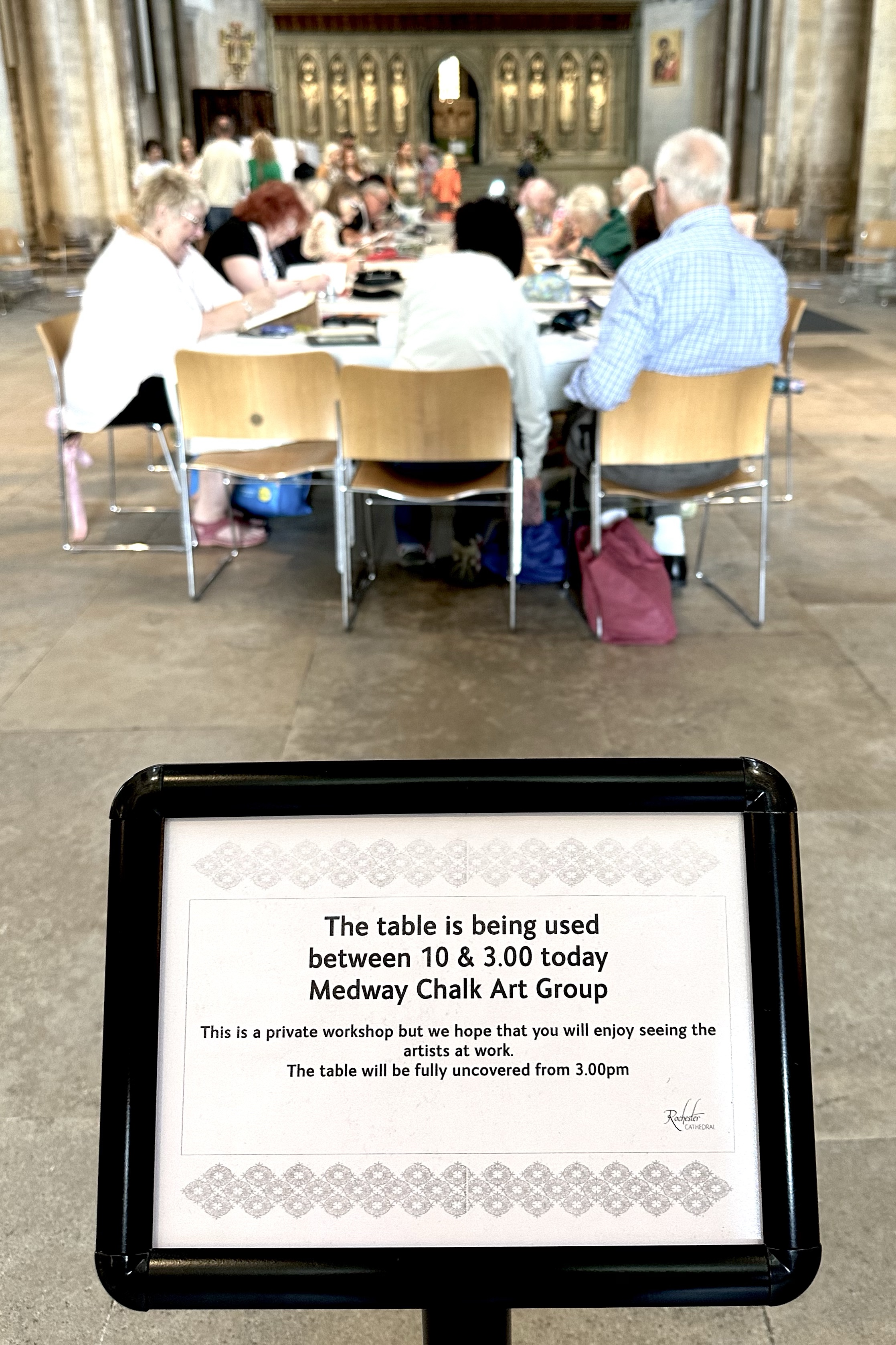 Twenty one members visited Rochester Cathedral to sit and draw at the Fenland black oak table, a piece of fossilised wood over 5000 years old. It was a deep, brownish-black colour and highly polished, placed in the central nave of the cathedral. The section we used was covered in waterproof material, so thankfully we didn’t have to worry about making a mess on it, which would have been disastrous!