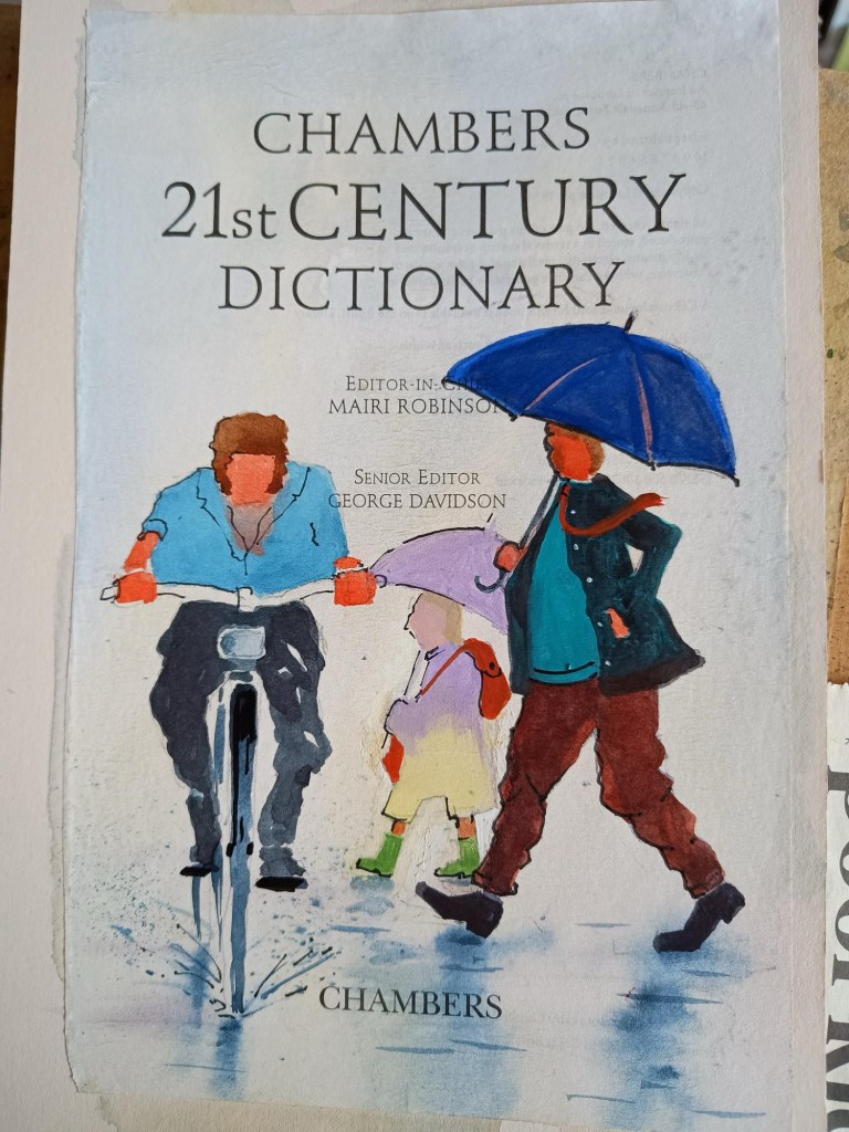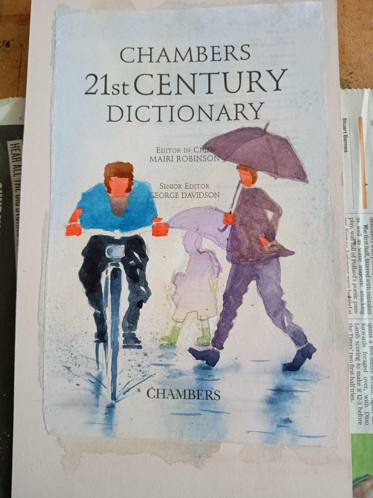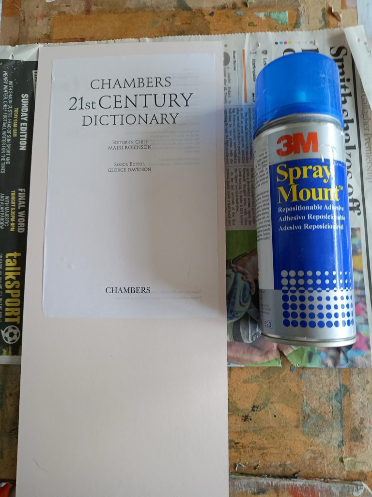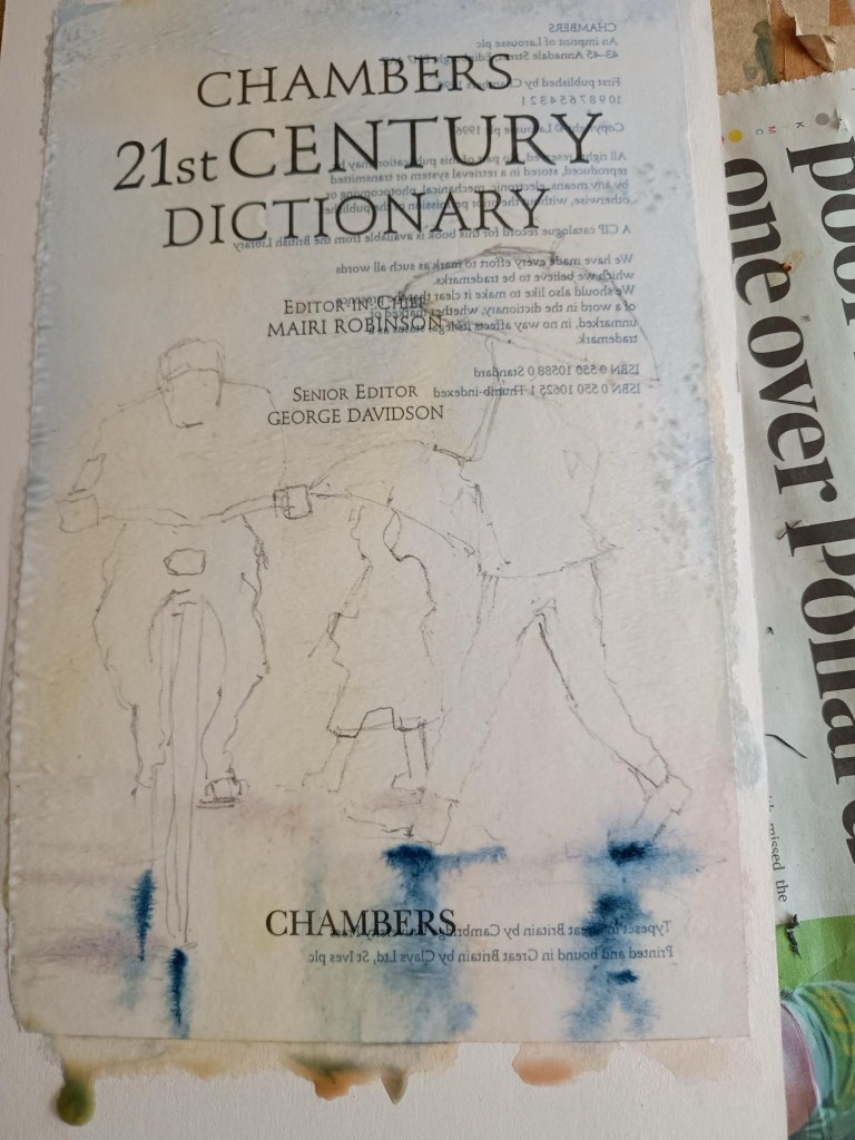 Graham chose several pages from the dictionary to paint on, but before he starts he tried painting on a spare dictionary page to experiment with how much water to use with watercolour and gouache paints and he tried using a pen too. His process is really interesting and is useful to everyone who has painted a dictionary page or who wants to paint one, especially his technique of mounting the page on scrap board to start with. The dictionary will be brought to future sessions in case anyone wants to paint more pages.