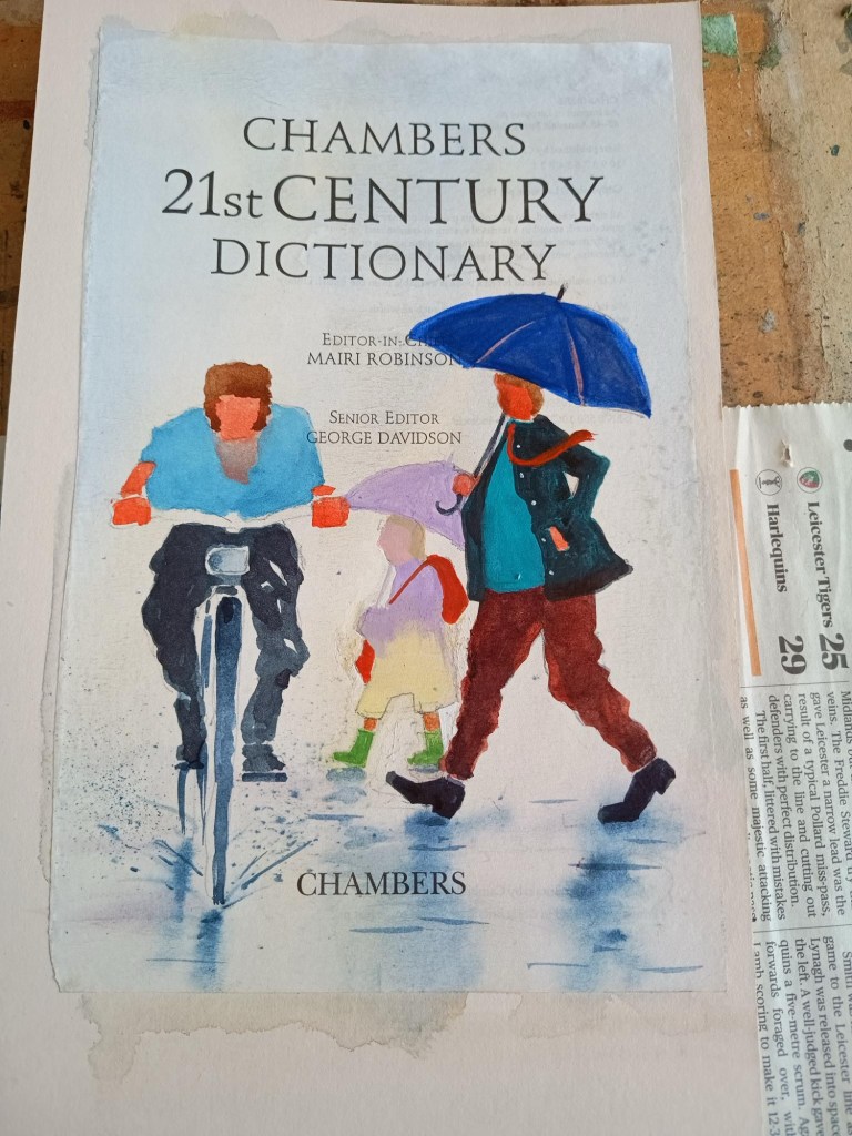 For the man on the bicycle I mixed all the colours in the palette and applied them with a fairly dry brush, often taking most of the wet paint out of the brush with a tissue.