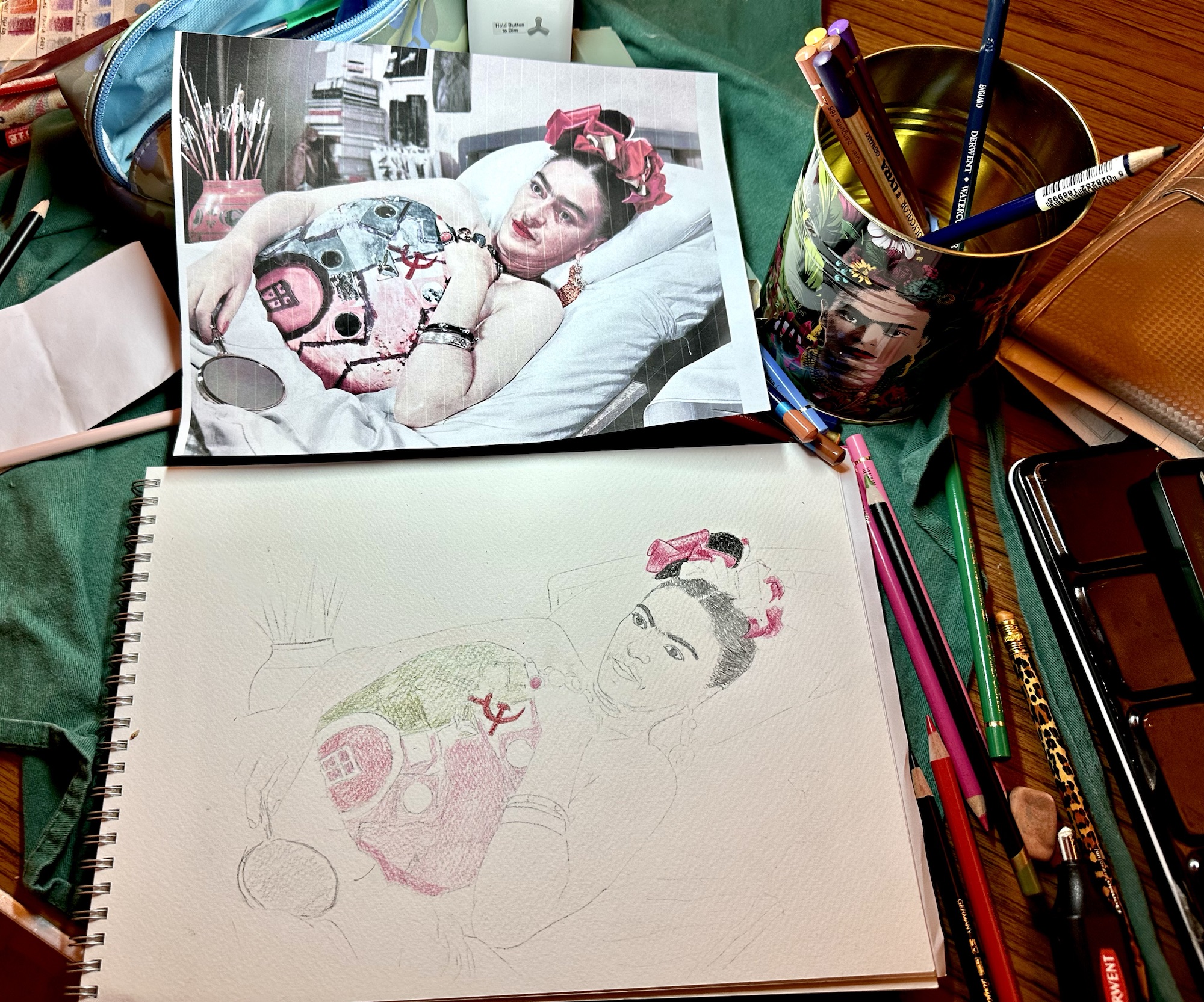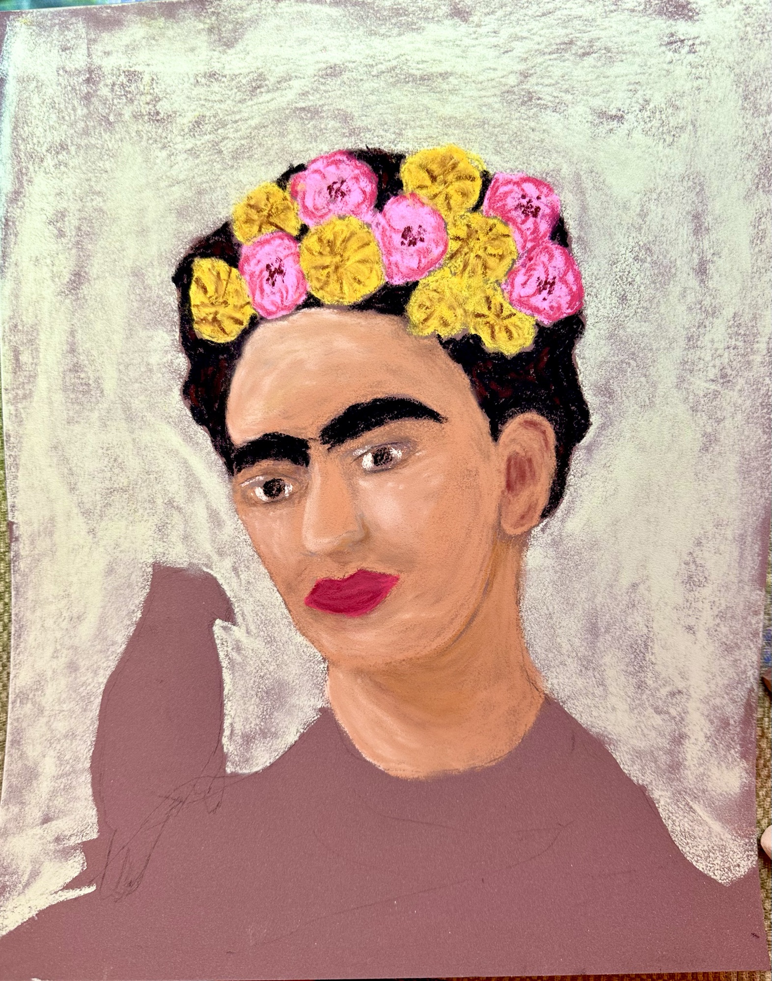 Several portraits by Brenda, Steve and Tracy, a flower study of similar blooms Frida wore by Myrna and a picture by Angela of the Casa Azul (the Blue House) Frida’s family home were started and will hopefully be finished at home. Chris couldn’t attend the session but completed a portrait at home, sending a photo for inclusion. If you do draw or paint the suggested subject at home, please send a photo to Tracy or Steve and they’ll be happy to add to it the relevant post.