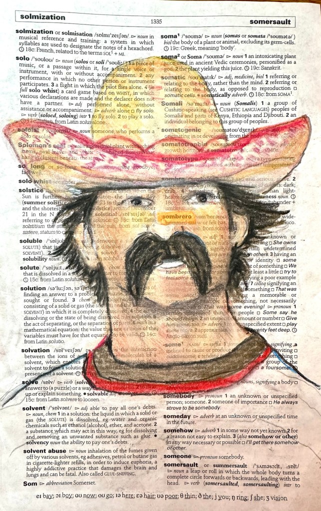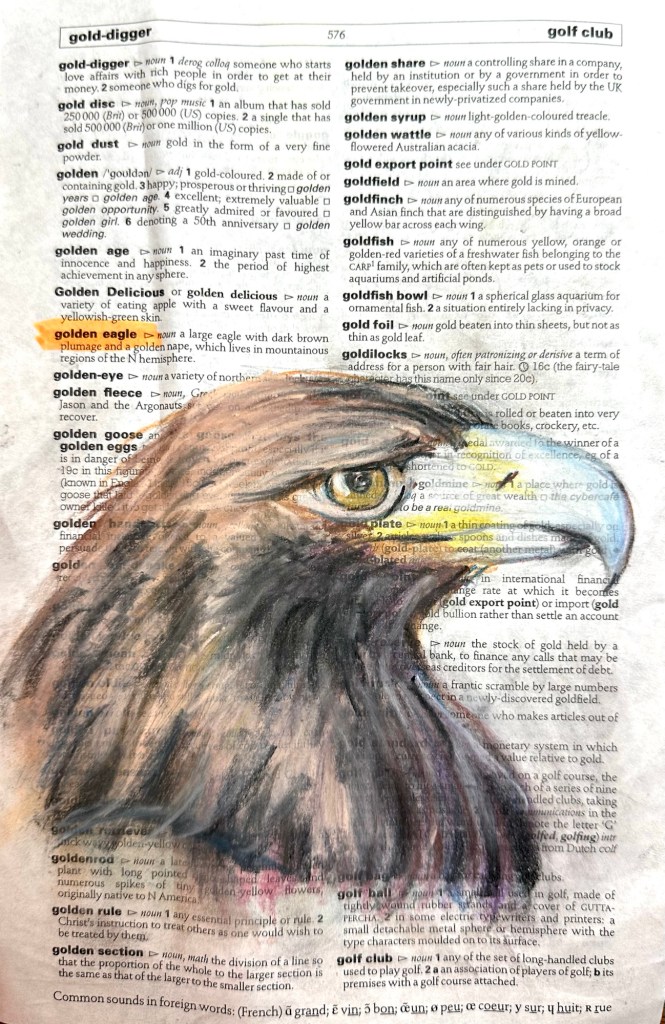Steve’s surname of Goldson isn’t in the dictionary so he used the pages with the words ‘gold’ and ‘son’ on to create images of other words on the pages. He used soft pastels to draw a golden eagle and a man wearing a sombrero.