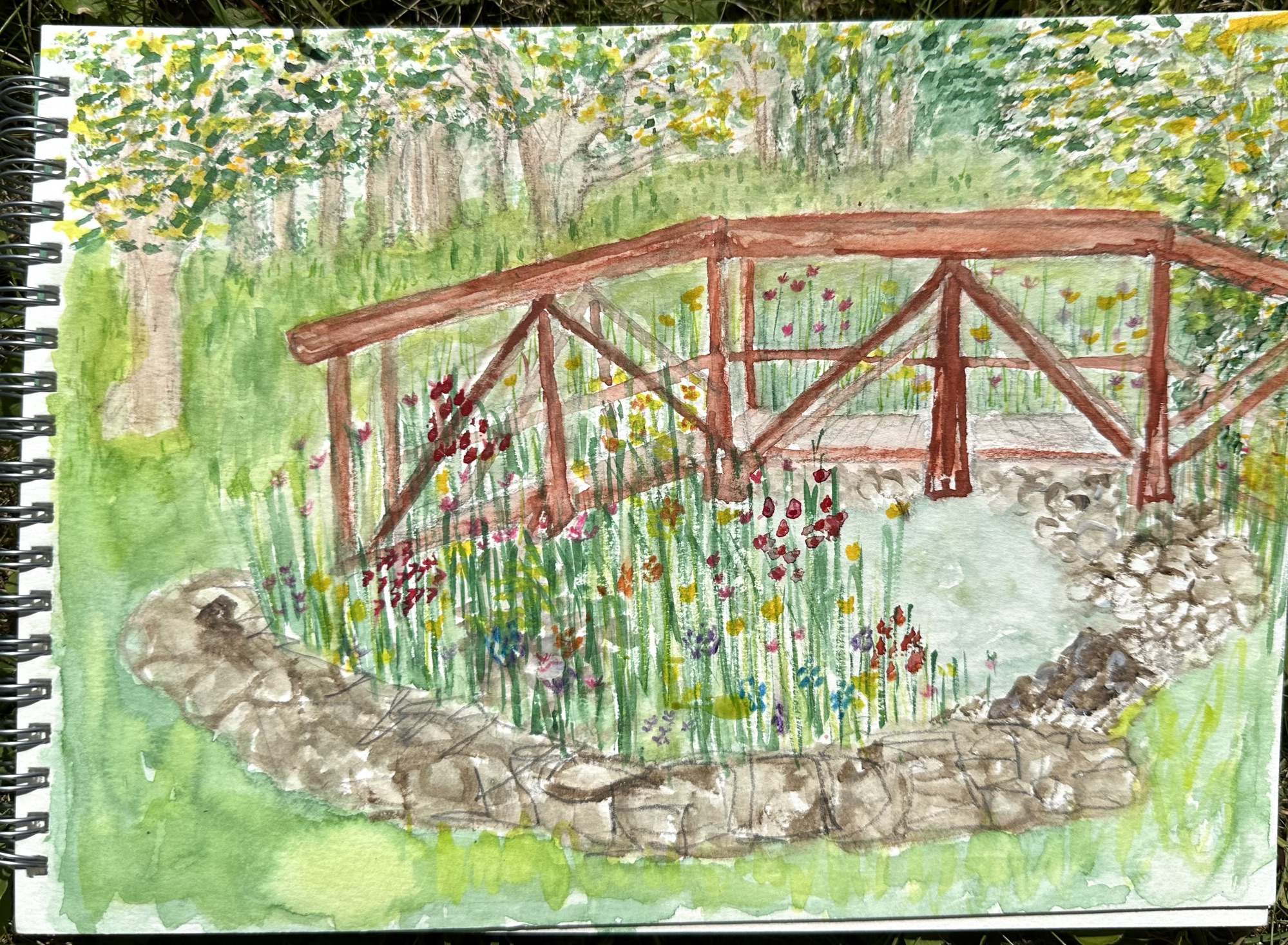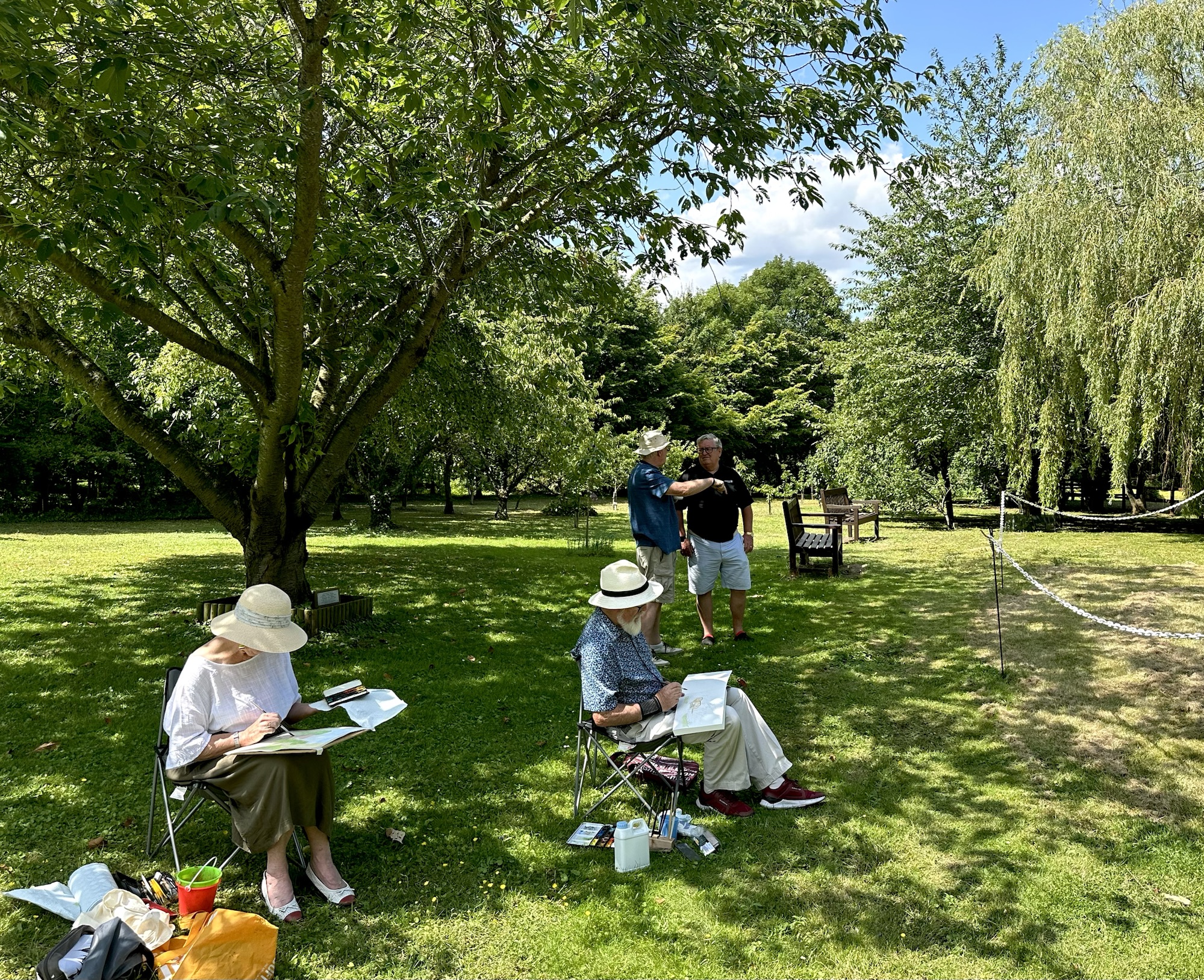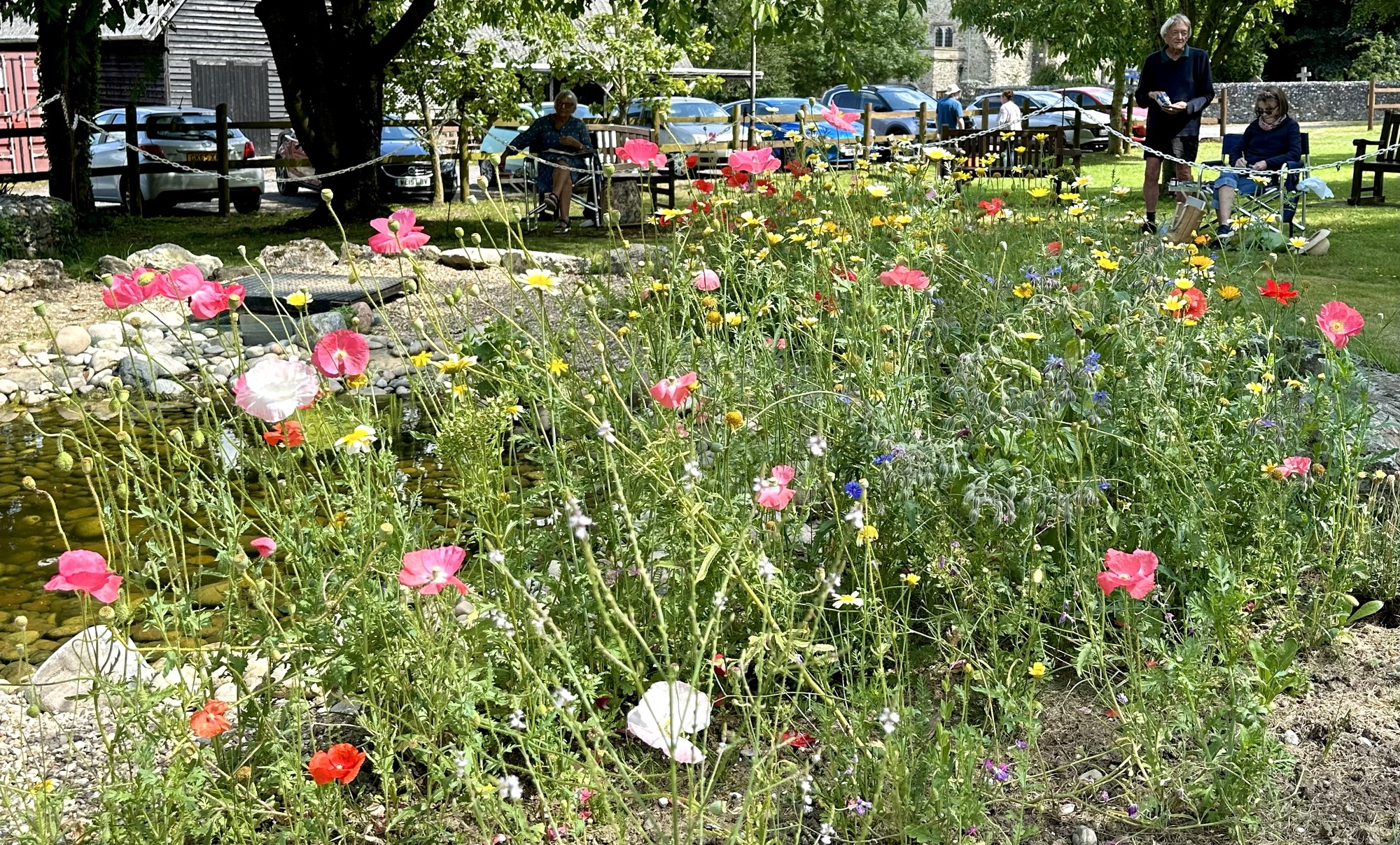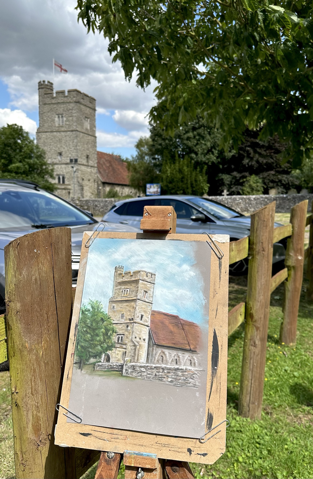 On Saturday twelve members visited Chalk Church and enjoyed drawing and painting in perfect weather. It was sunny but not too hot, being pleasantly warm with a gentle breeze. The Monet bridge and pond area looked very bare last year but is now planted with wild flowers such as red, white and pink poppies and yellow and blue flowers too. In the pond we saw a newt and shrimpy things swimming with their little legs, dragonflies flew above whilst water boatmen and beetles scurried on the water’s surface.