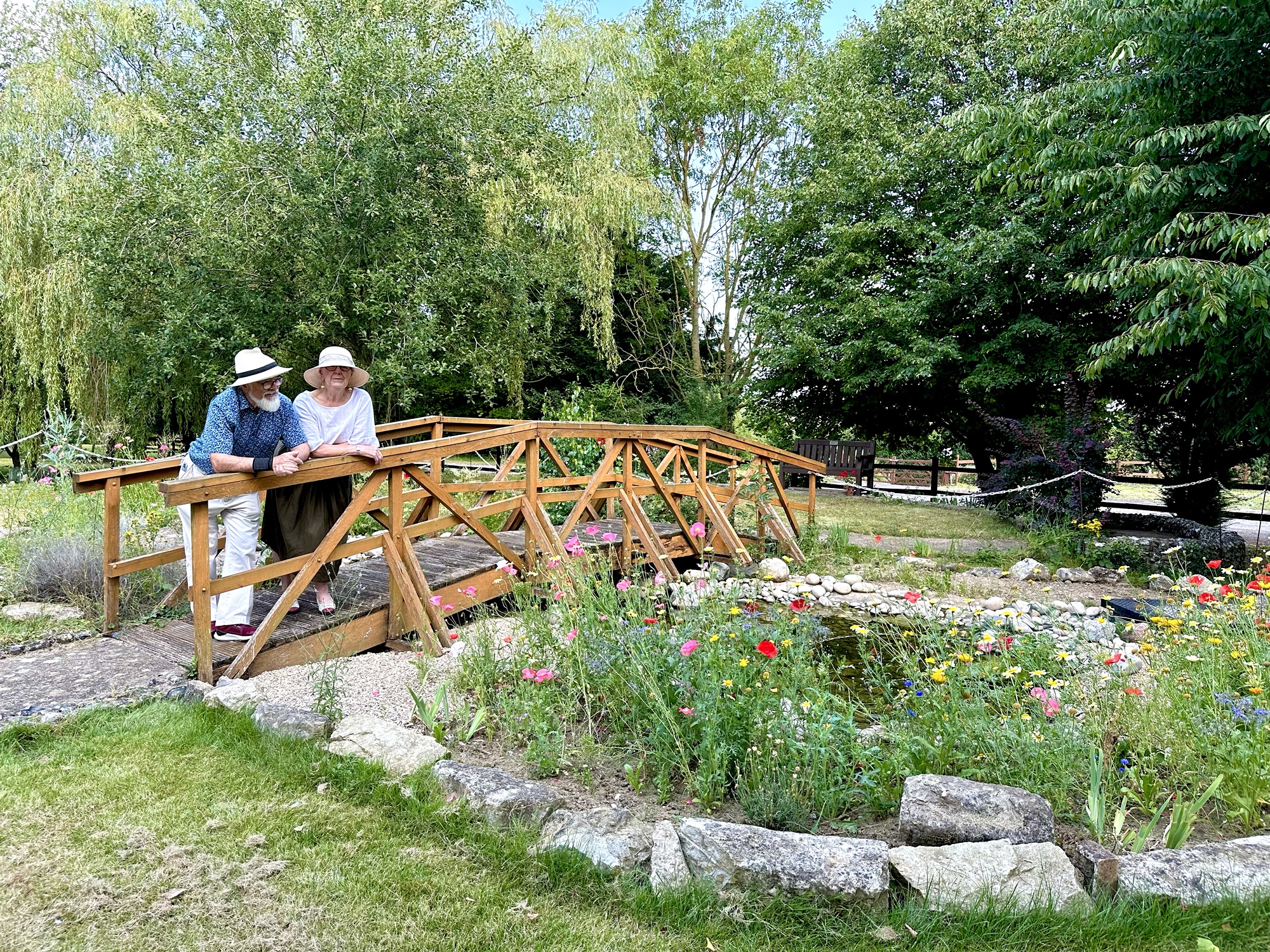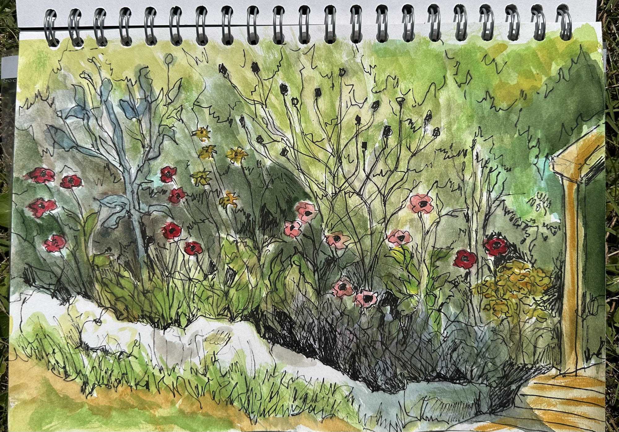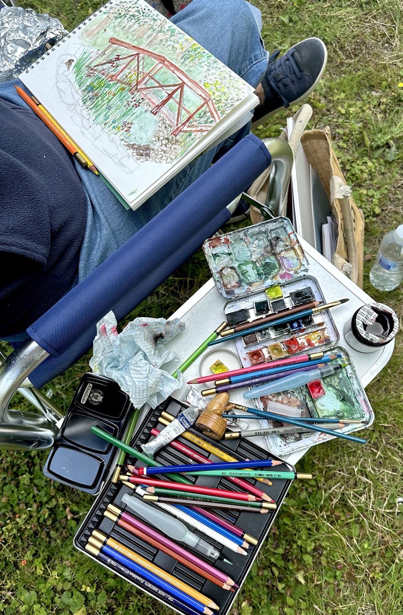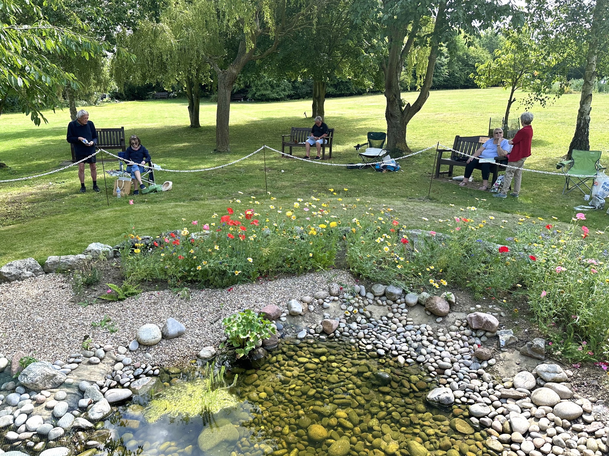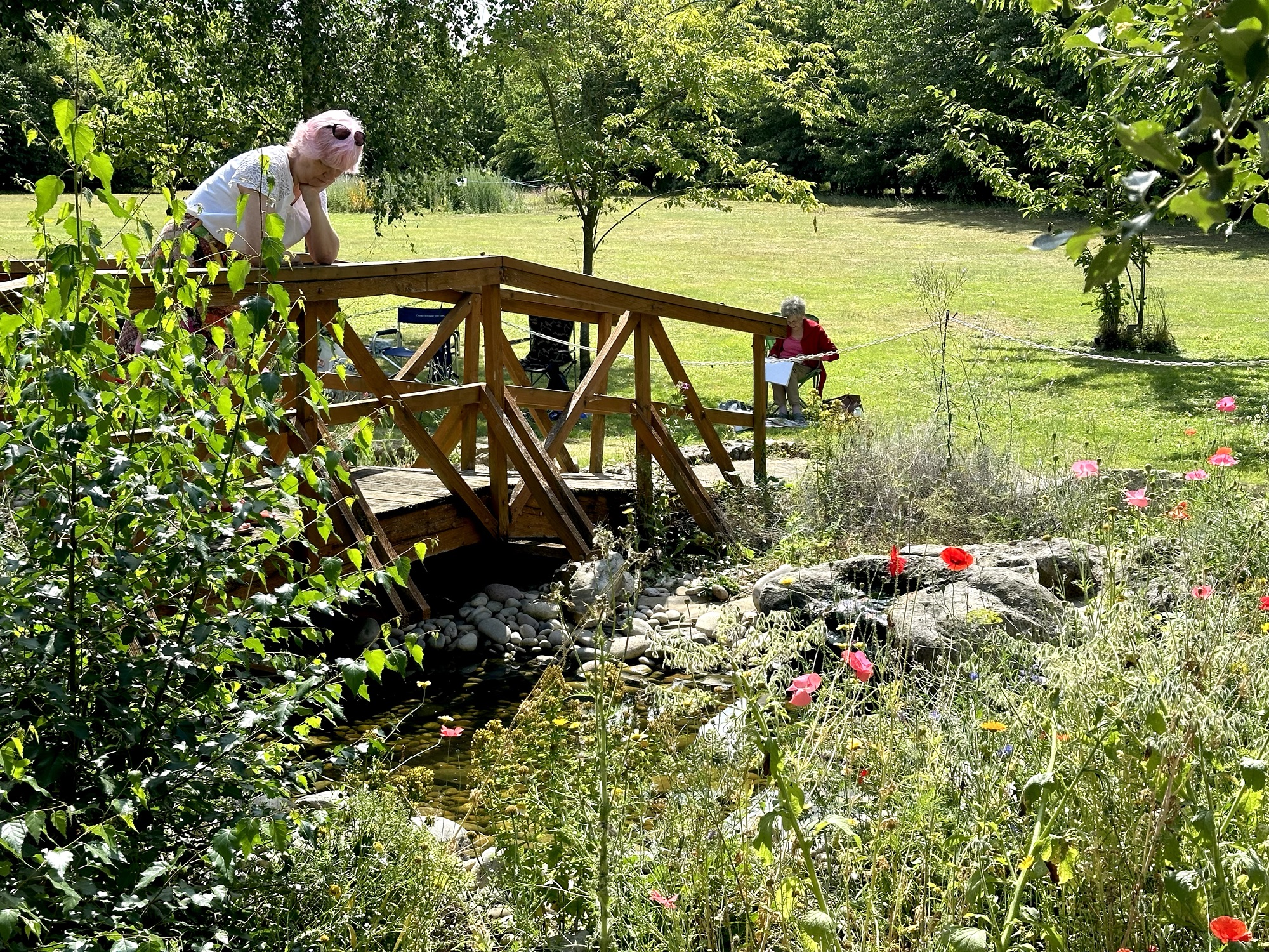 On Saturday twelve members visited Chalk Church and enjoyed drawing and painting in perfect weather. It was sunny but not too hot, being pleasantly warm with a gentle breeze. The Monet bridge and pond area looked very bare last year but is now planted with wild flowers such as red, white and pink poppies and yellow and blue flowers too. In the pond we saw a newt and shrimpy things swimming with their little legs, dragonflies flew above whilst water boatmen and beetles scurried on the water’s surface.
