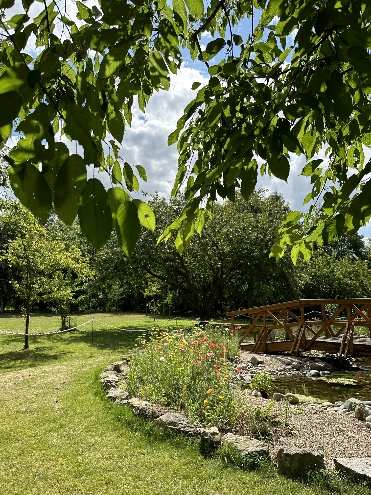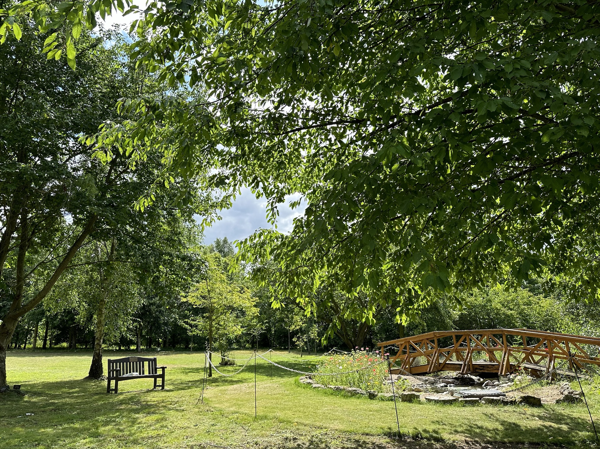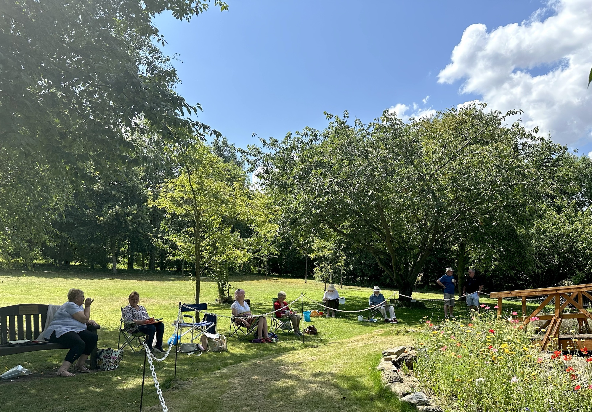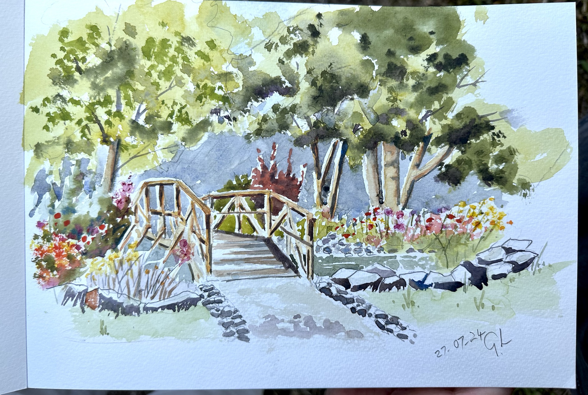 On Saturday twelve members visited Chalk Church and enjoyed drawing and painting in perfect weather. It was sunny but not too hot, being pleasantly warm with a gentle breeze. The Monet bridge and pond area looked very bare last year but is now planted with wild flowers such as red, white and pink poppies and yellow and blue flowers too. In the pond we saw a newt and shrimpy things swimming with their little legs, dragonflies flew above whilst water boatmen and beetles scurried on the water’s surface.
