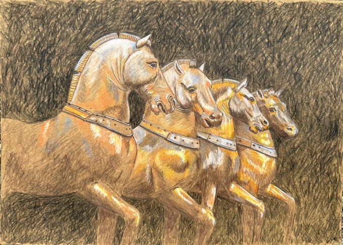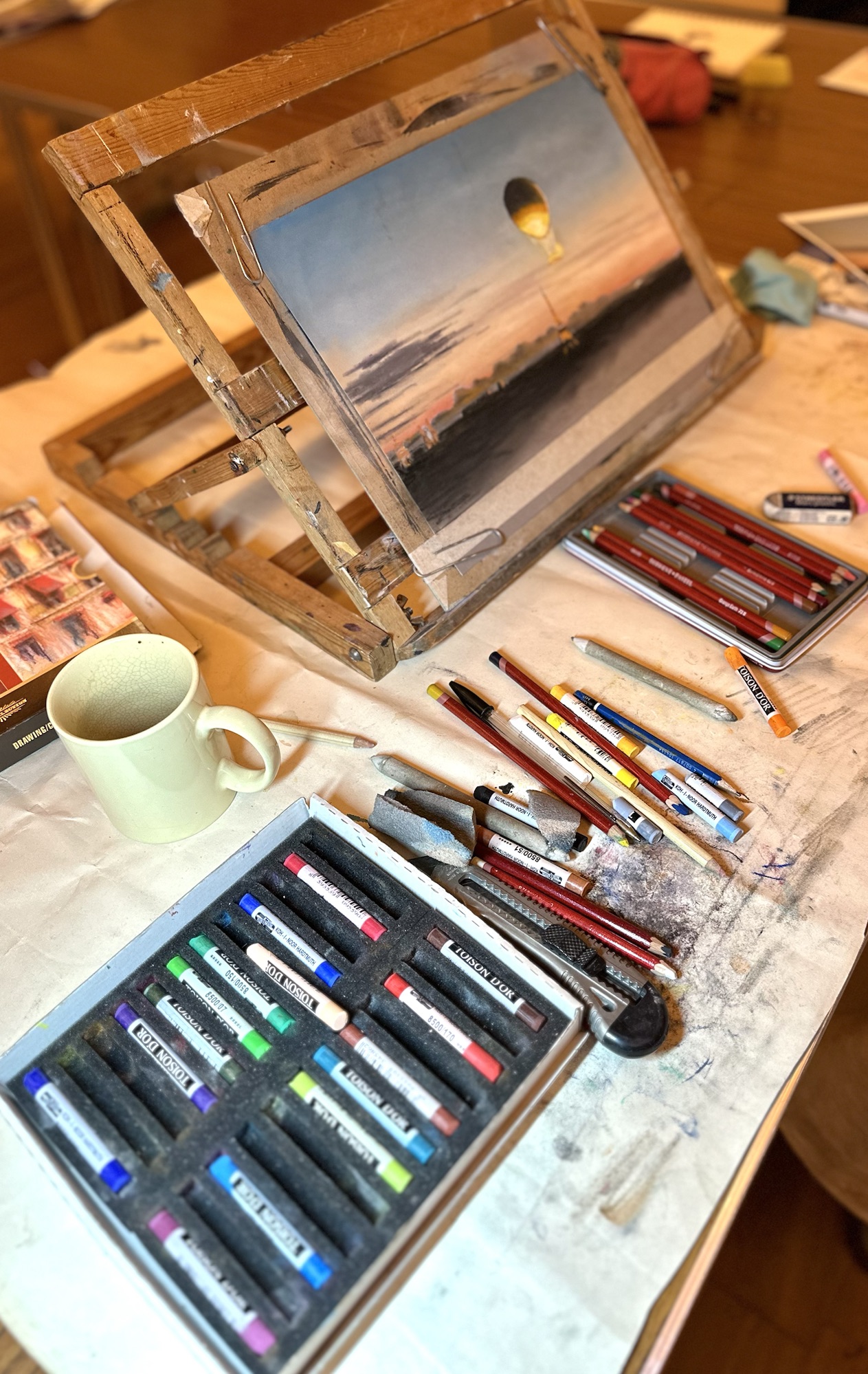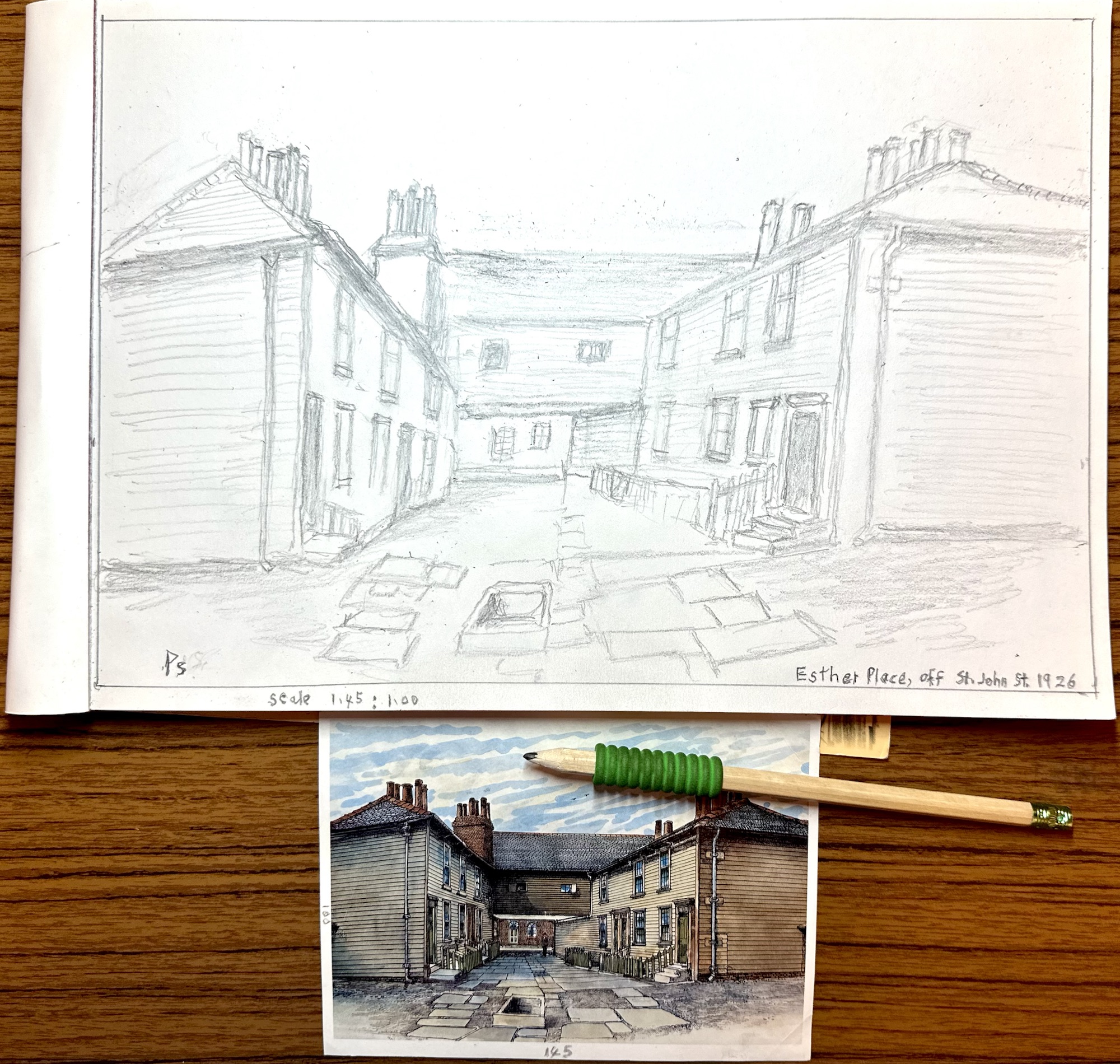 Modern urban landscapes – look around where you live. Find an old photo online or an old postcard showing your street or town and create a picture from that source. Then draw or paint that same view en plain air or from a photo, showing the similarities and differences.