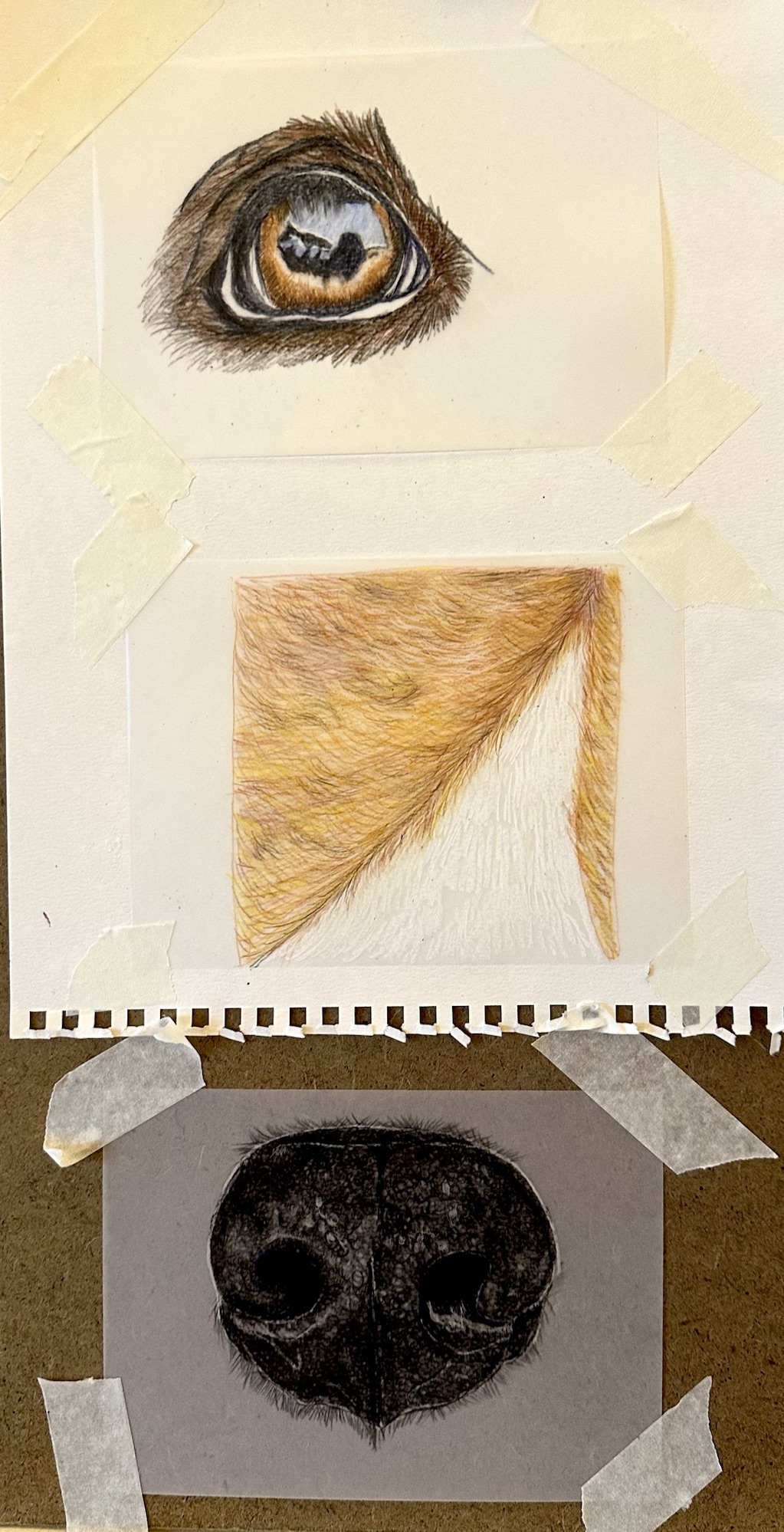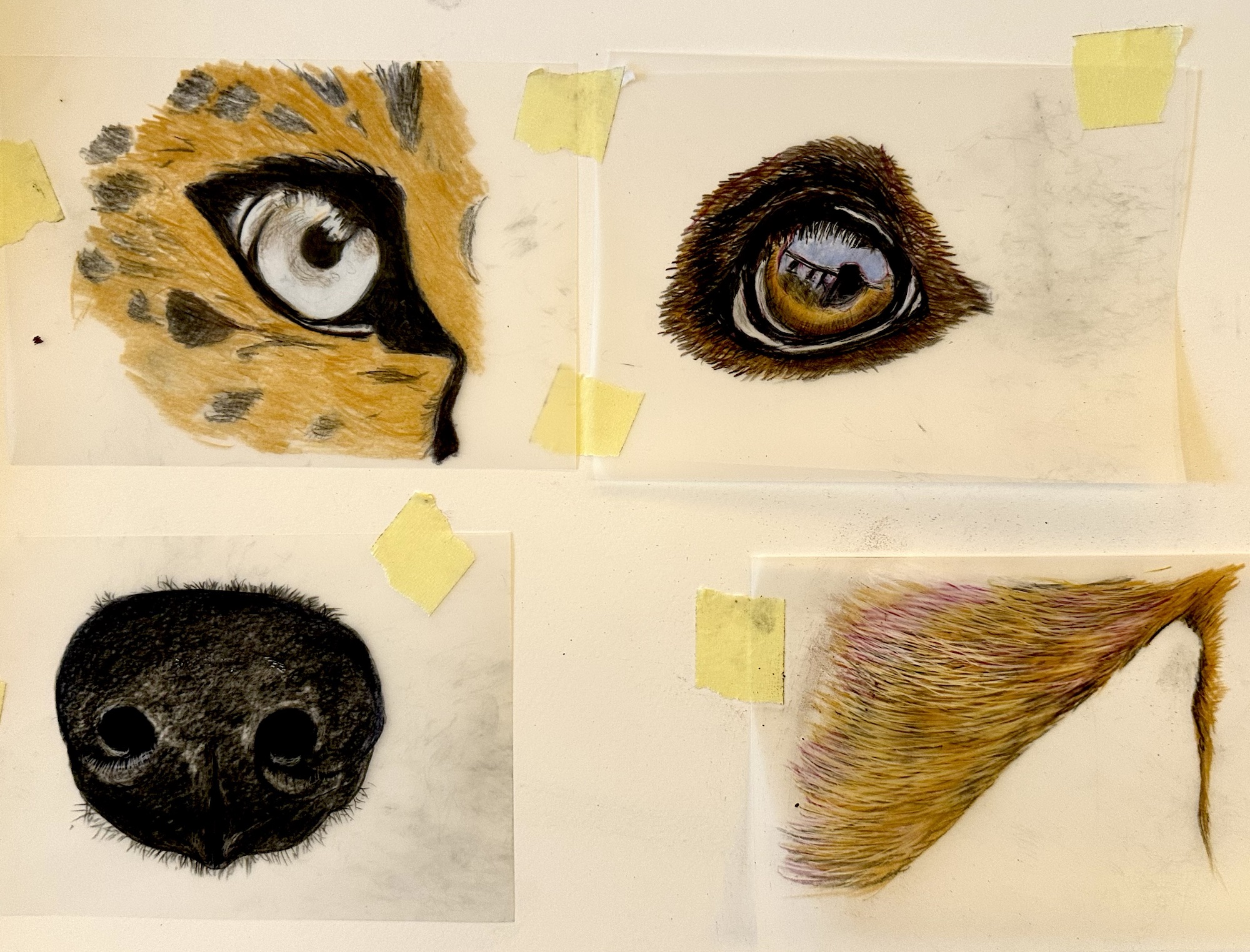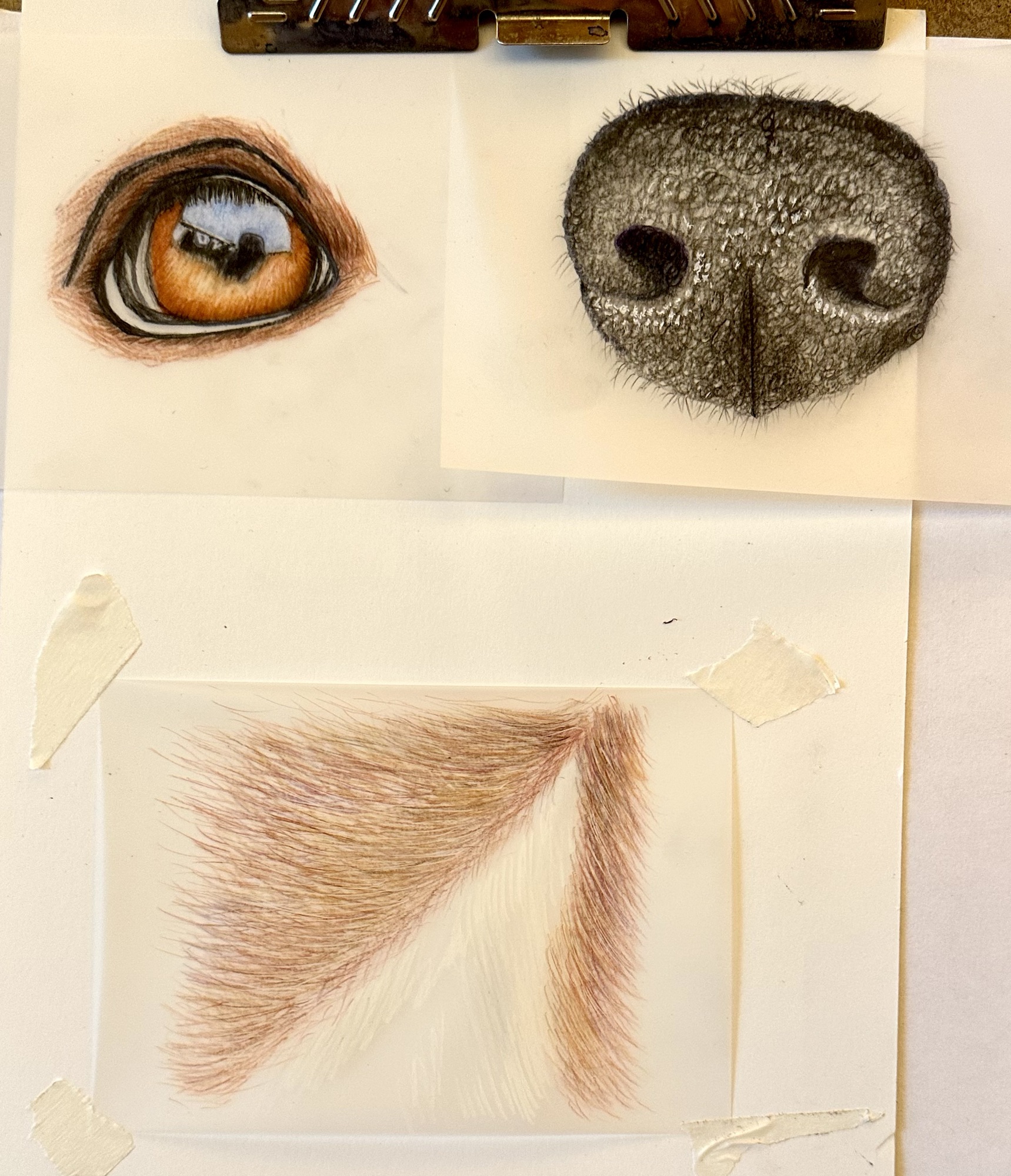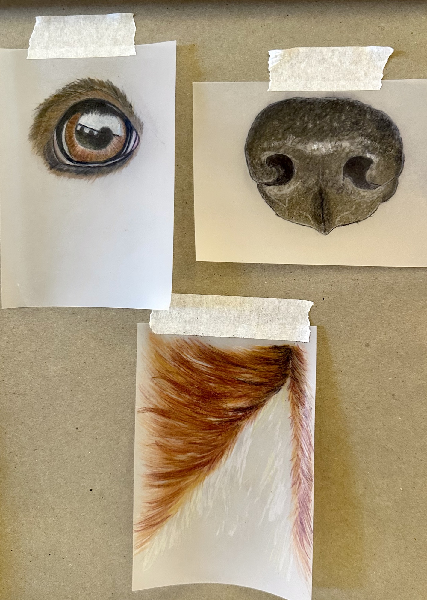 No one had drawn on drafting film before and we were all surprised how well the colour layers could be built up. We put a smooth sheet of hot pressed watercolour paper or cartridge paper underneath the drafting film so the colours could be easily seen. The Tombow Mono erasers were useful for removing tiny areas of colour as the eraser head is so small and the ceramic slices used to remove areas of colour for highlights and individual strands of fur.