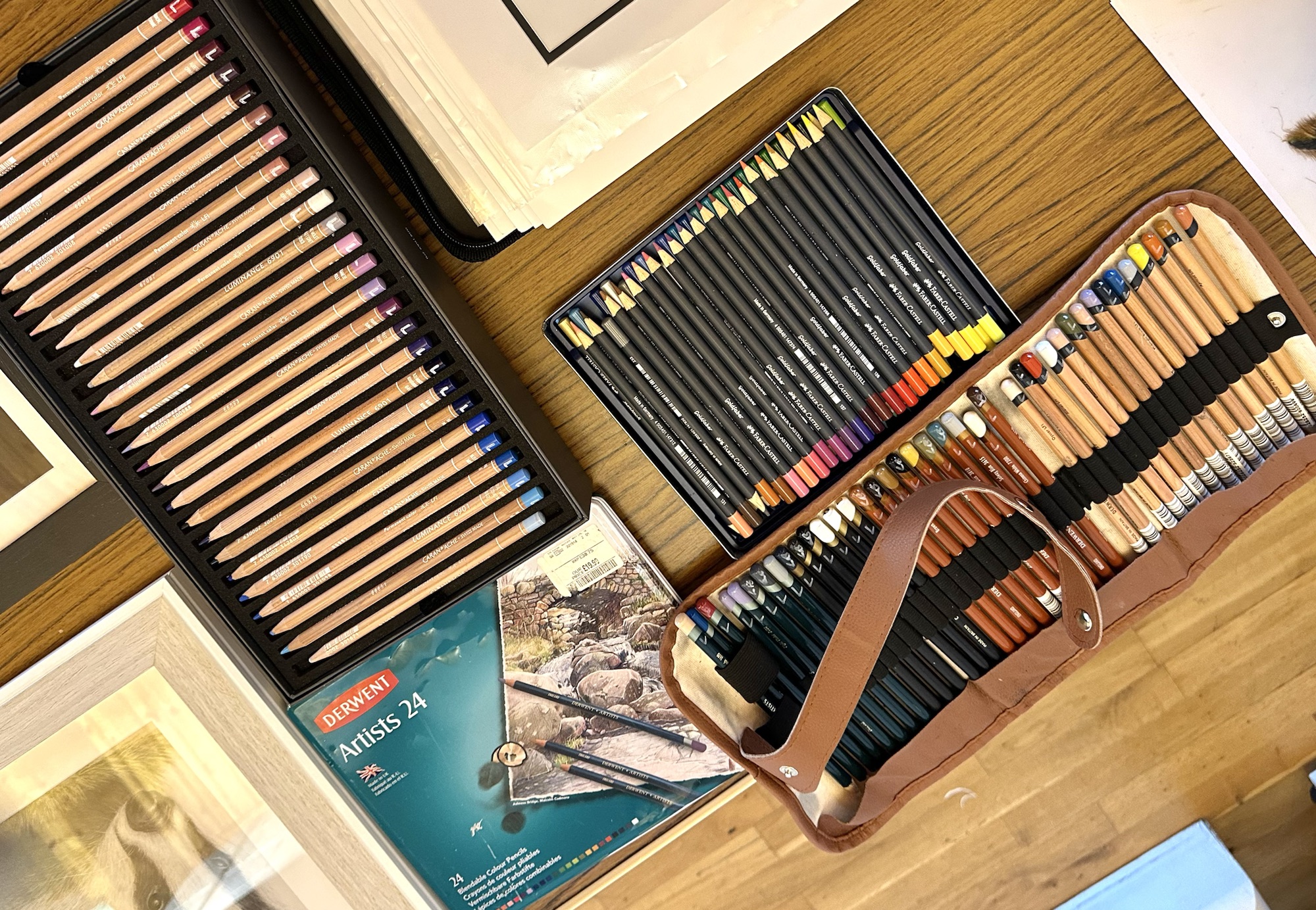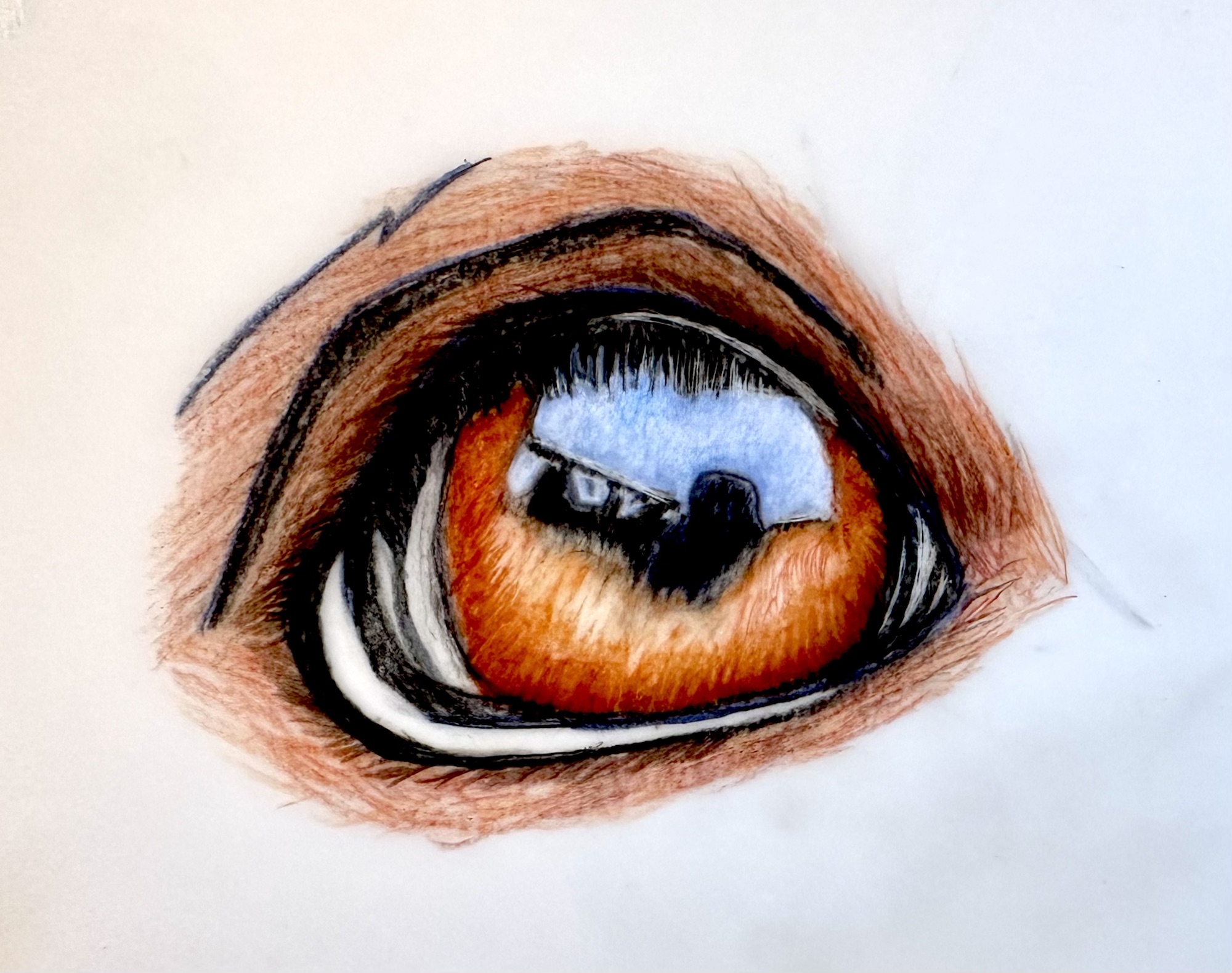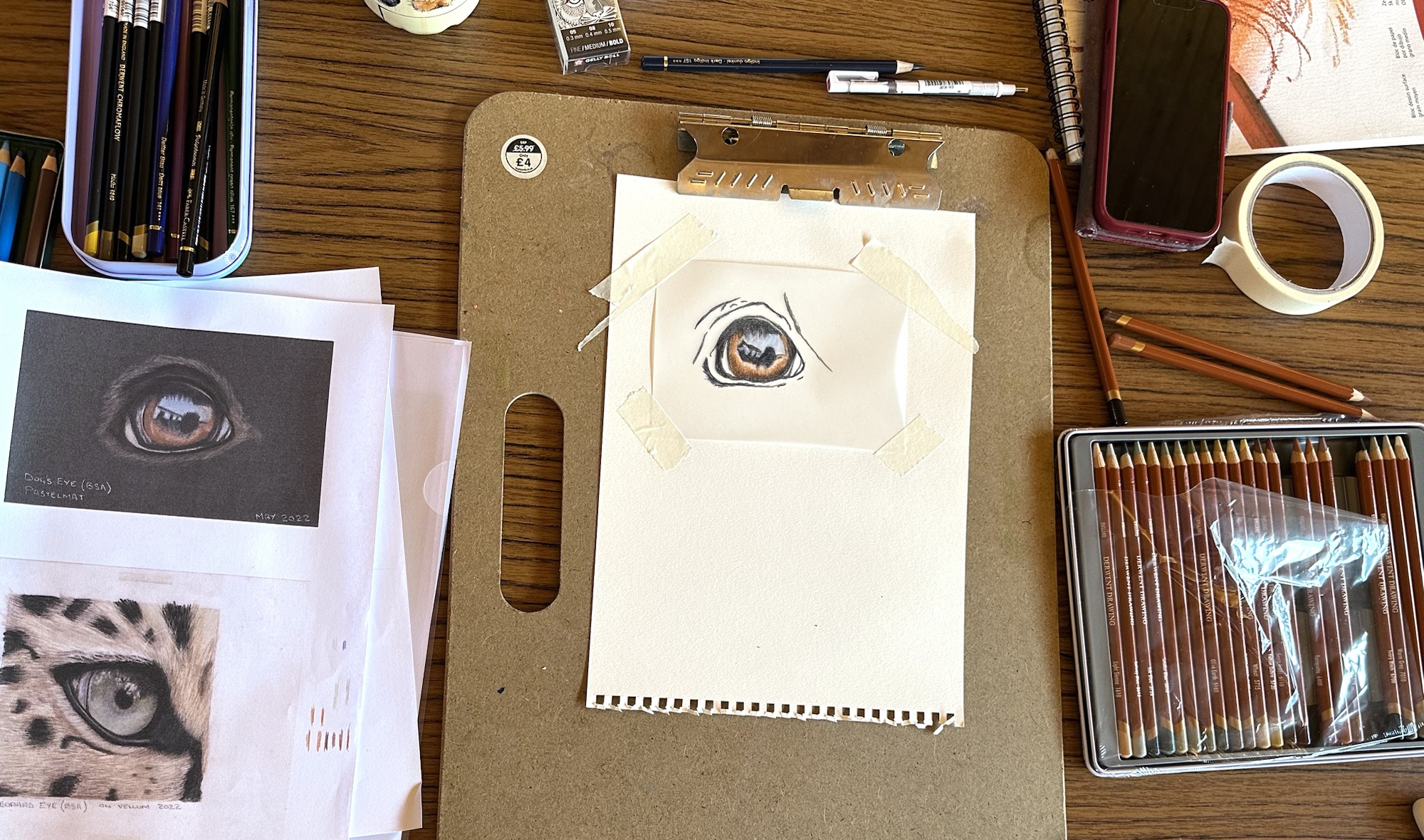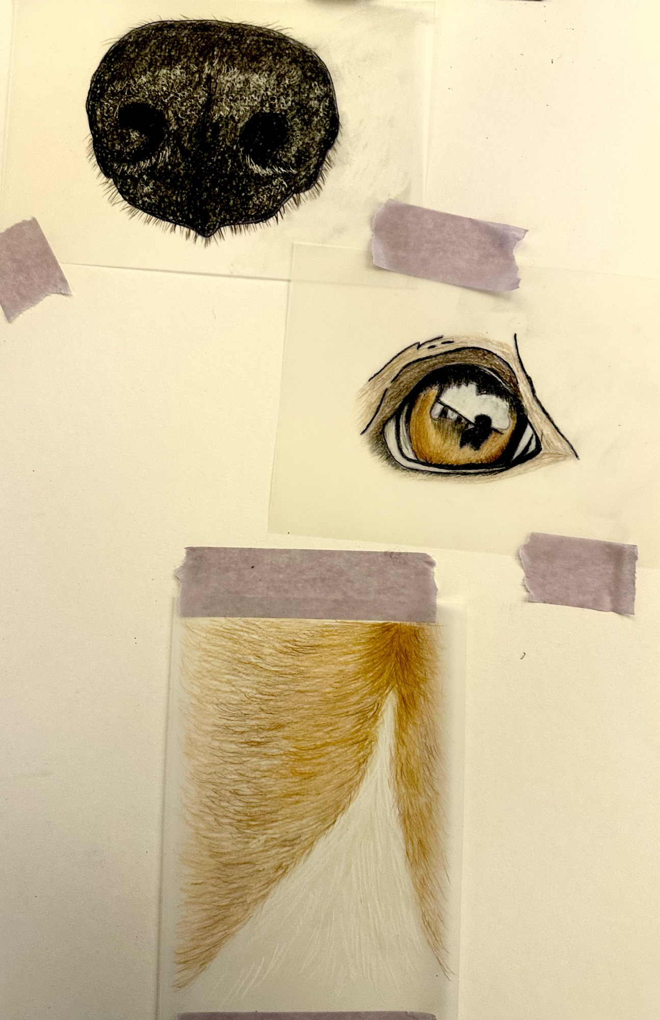 No one had drawn on drafting film before and we were all surprised how well the colour layers could be built up. We put a smooth sheet of hot pressed watercolour paper or cartridge paper underneath the drafting film so the colours could be easily seen. The Tombow Mono erasers were useful for removing tiny areas of colour as the eraser head is so small and the ceramic slices used to remove areas of colour for highlights and individual strands of fur.