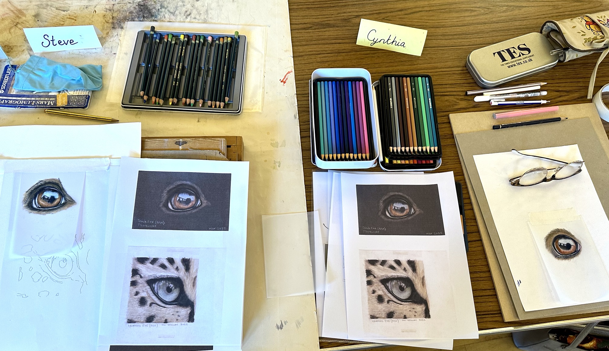 Helen made up packs of sheets of information for us to use and Liz showed us how to colour the eye, nose and fur. By learning these three basics we can go on to create a picture of an animal of our choice. Both ladies walked around all day showing people individually how to lay the colours down and generously loaned their extensive coloured pencil collection for everyone to use, along with their ceramic slices and erasers.