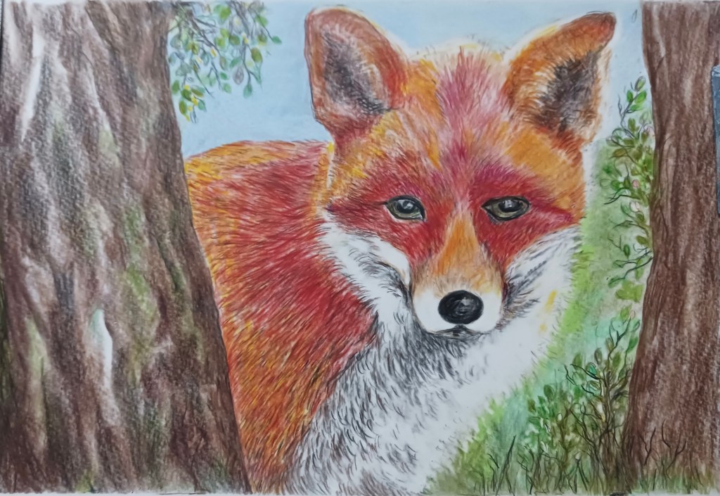 After the coloured pencil workshop Dot went home inspired and started a picture of a fox on one of the extra sheets in the packs we were given. She used several different colours of pencil for the fur and gave emphasis to the eyes as they stare out of the picture at the viewer. Lovely work Dot, well done.
