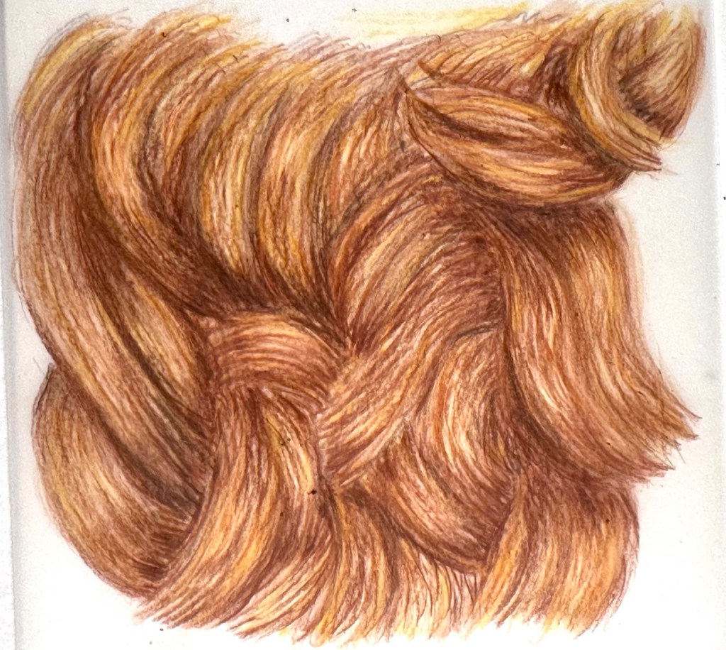 Tracy tried the curly hair exercise from one of the information sheets in the pack. The exercise was for black hair but she used 6 shades of light to dark brown instead. The sheet says the hair wouldn’t look right for a couple of hours and this was true, it looked very stiff. But after adding darker browns the hair looked a lot better after another 90 minutes. Do give the exercise a go on the pastel paper or drafting film, it is a big challenge!
