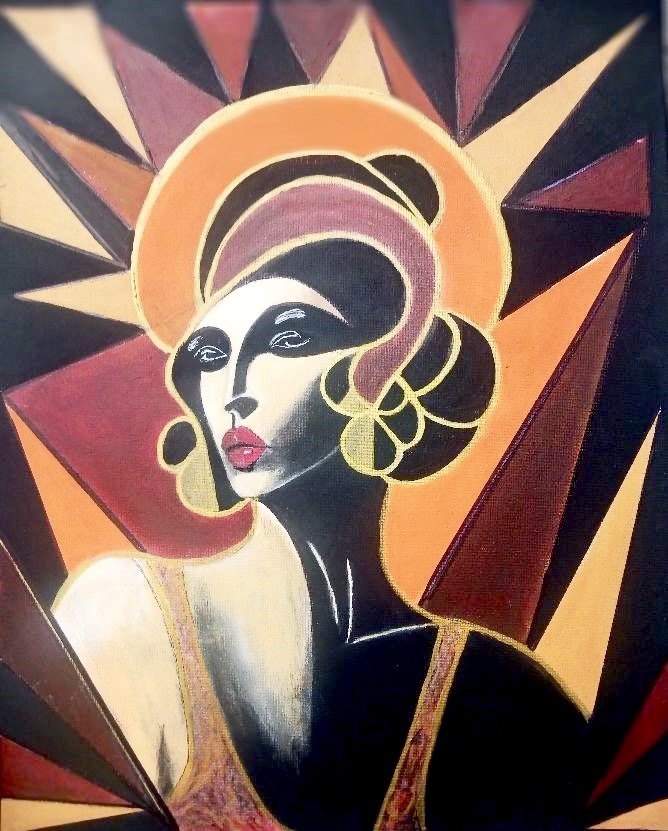 Dot continued to work on her Art Deco lady at home by changing the background from lots of small geometric shapes to larger ones. This has made the lady much more prominent. Lovely use of colours too, very striking.