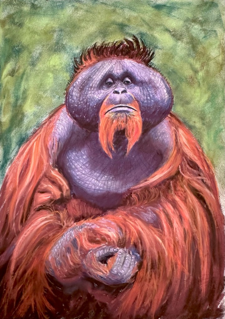 Tracy finished her orangutan pastel picture by adding more gingery colours to the body hair and and taking time on all the wrinkles and highlights on the face flanges. She particularly enjoyed creating the orangutan’s hands and using pipe lagging to soften the greens in the background.