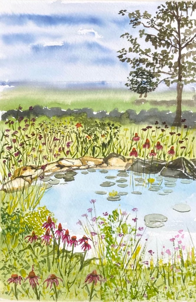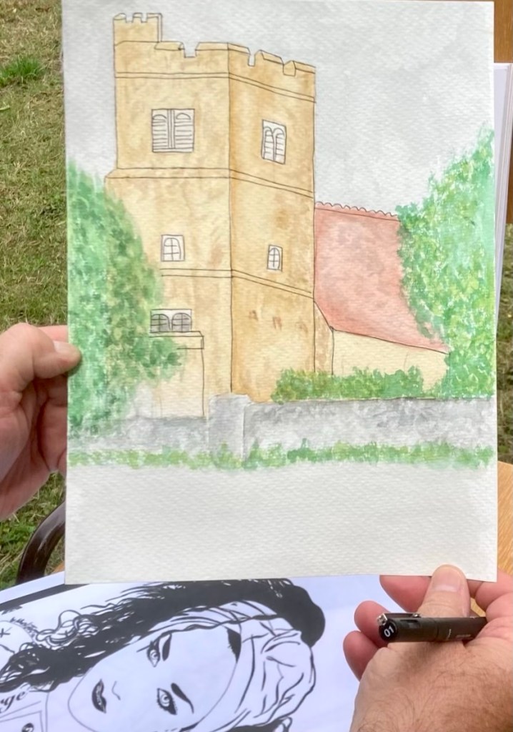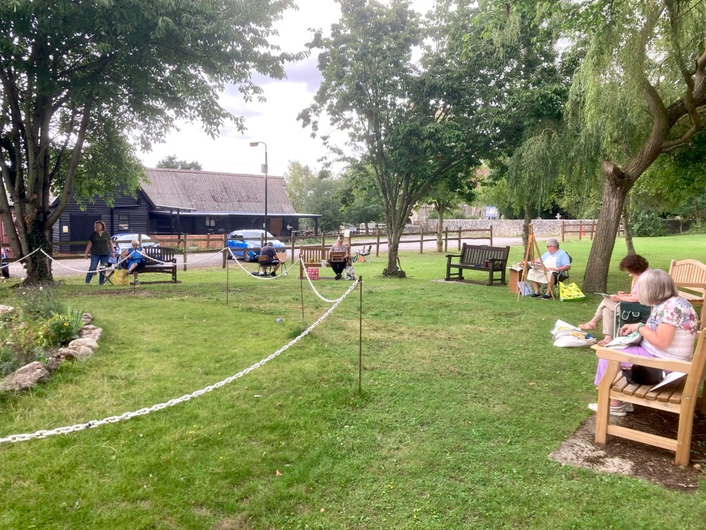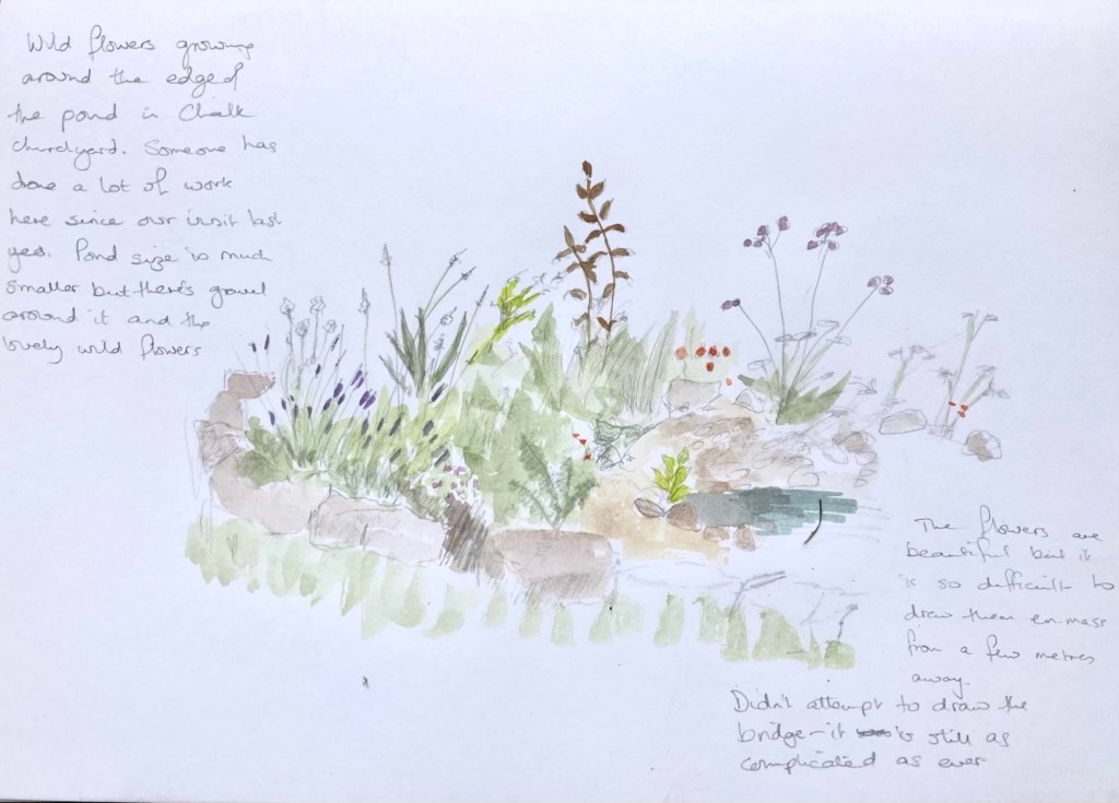 On Saturday 10 members visited Chalk Church for our annual outing there and enjoyed drawing and painting together in the gardens around the pond and Monet bridge. It was cloudy but dry so the artists stayed outside during the day.