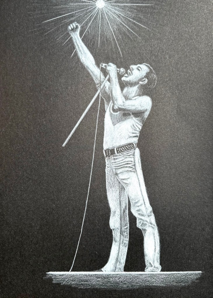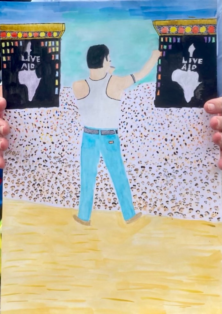For the last Wednesday session the theme was the Live Aid concert of 1985. Tracy drew Freddie Mercury singing under a spotlight in white coloured pencil on black craft paper. She’s pleased as the effect is what she was aiming for.