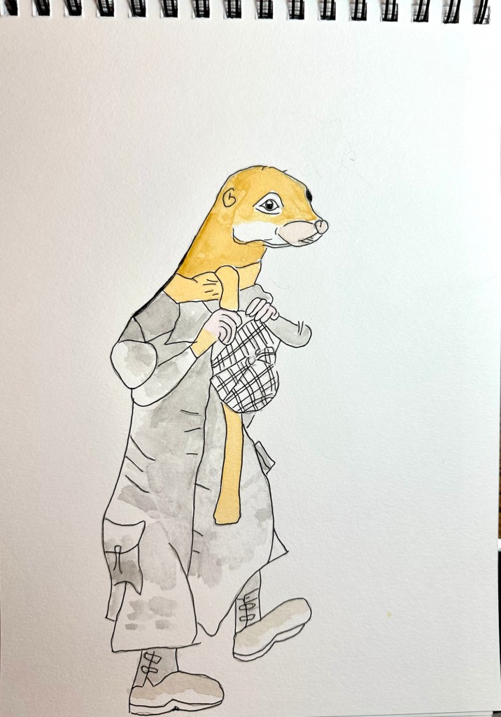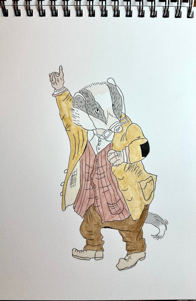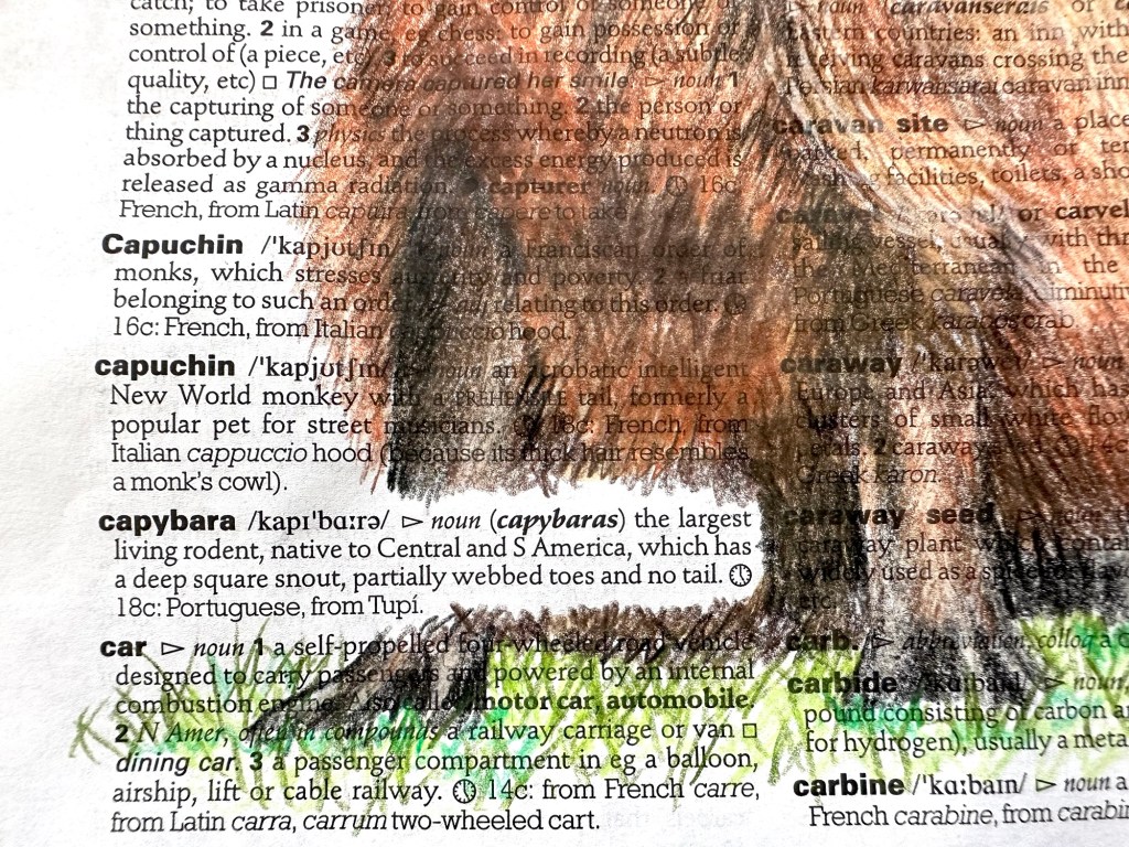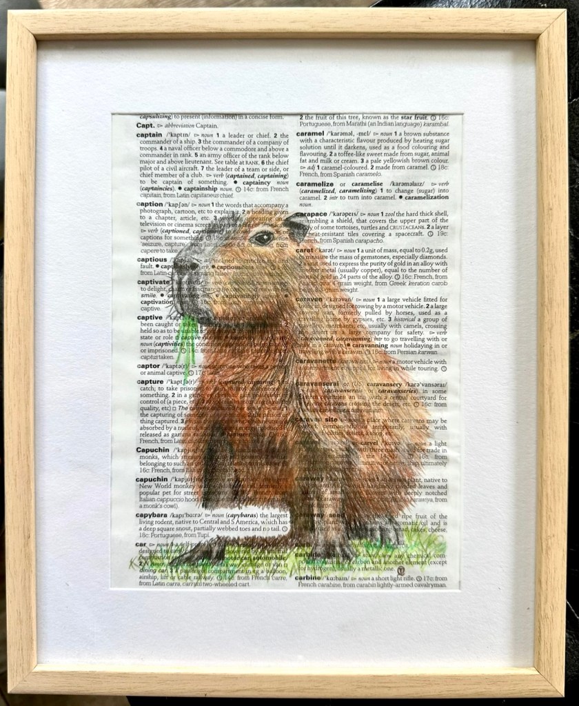 Last year we had a session on drawing and painting on printed paper, including dictionary pages. One of Tracy’s daughters loves capybaras so that page in the dictionary was cut out and finally used this year. Tracy used coloured pencils and very dry watercolours for the capybara and left the dictionary entry of capybara free of colour. Once framed the page was given as a present.