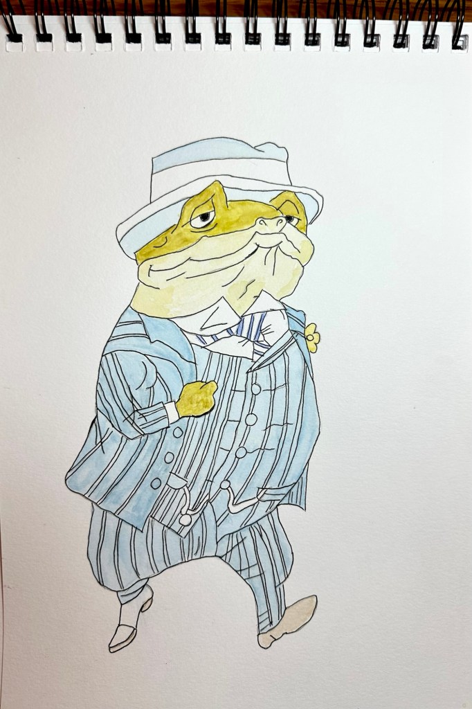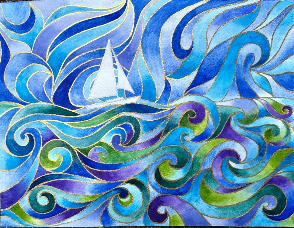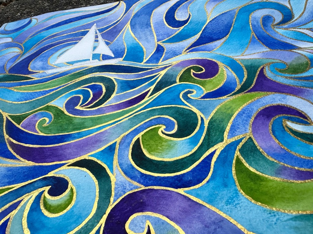 Tracy saw a handmade ceramic plate online of a boat and colourful, curving waves. She painted something similar using watercolours in many shades of blue, green and purple, then outlined all the shapes in gold watercolour paint. The boat’s hull is currently white but she might paint it orange or red or maybe vermillion, as the colour in between the two. Decisions, decisions!