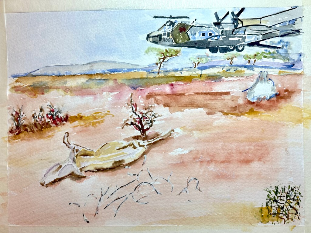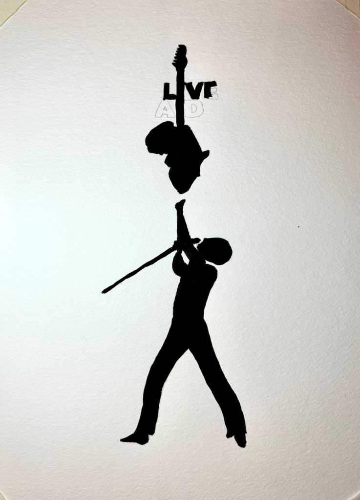 Chris W’s painting of an animal carcass in a barren landscape and an RAF C-130 aeroplane carrying food and supplies is a sombre reminder of the concerts’ aim to raise money for the 1983-5 famine in Ethiopia. £40 million was raised on the day, equivalent to £100 million today.