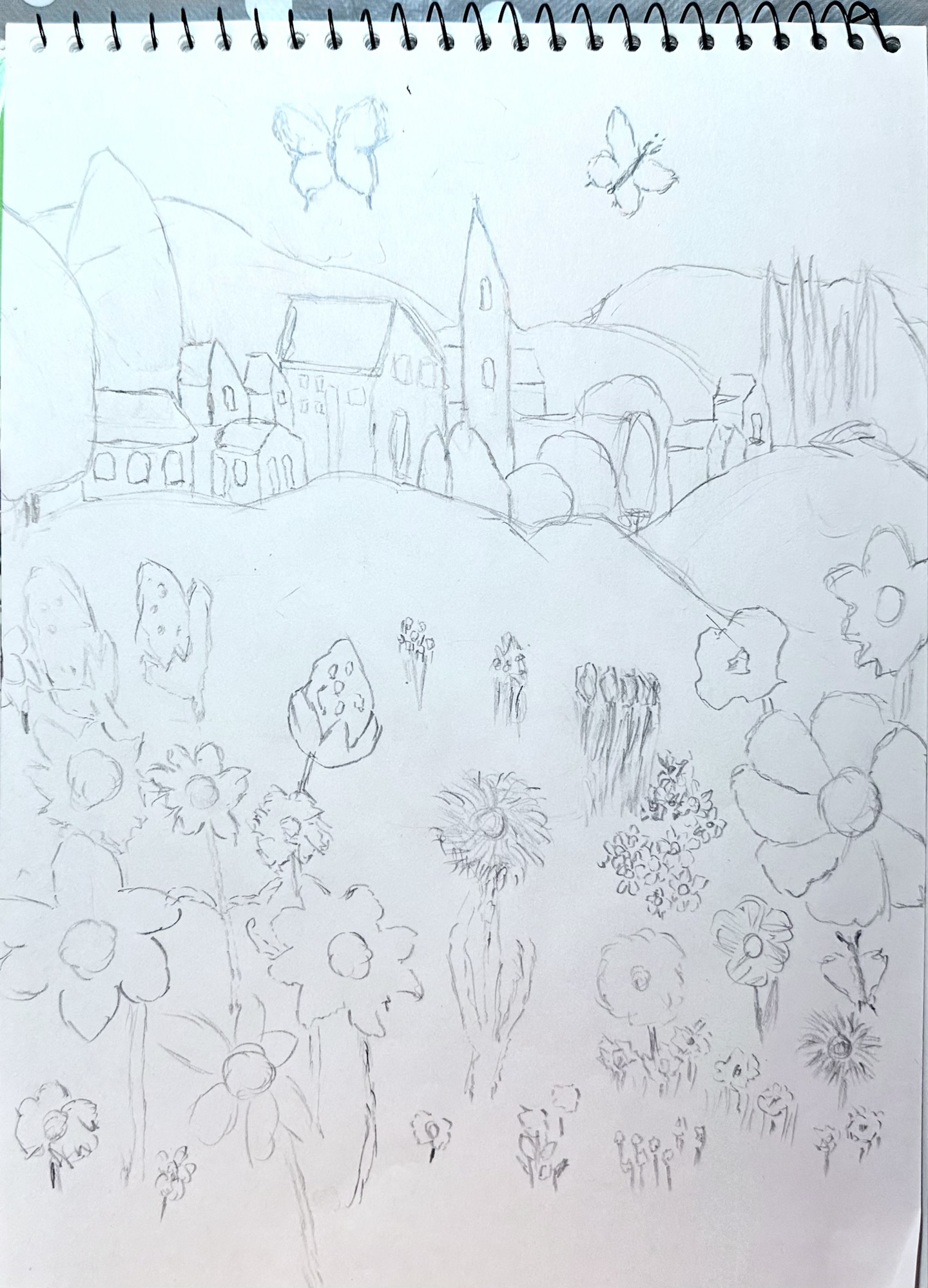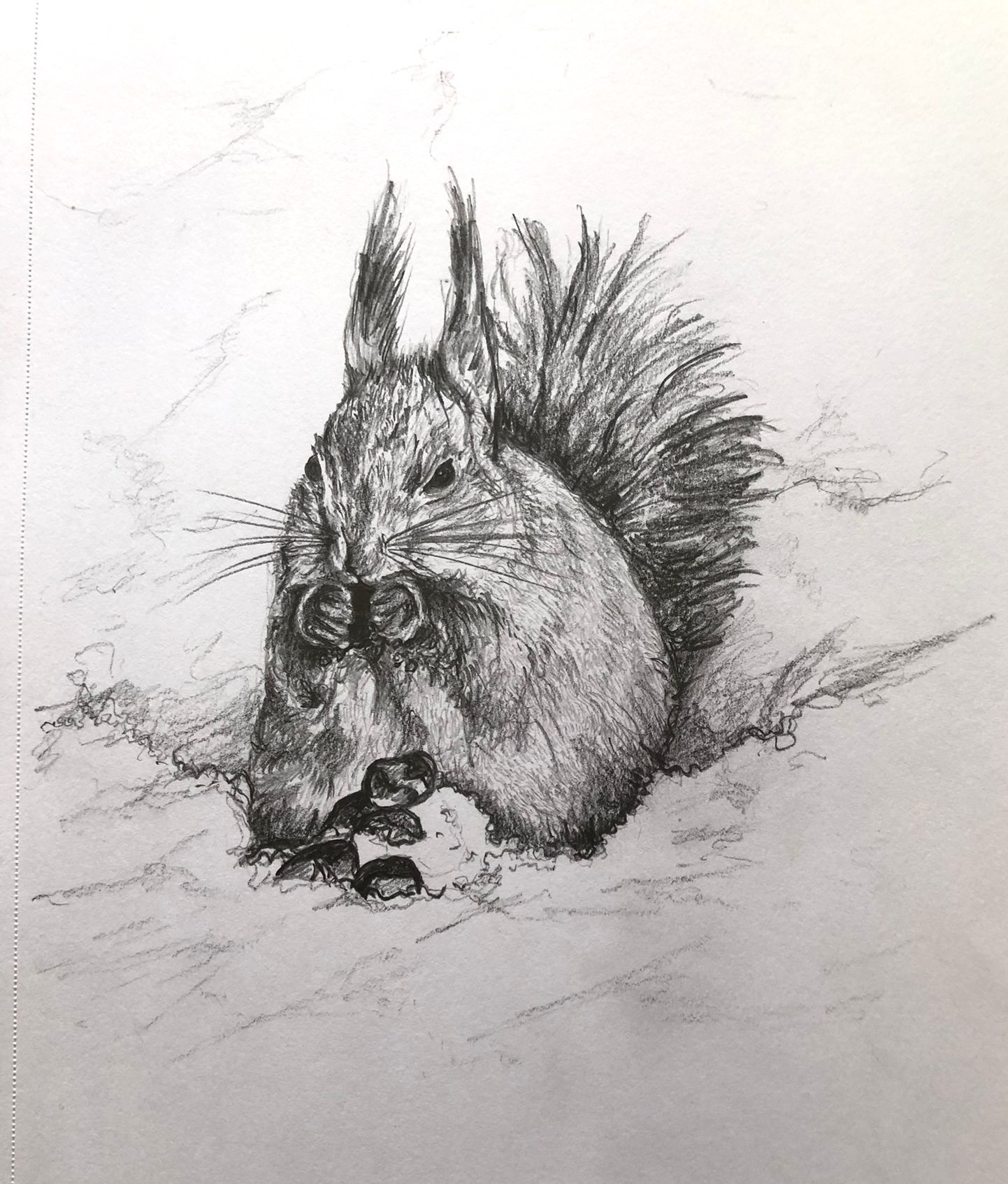 A few pictures are finished and others are works in progress to be completed at home. We used pencils, coloured pencils, watercolour pencils, felt tip pens and watercolours. A beautifully drawn squirrel and a hairless cat called Potato join the pictures.