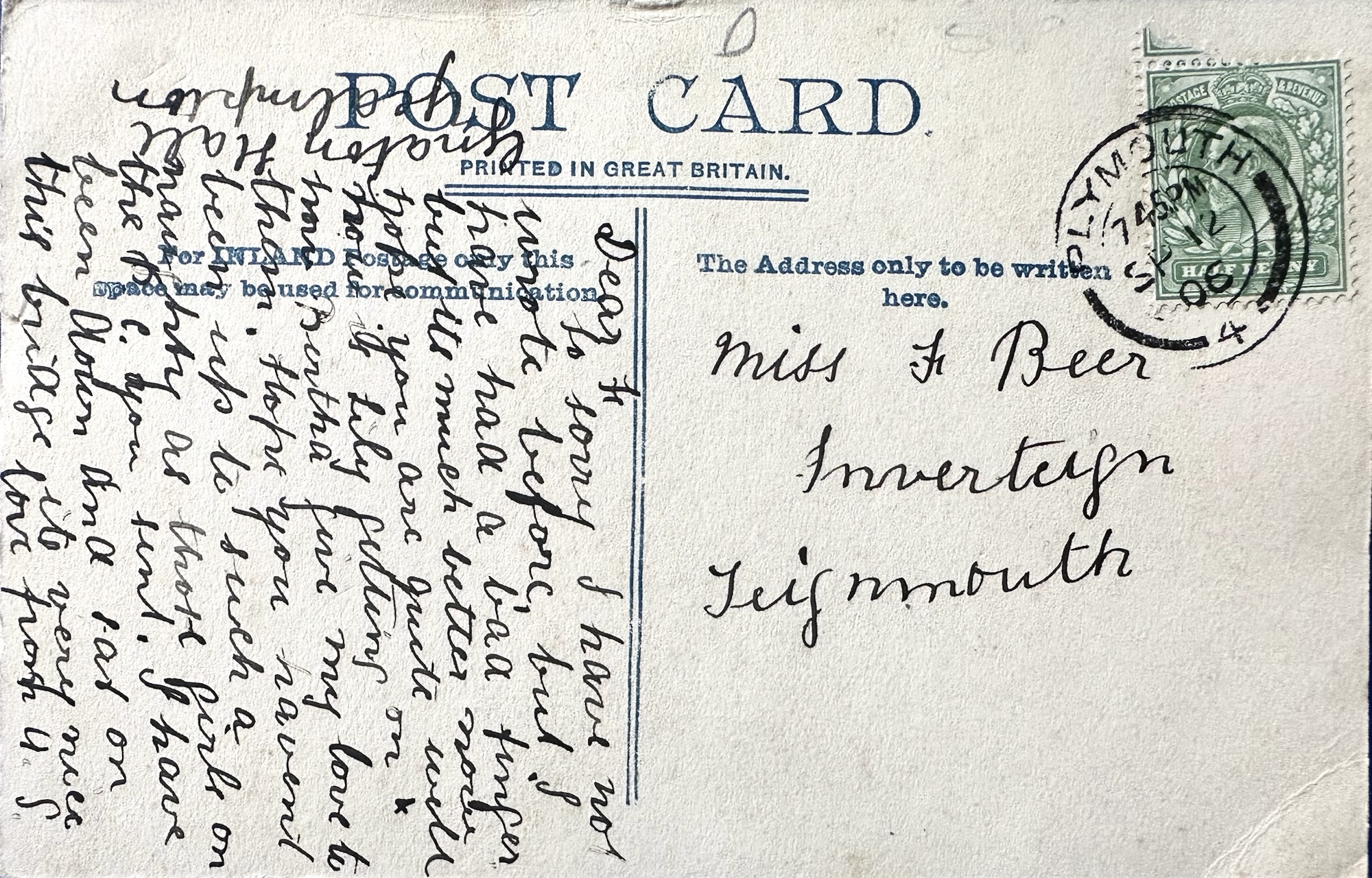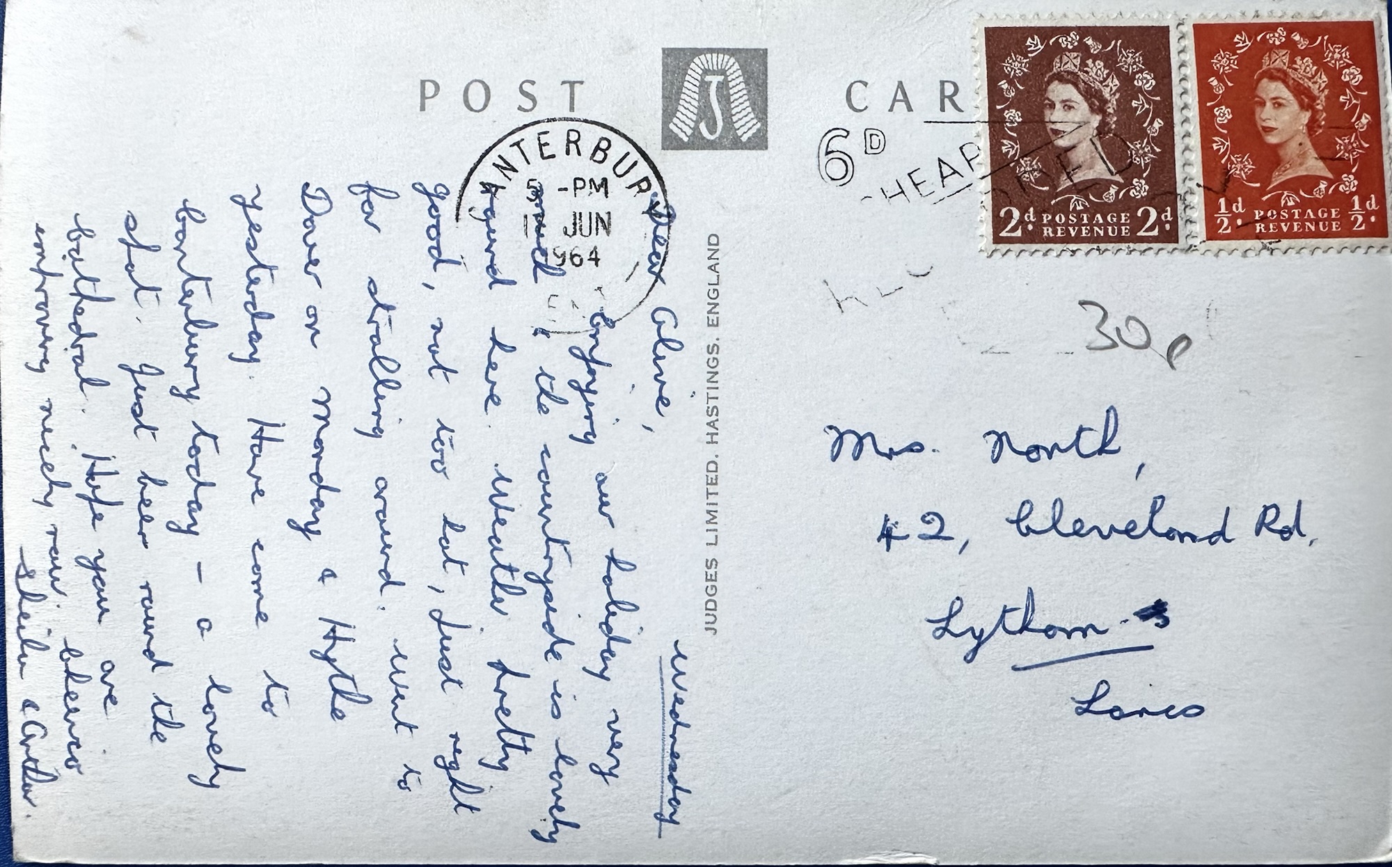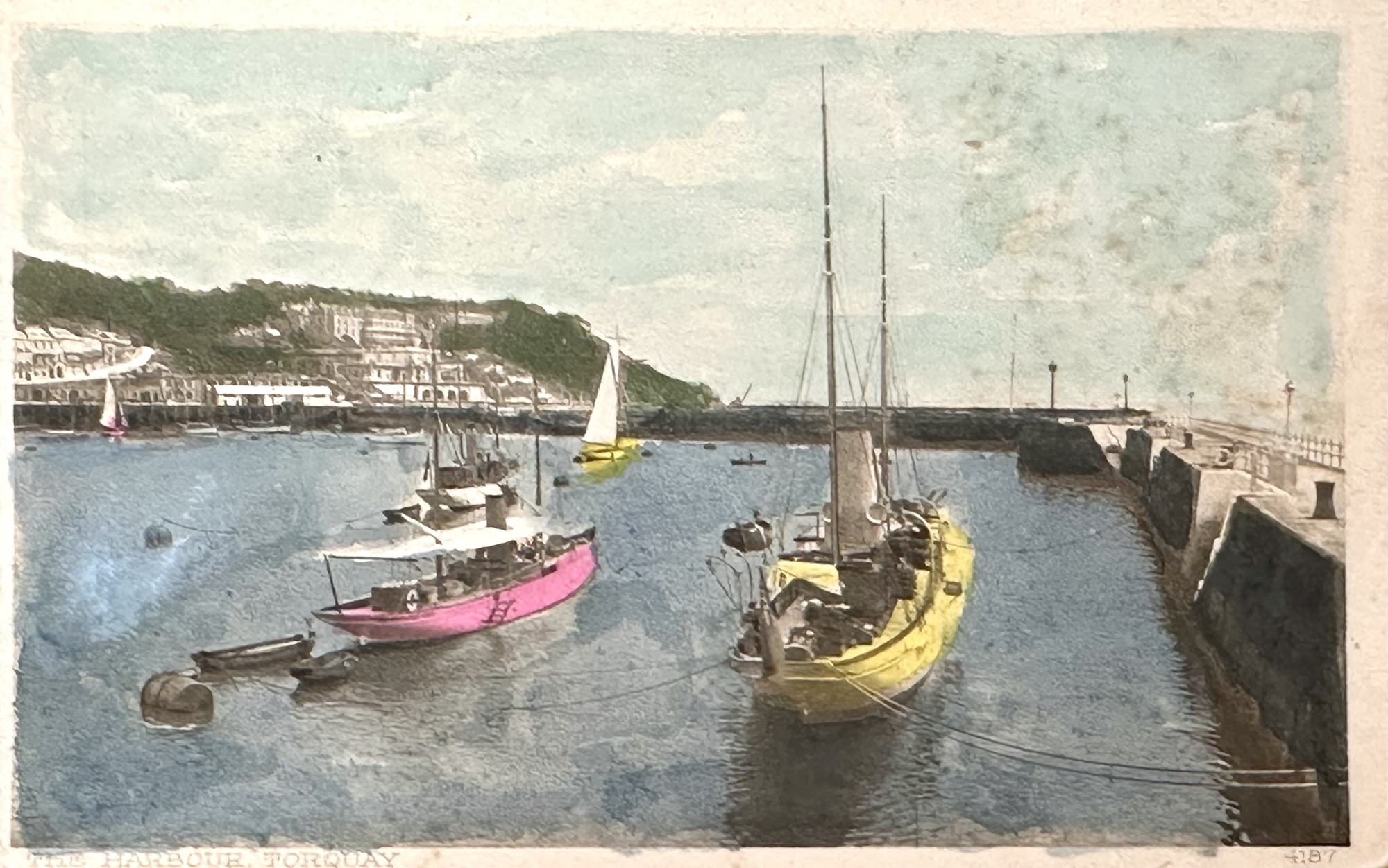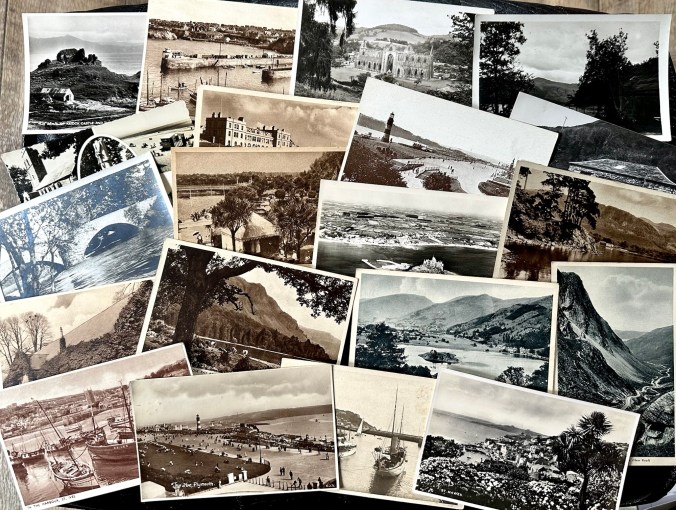 Some of the postcards have been used and still have stamps on from the 1920s, 30s and 40s, with words saying having a lovely time, the weather has been good, or it’s been raining. No different to what we write nowadays!