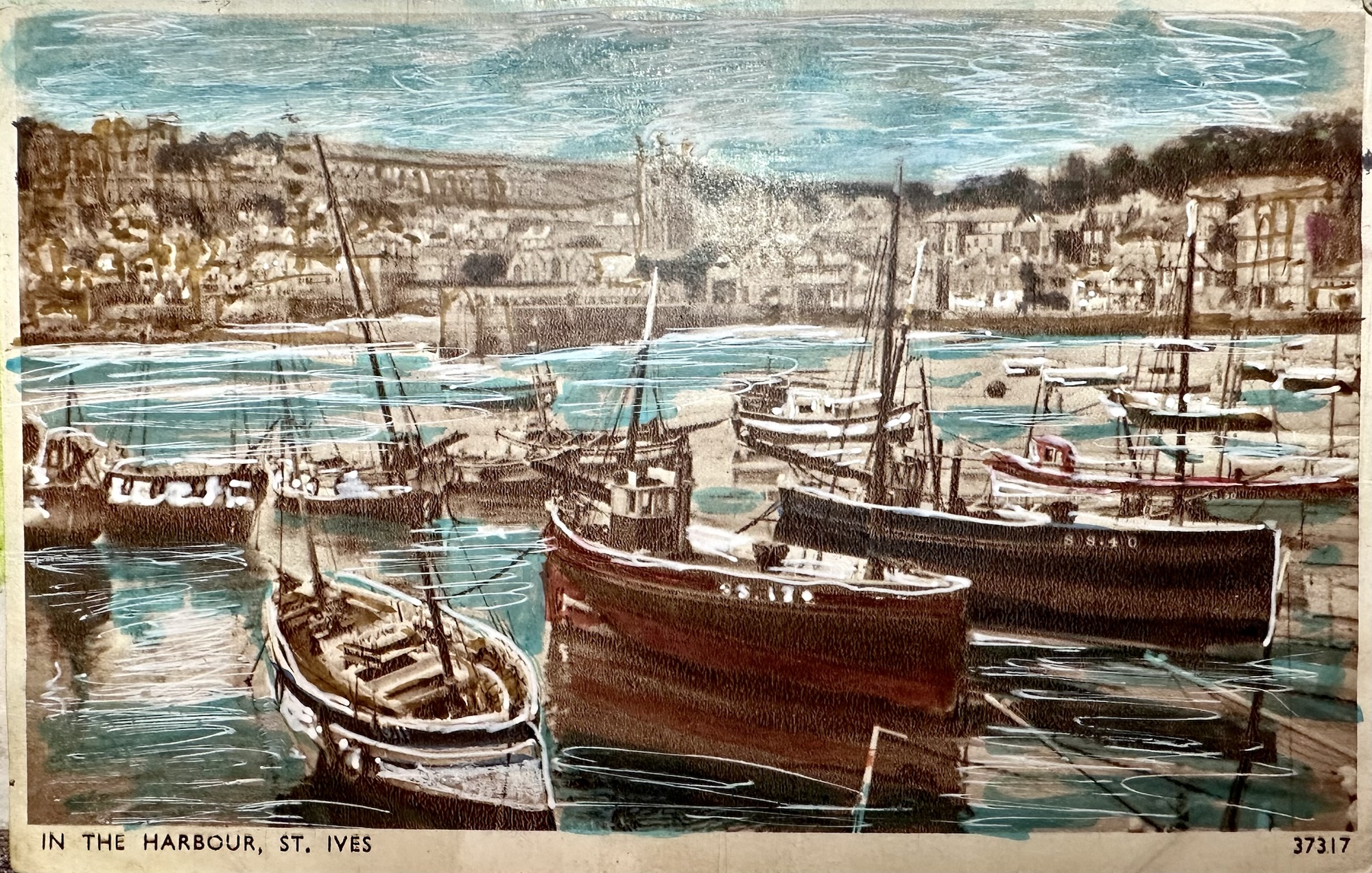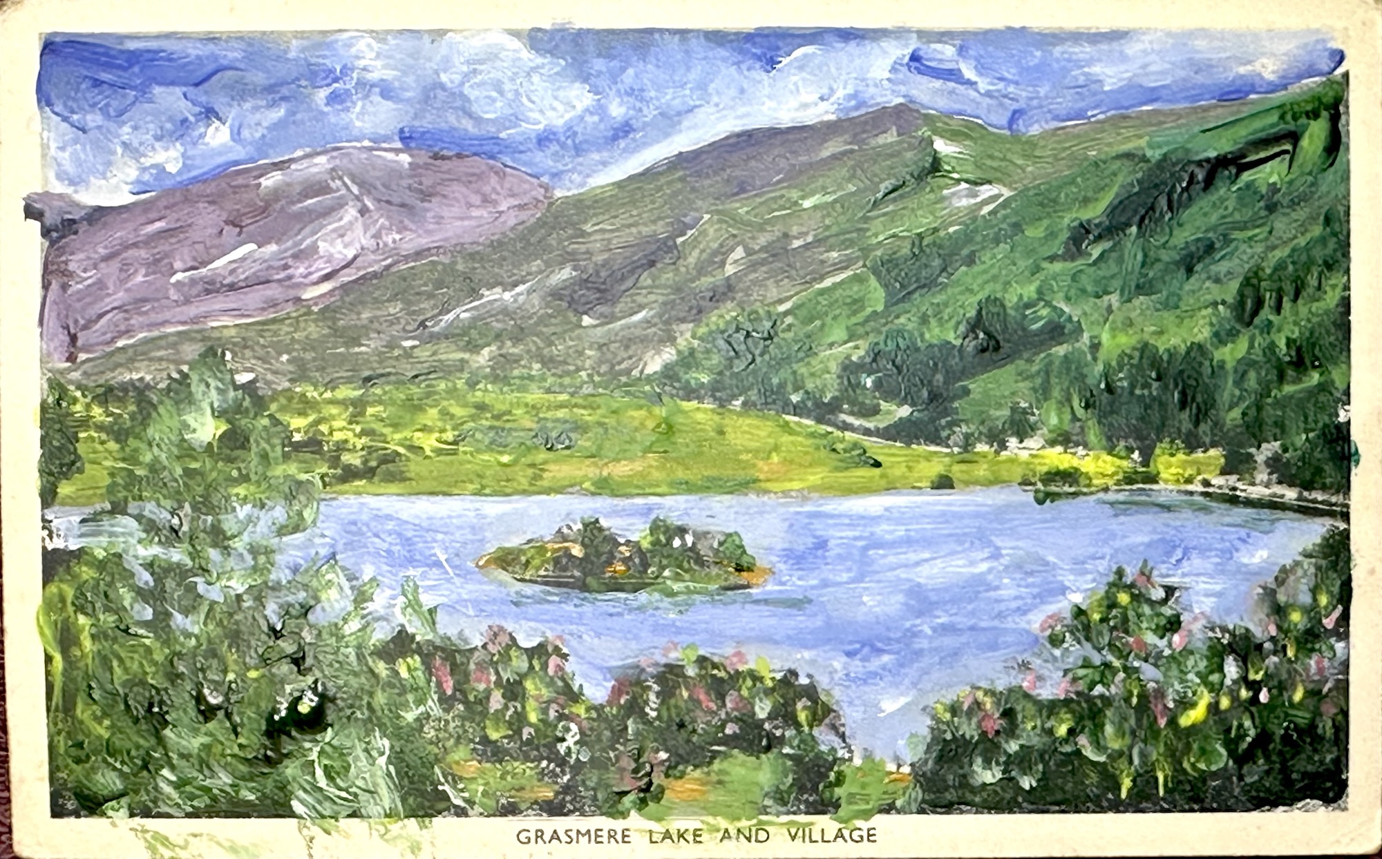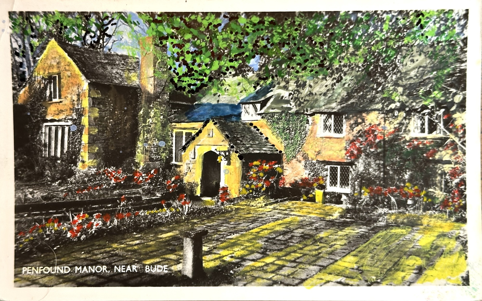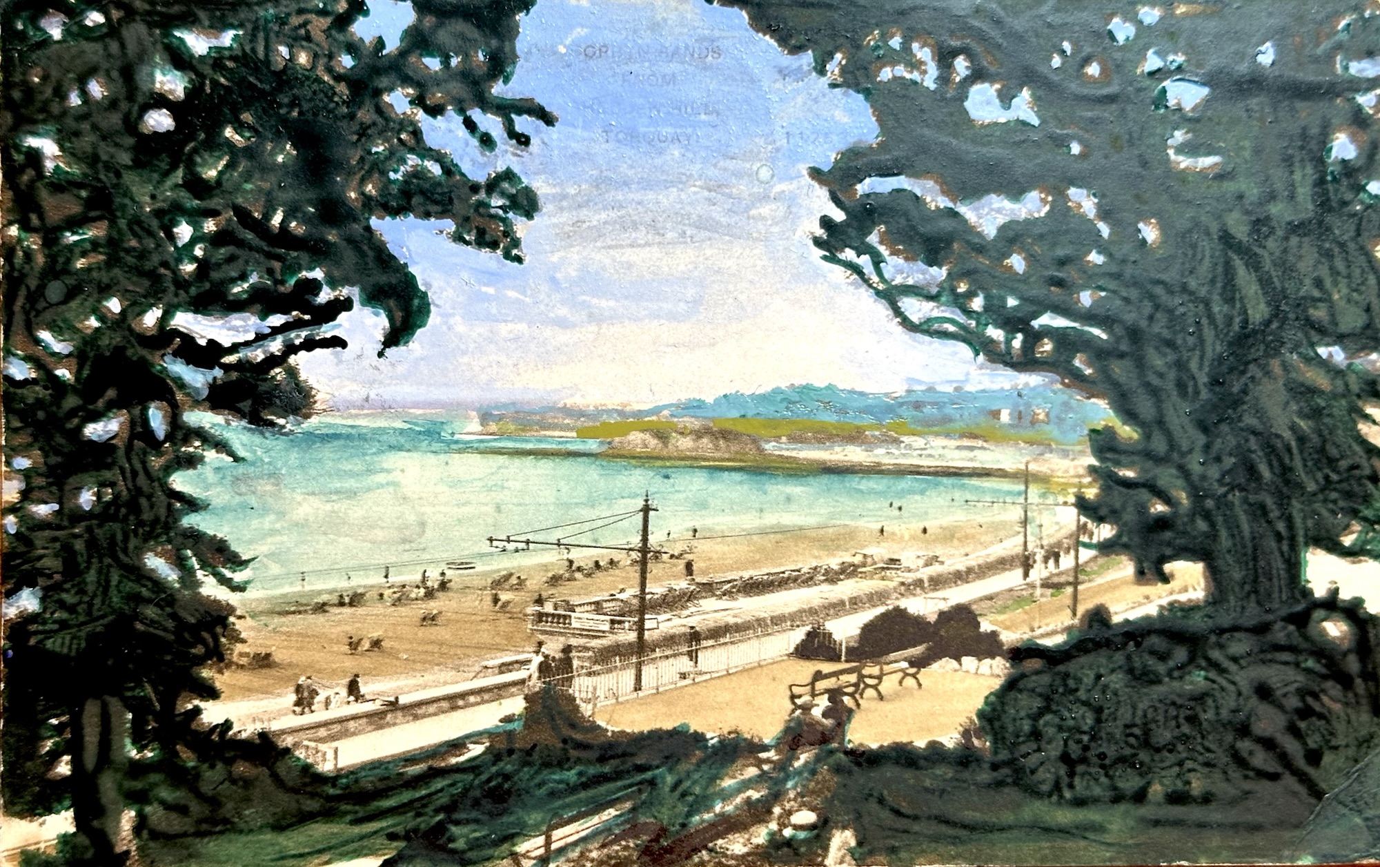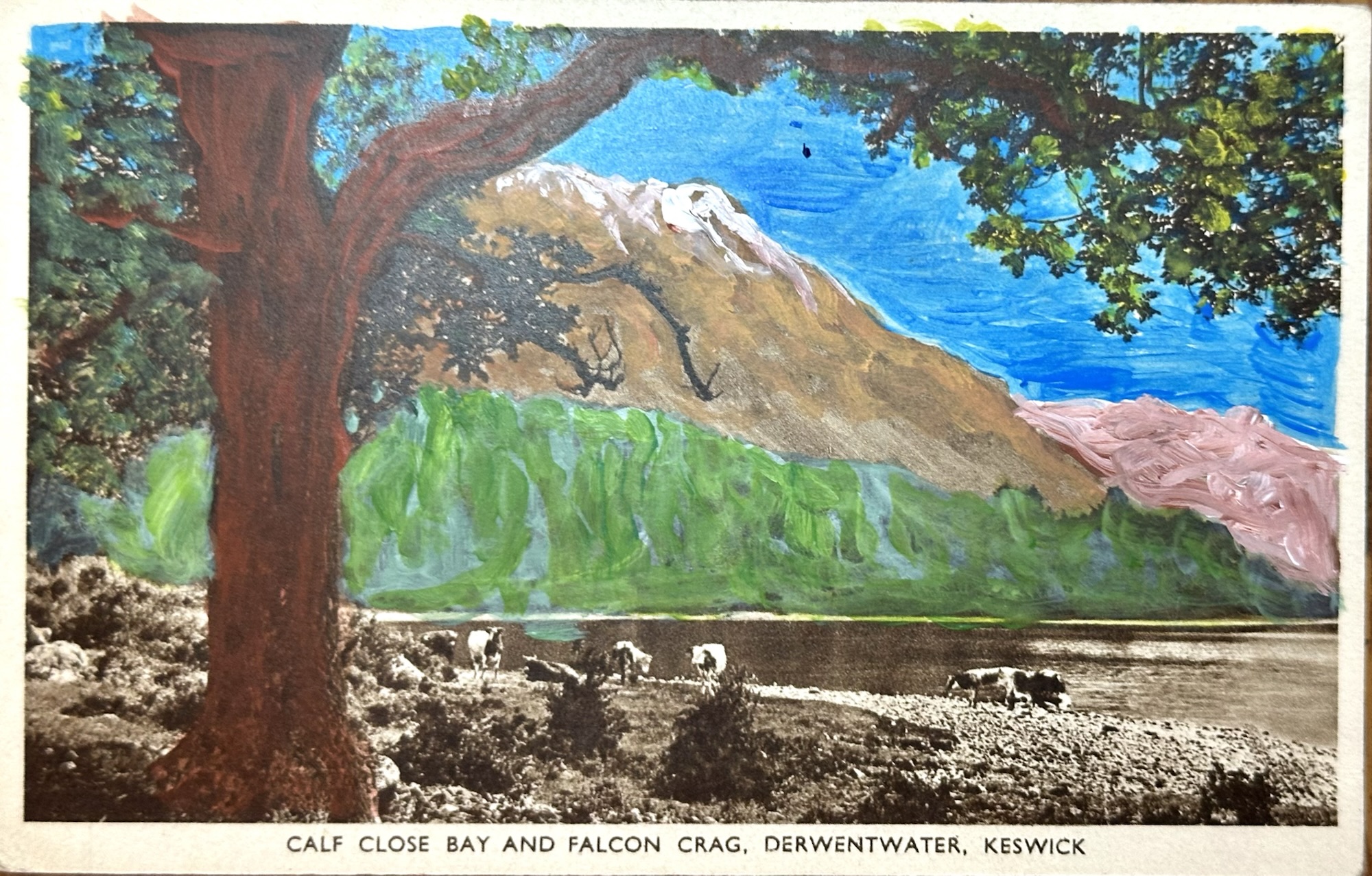 Acrylic paint applied thickly and thinly worked really well to add the colour, as did thick watercolour paint, ink, coloured pencils and felt tip pens. Some of the postcards had been used and the earliest message and stamp dated back to 1908!