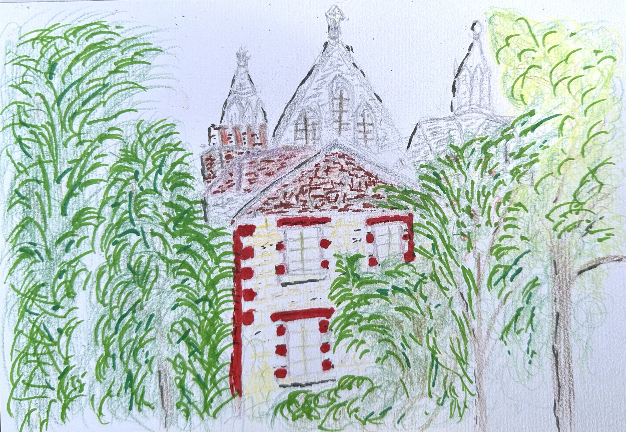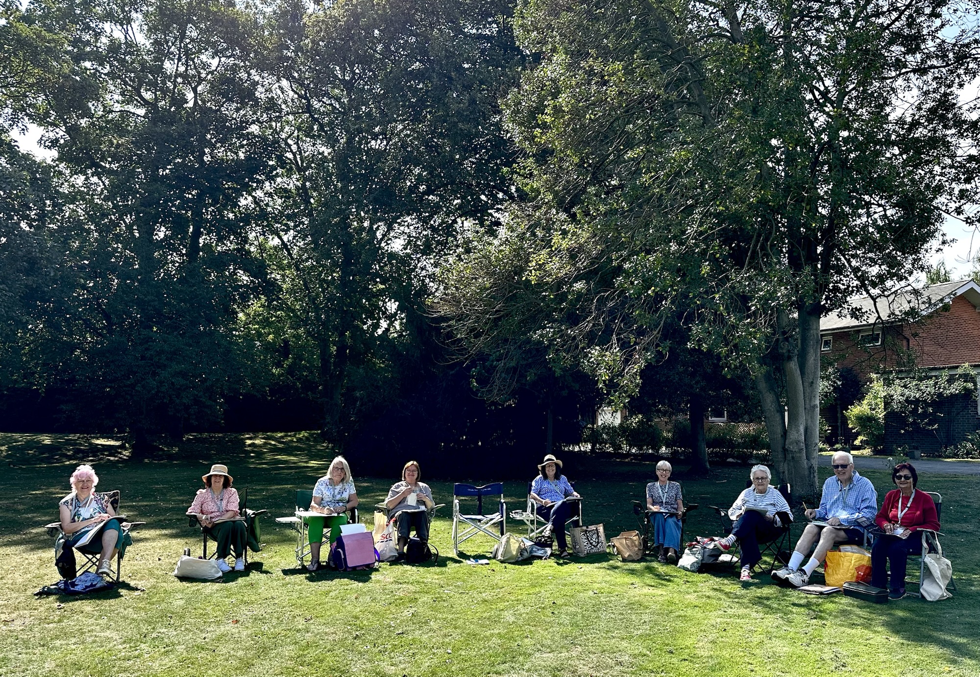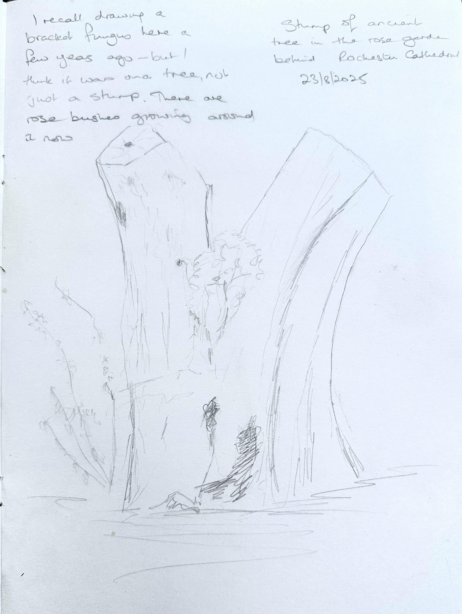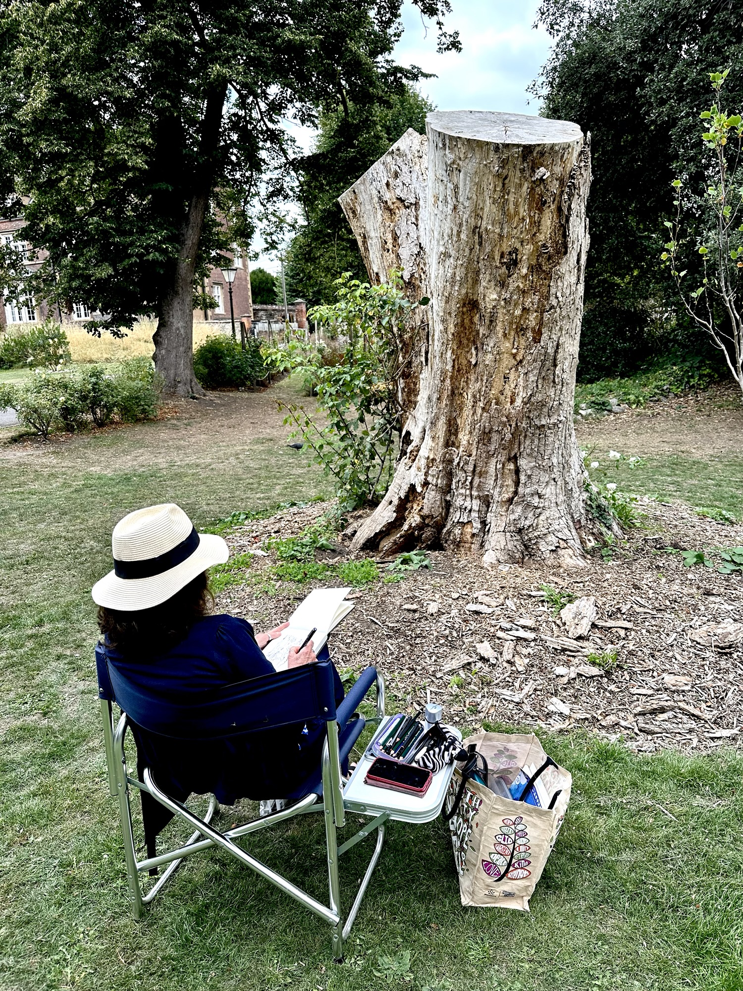 Thank you to Kay who gained permission for the art group to meet in the King’s Orchard, the private gardens behind Rochester Cathedral. Ten members enjoyed sitting in the gardens drawing and painting the rear view of the cathedral and the stump of a 250 year old sycamore was interesting with insects flying around and into the tiny holes in its trunk. The day was due to be dry but overcast so we were pleased that the sun came out for most of the day and it was lovely and warm. We had a whip round and the cathedral will gain £72.50 including Gift Aid.