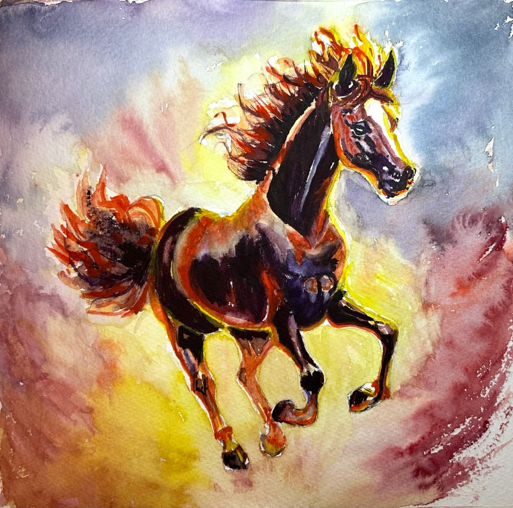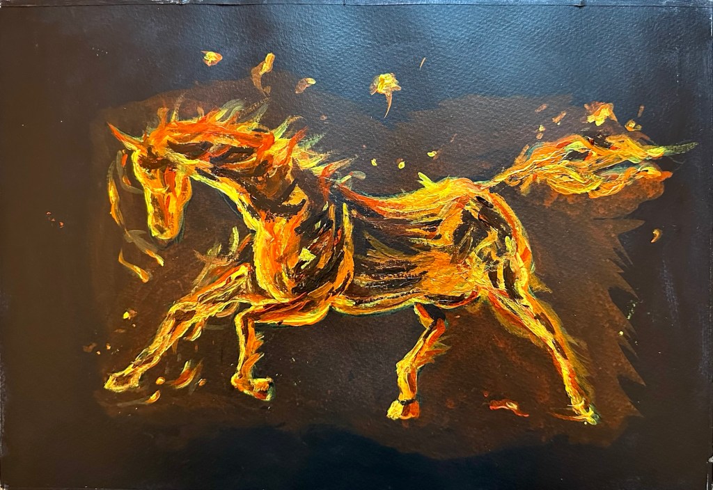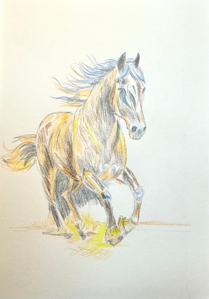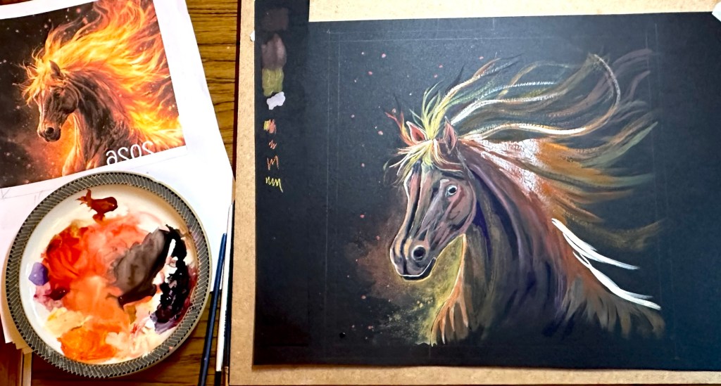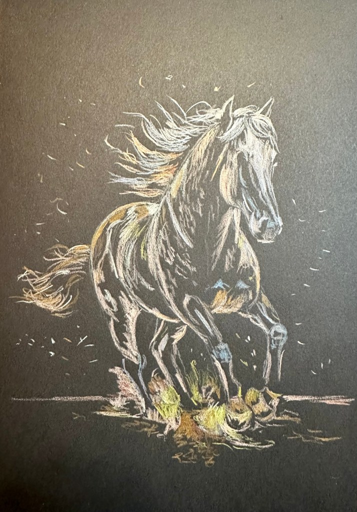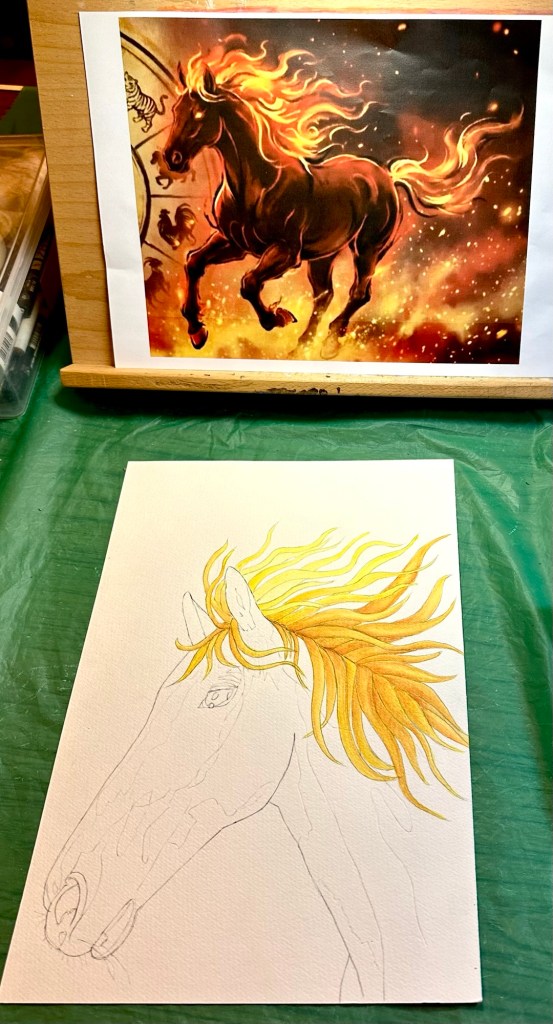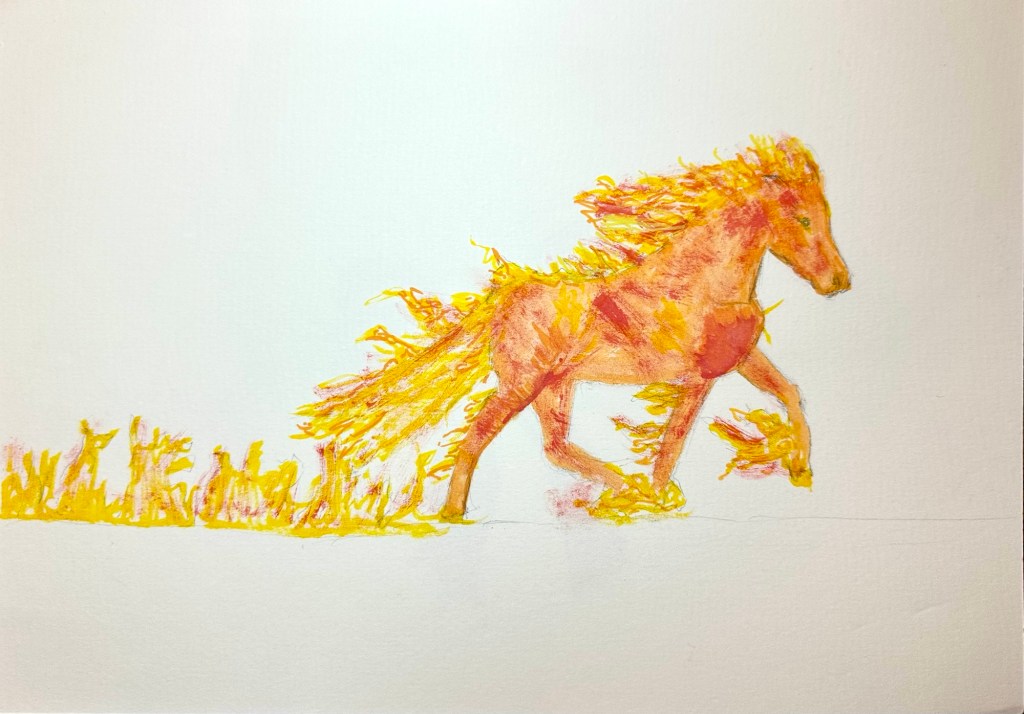 The subject was popular and it was challenging to draw and paint not only a horse, but fire too. We used coloured pencils, pastel pencils, watercolours and acrylics to achieve the depth of colour needed for the flames. Most are works in progress. When finished, please bring them along to the next session.