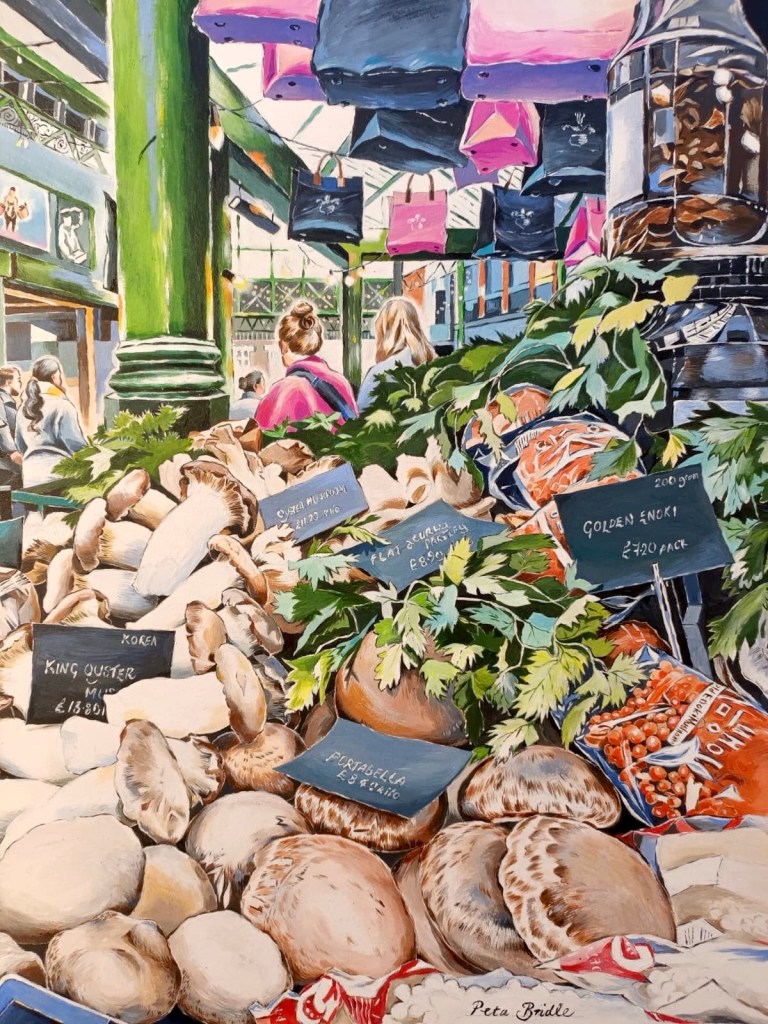 The second, of a turnip stall in Borough Market, also Southwark, with the vegetables looking real. One could reach out and touch the feathery mushroom caps on and smell the herbs.
