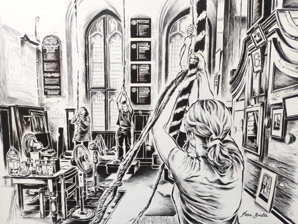 Peta has finished two more of her amazing pictures. The first, of bellringers in Southwark, London, is painted with ink and shows intricate details and has great depth of field.