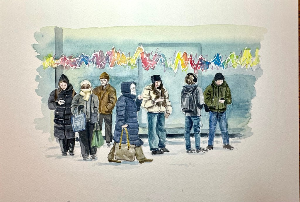 People in Winter was painted in watercolours, with the colourful sound waves above the people being listened to by the young lad in headphones. What a clever idea!