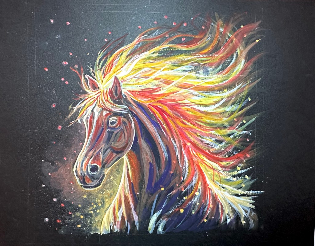 Jackie has finished three paintings from previous sessions. The Year of the Fire Horse picture was painted in acrylics with several layers of paint being used on black paper, giving a great impression of the heat and brightness of fire.