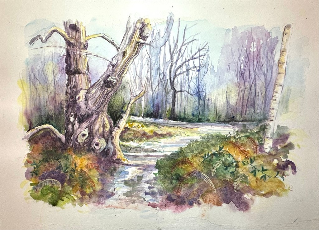 Jackie sketched this wintery landscape at Shorne Country Park then painted it in watercolours. With a great depth of field, one could walk straight into this landscape and follow the meandering path deeper into the woods.