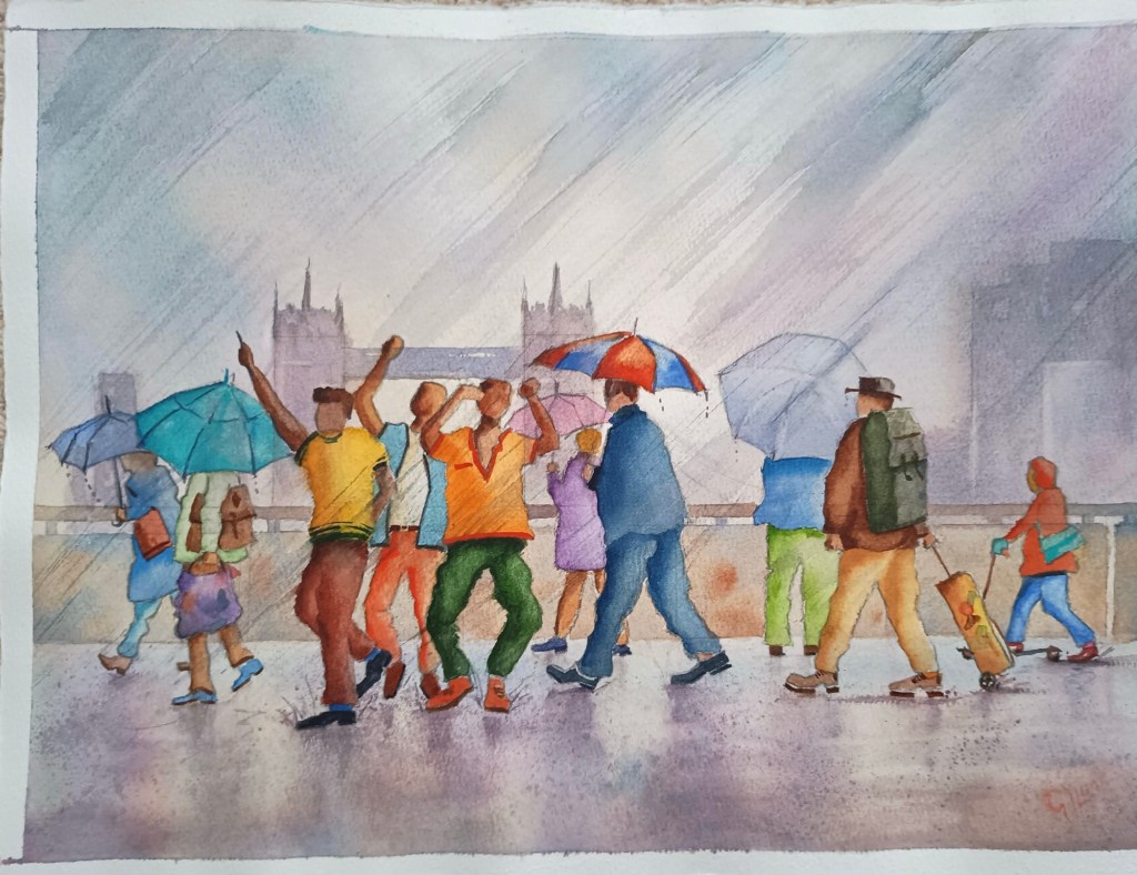 Graham started this watercolour picture during a recent session and had fun painting it. Whilst rain teems down and the background is London Bridge on a dull, wet day, the colourfully dressed, exuberant dancers enjoy the rain whilst others rush past with their brollies. It’s called ‘Summer Rain’.