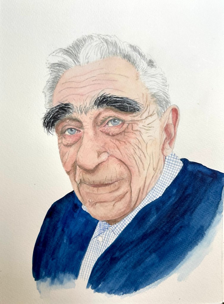 Tracy used watercolours for her portrait of Tony Hawkins MBE. He joined the RNLI Dover lifeboat in 1960 aged 16, was involved in nearly 500 callouts and in total worked and volunteered for the RNLI for an amazing 65 years. Tracy saw Tony’s obituary in the RNLI magazine last year and wanted to paint his lined, weather-worn face and wonderful eyebrows.